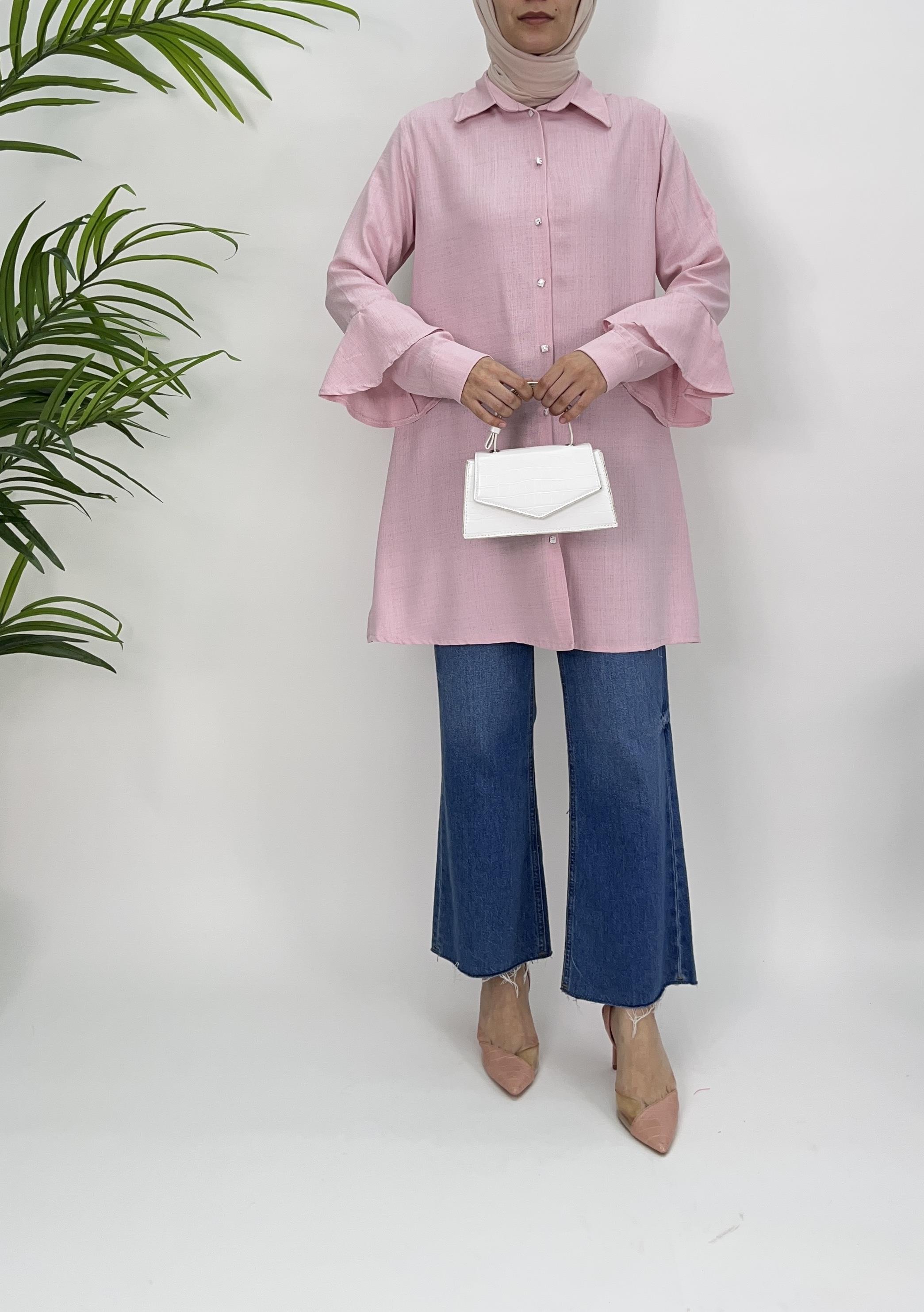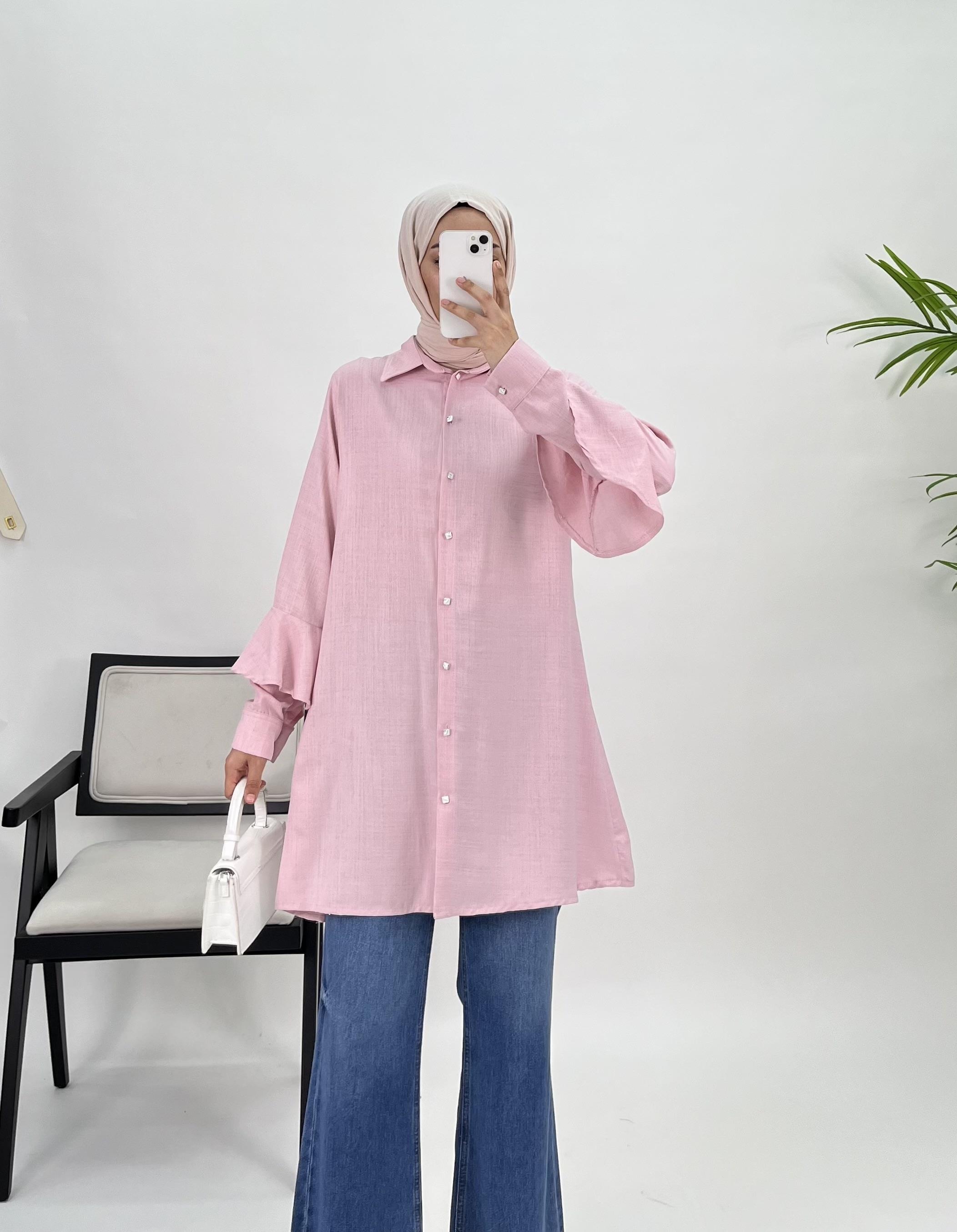 8267-flamlı keten kumaş-kol ucu katkatlı tunik-pembe (8267)