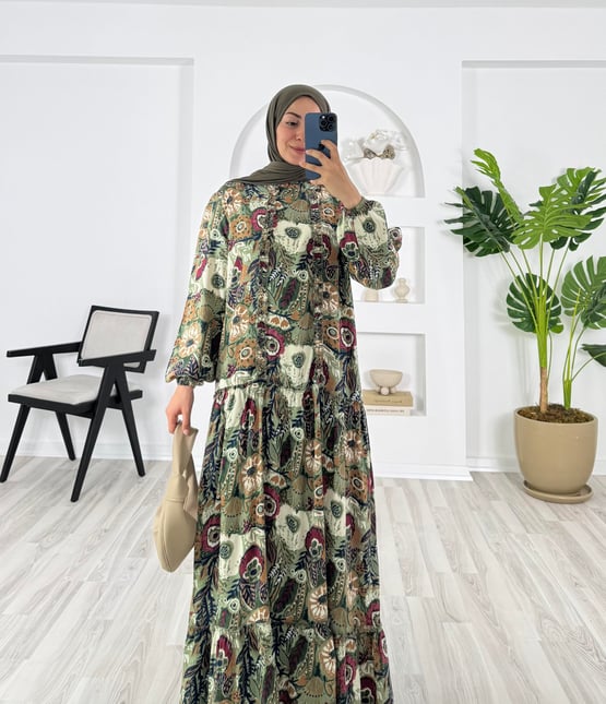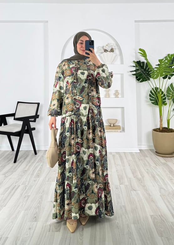 8268-pamuk viskon kumaş-etnik desenli etek altı fırfırlı elbise-yeşil (8268)