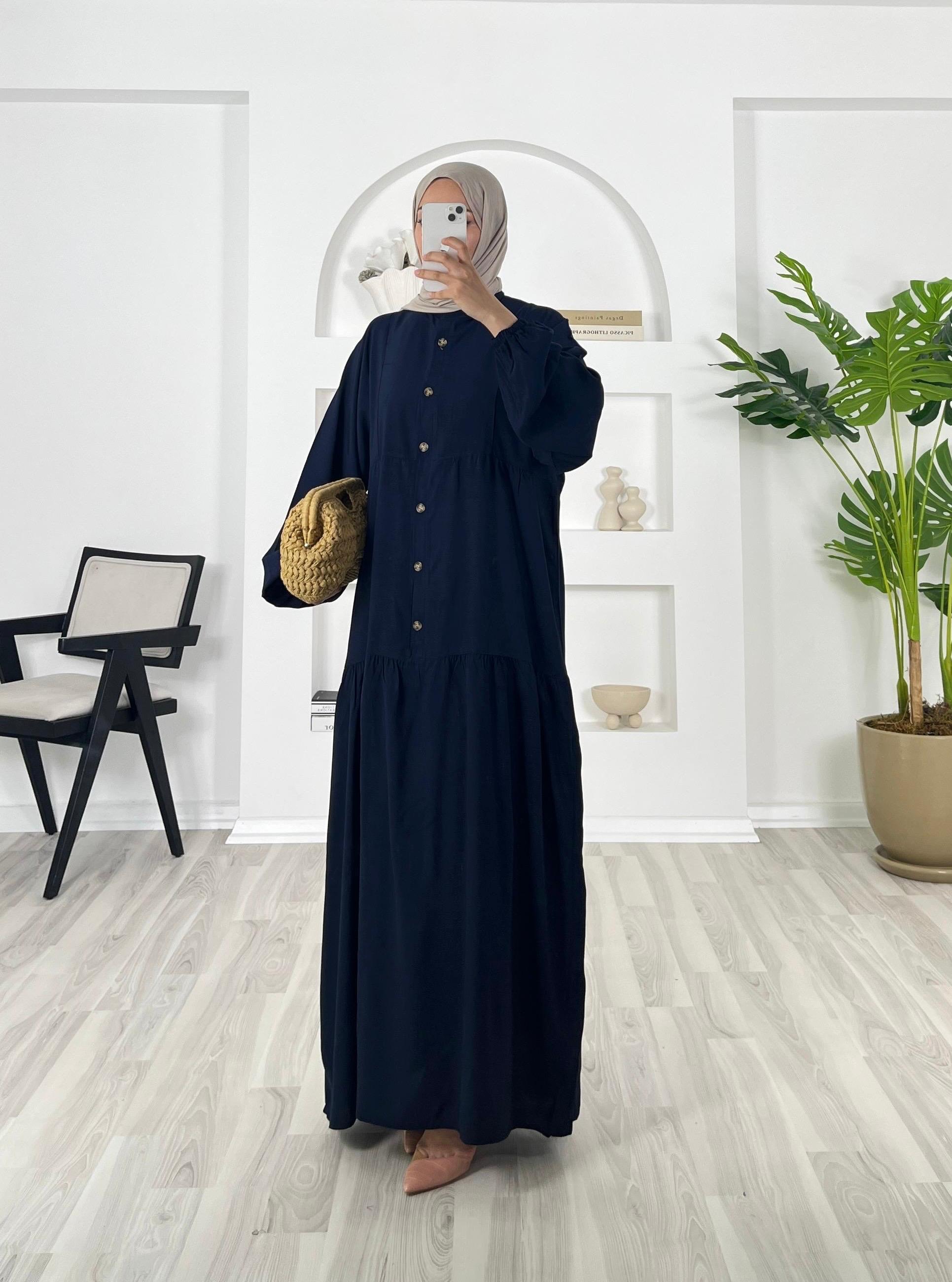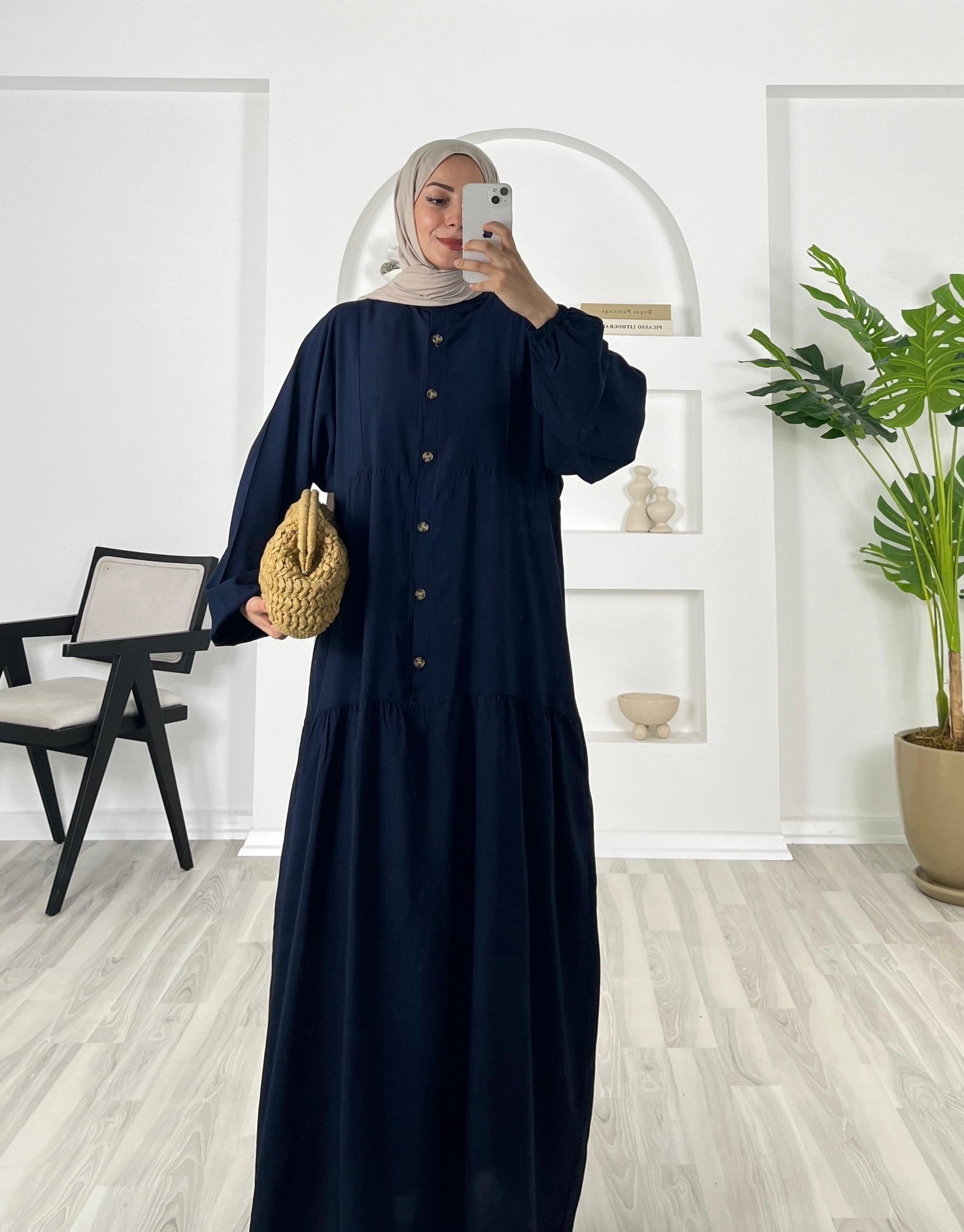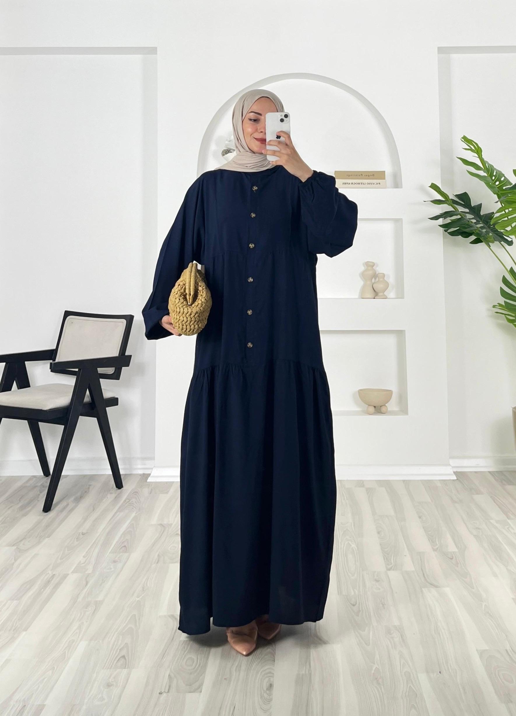 8322-pamuk viskon kumaş-yarım düğmeli etek altı düz elbise-lacivert (8322)