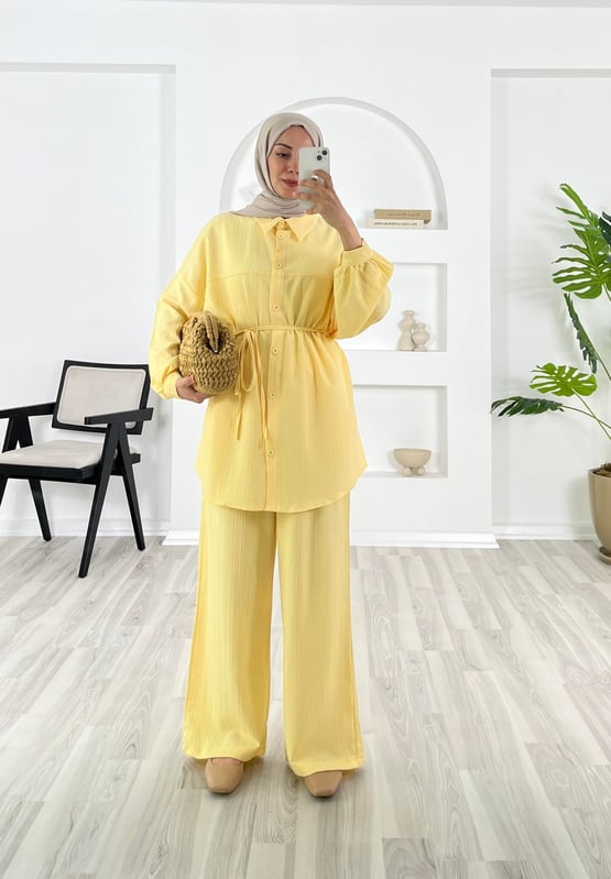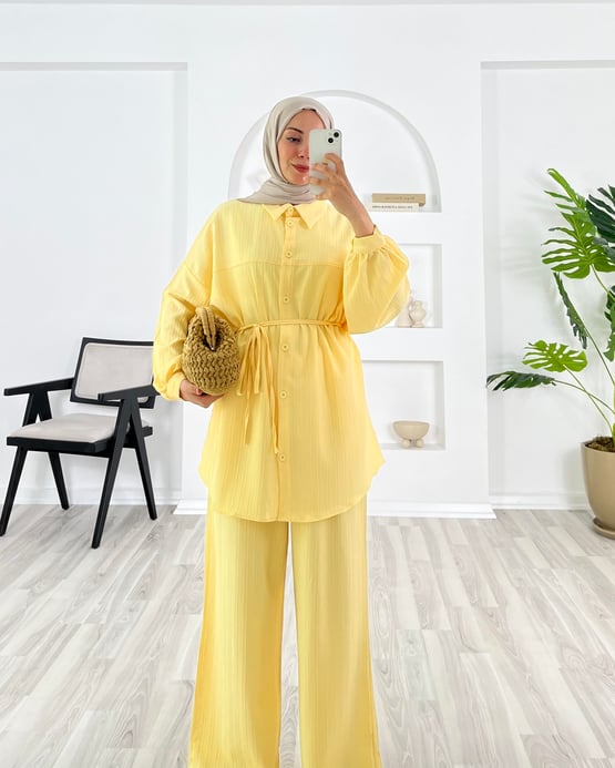 8405-dubai kumaş-seyyar kemerli pantolonlu takım-sarı (8405)