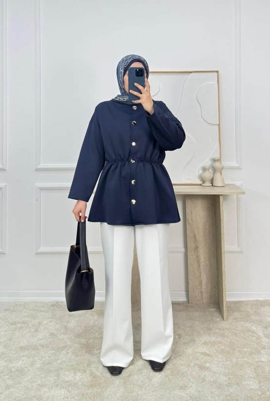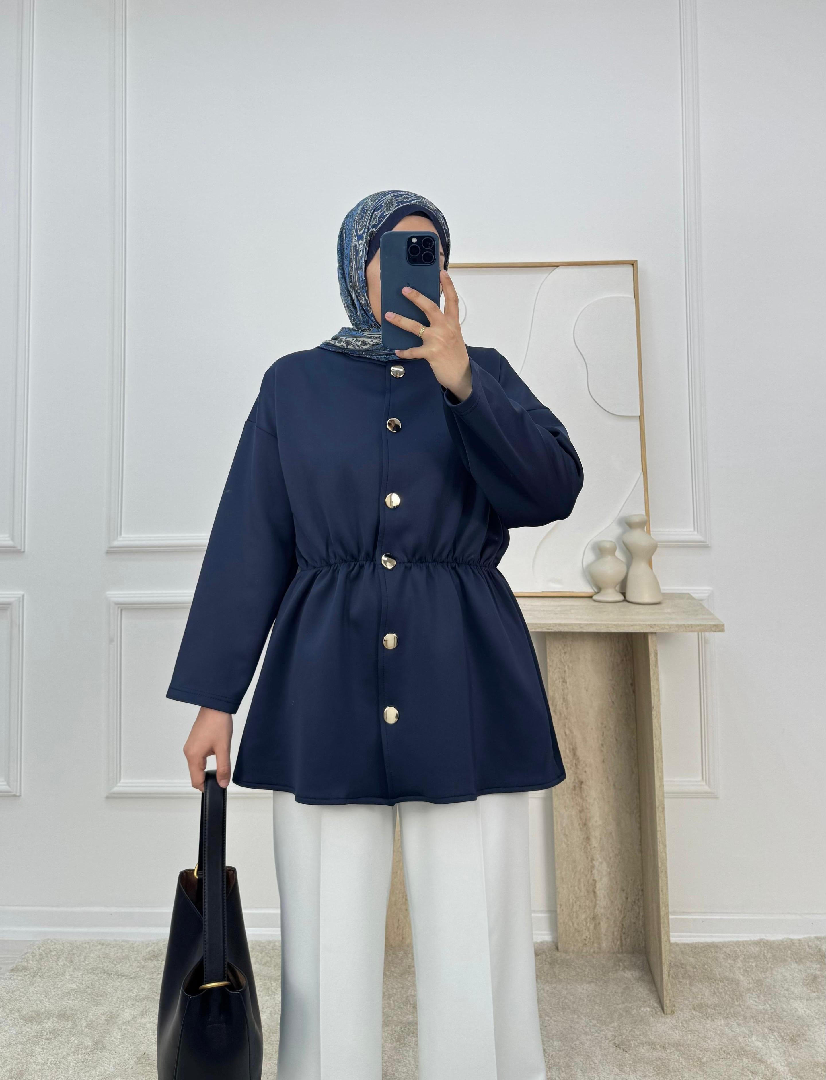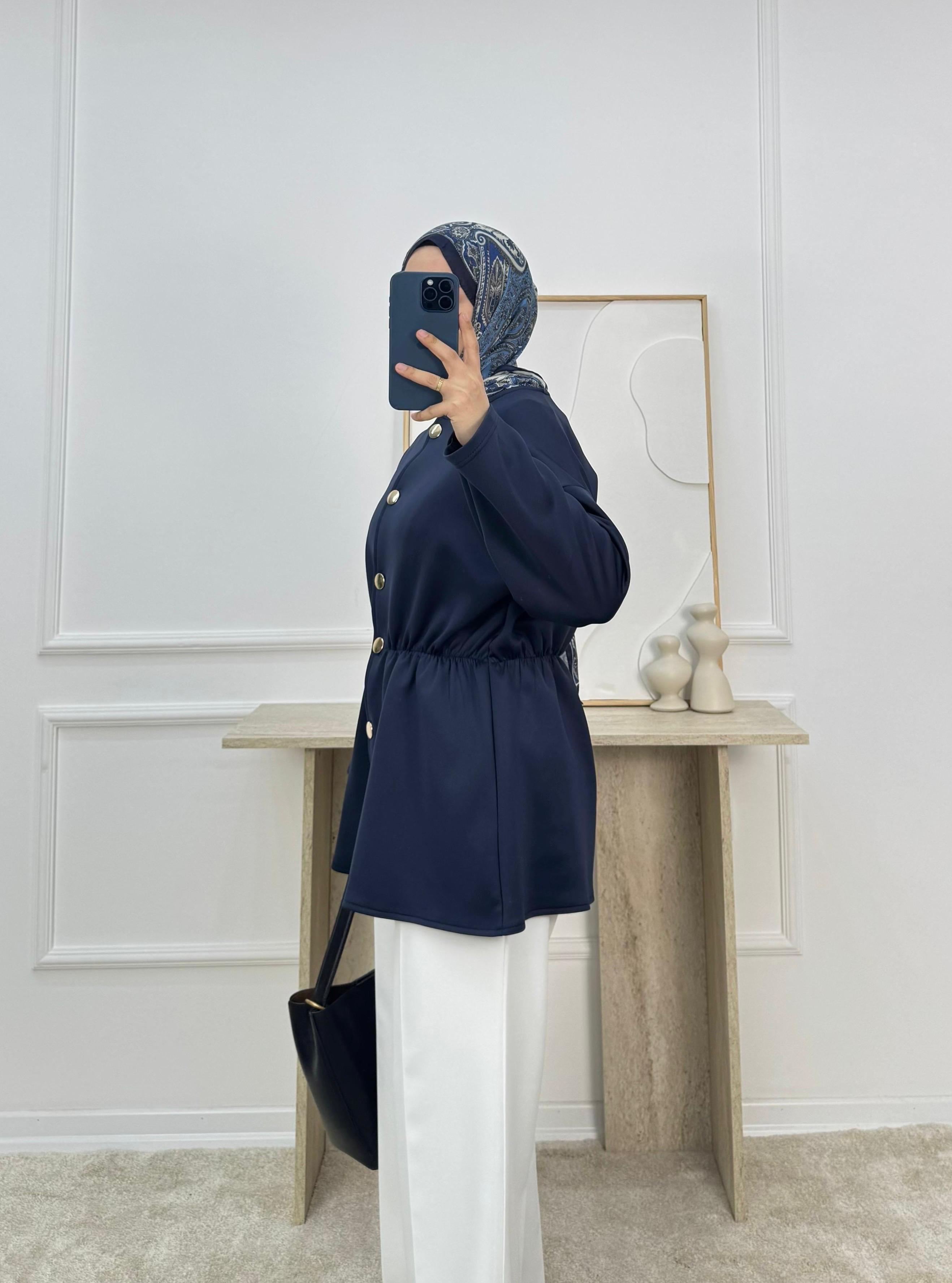 8426-sukuba dalgıç kumaş beli lastikli düğmeli tunik-lacivert (8426)