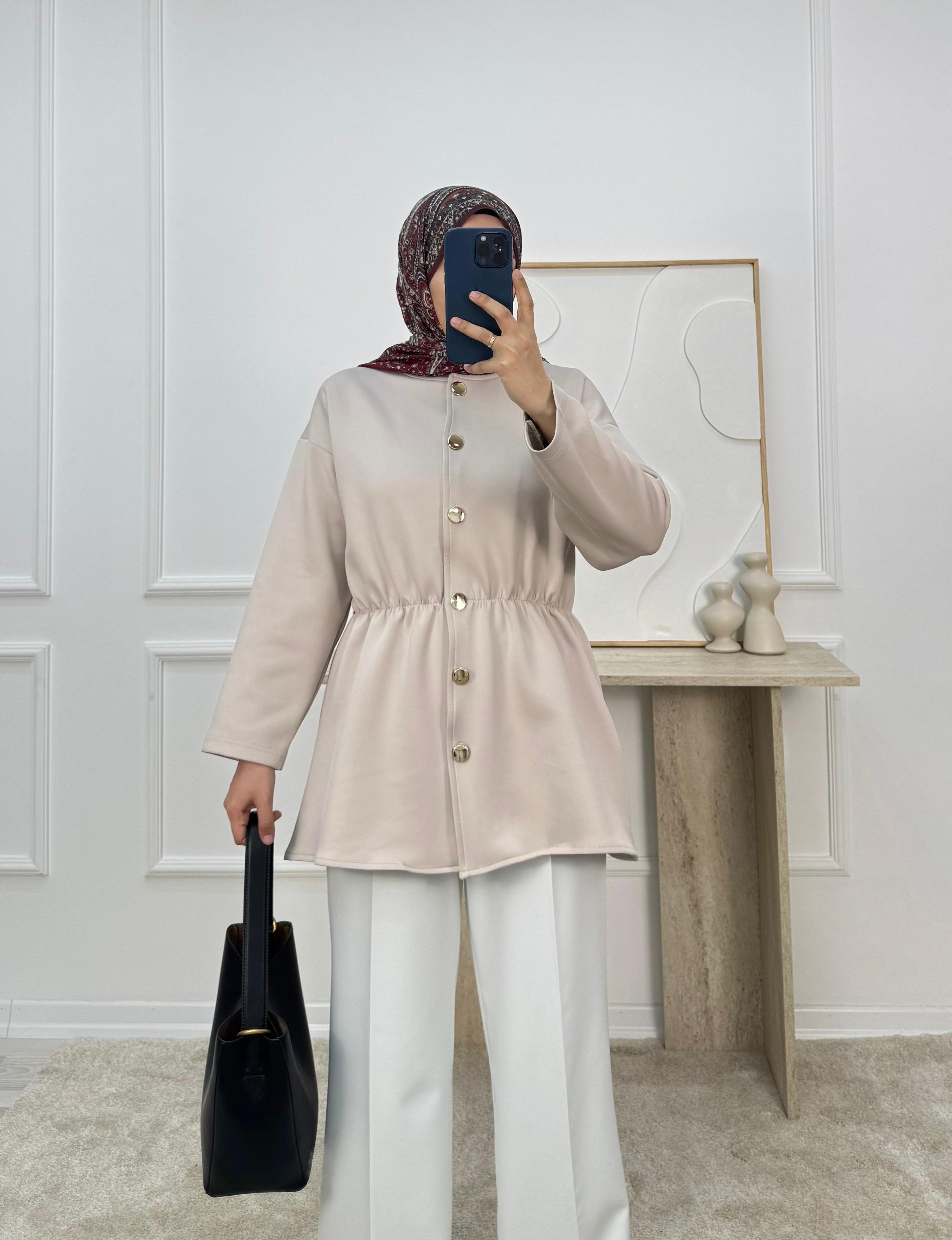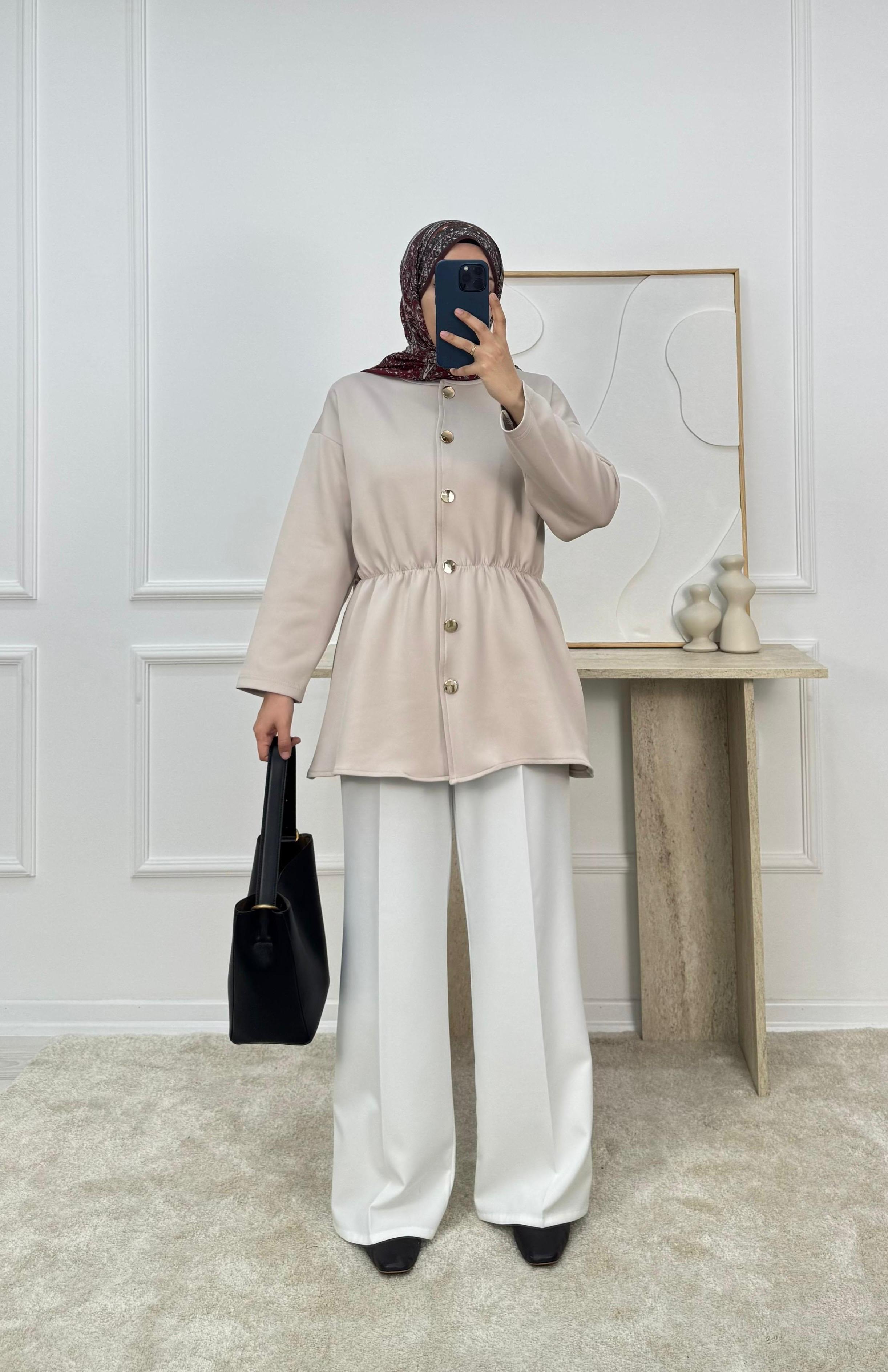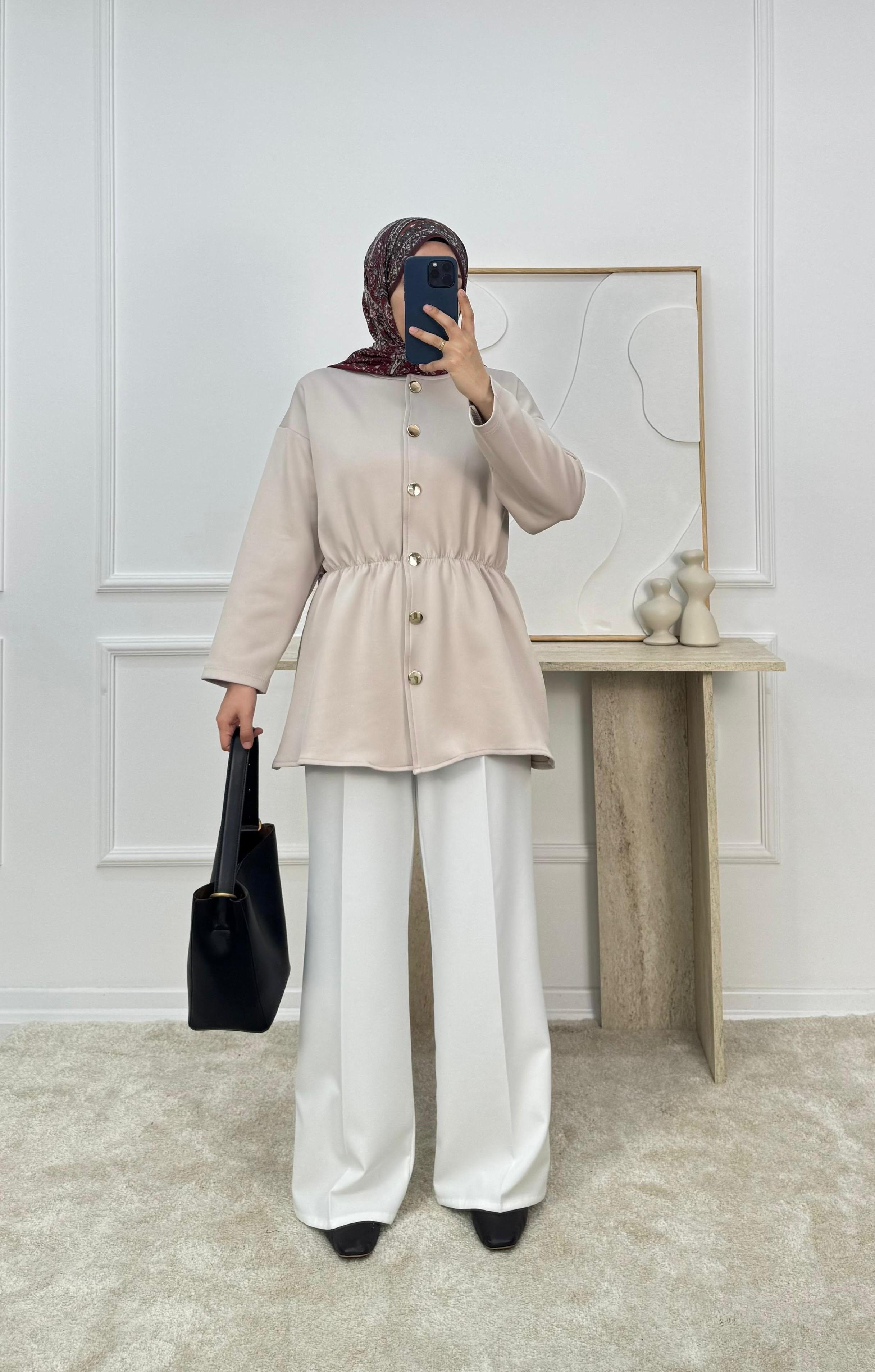 8426-sukuba dalgıç kumaş beli lastikli düğmeli tunik-taş (8426)