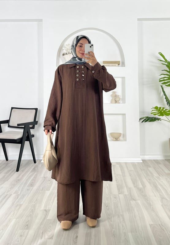 8435-pamuk ayrobin kumaş-düğmeli pantolonlu takım-acı kahve (8435)