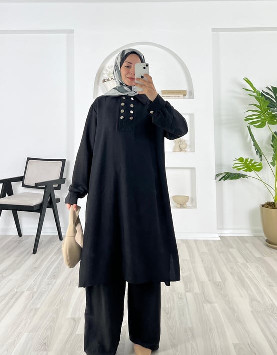 8435-pamuk ayrobin kumaş-düğmeli pantolonlu takım-siyah (8435)