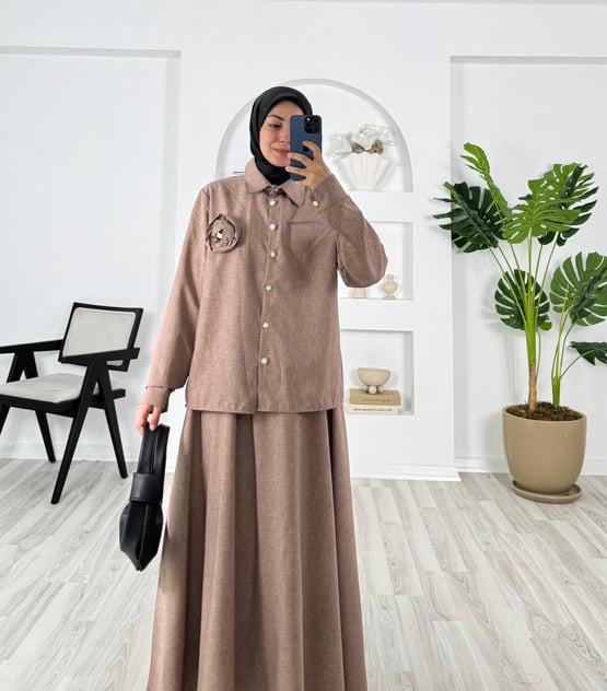 8439-keten kumaş-göğüs gül detaylı etekli takım-sütlü kahve (8439)