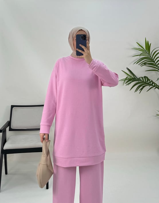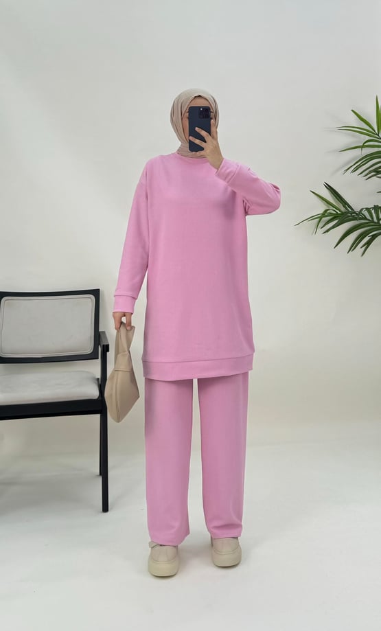 8476-bürümcük kumaş-pantolonlu takım-pembe (8476)