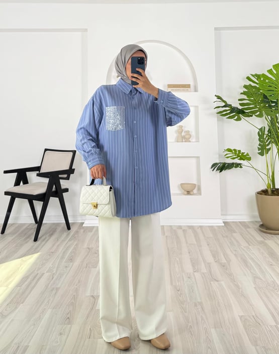 8513 - nilda kumaş cep payetli çizgili gömlek - mavi (8513)