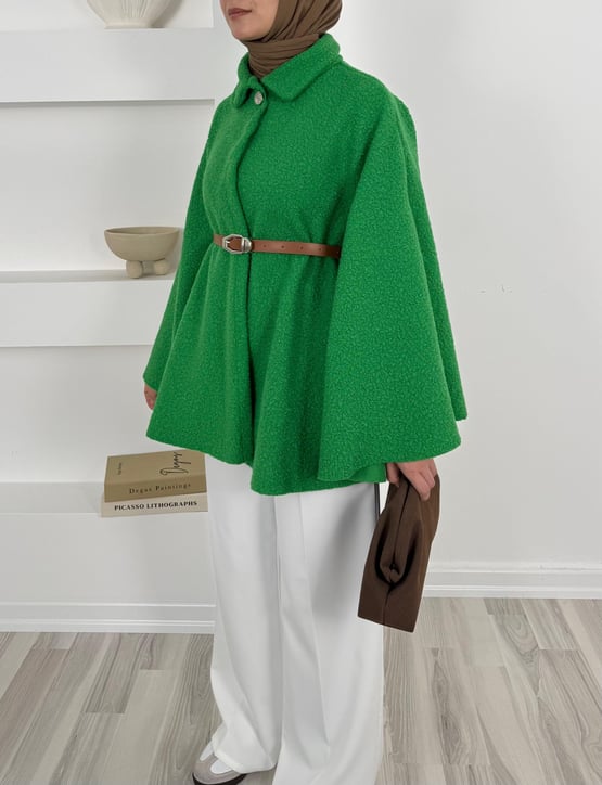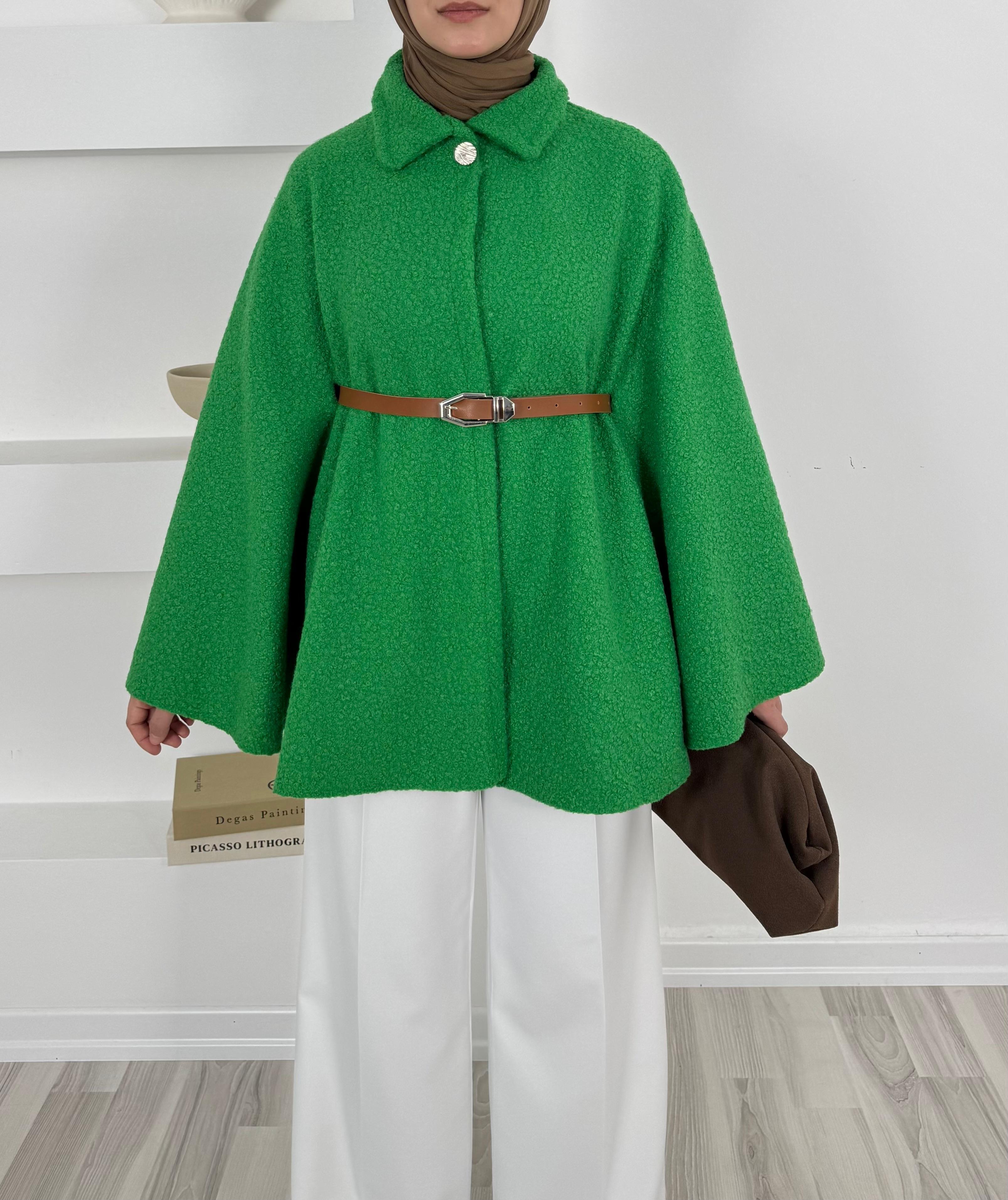 8517 buklet kumaş kemerli panço-benetton yeşili (8517)