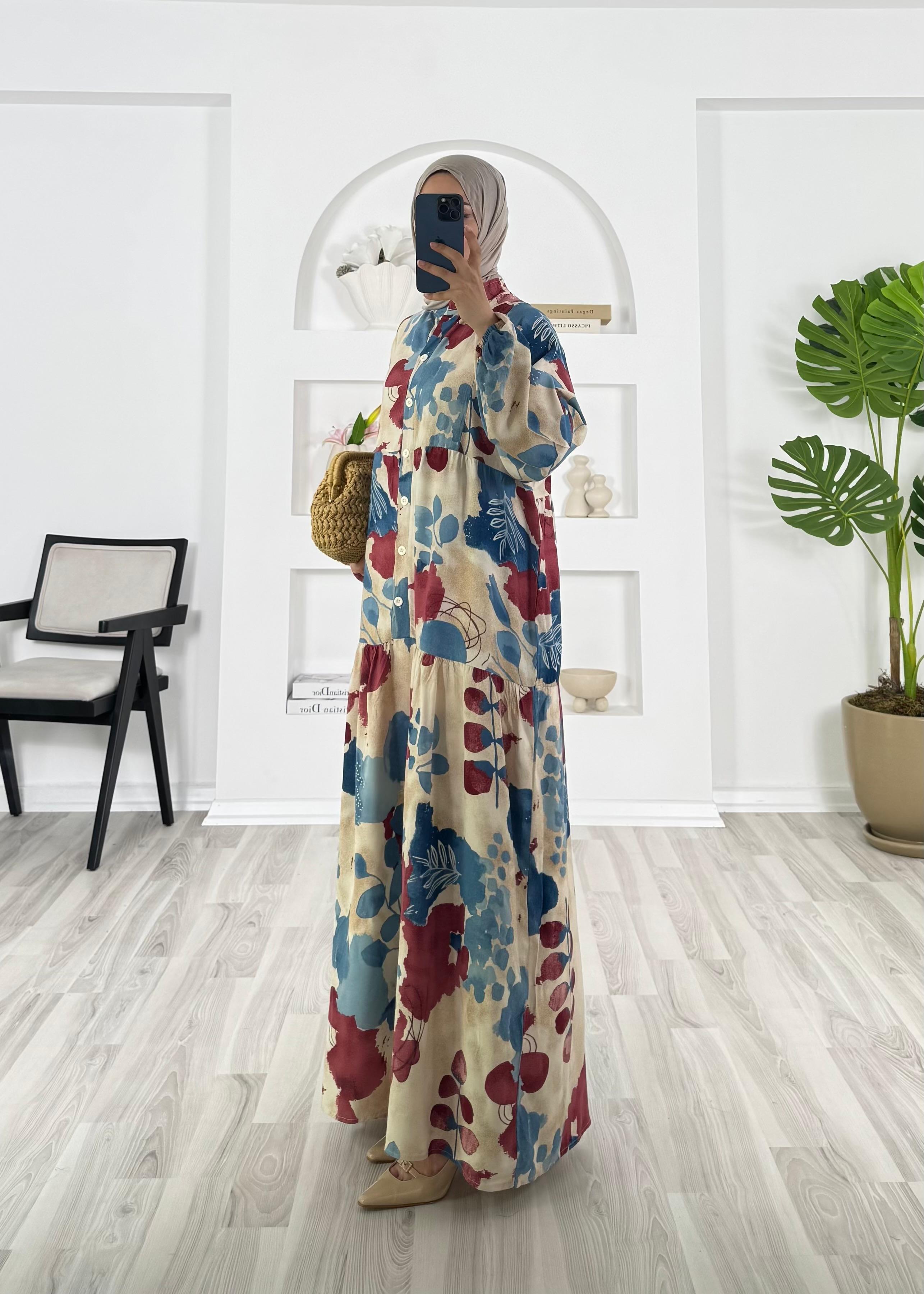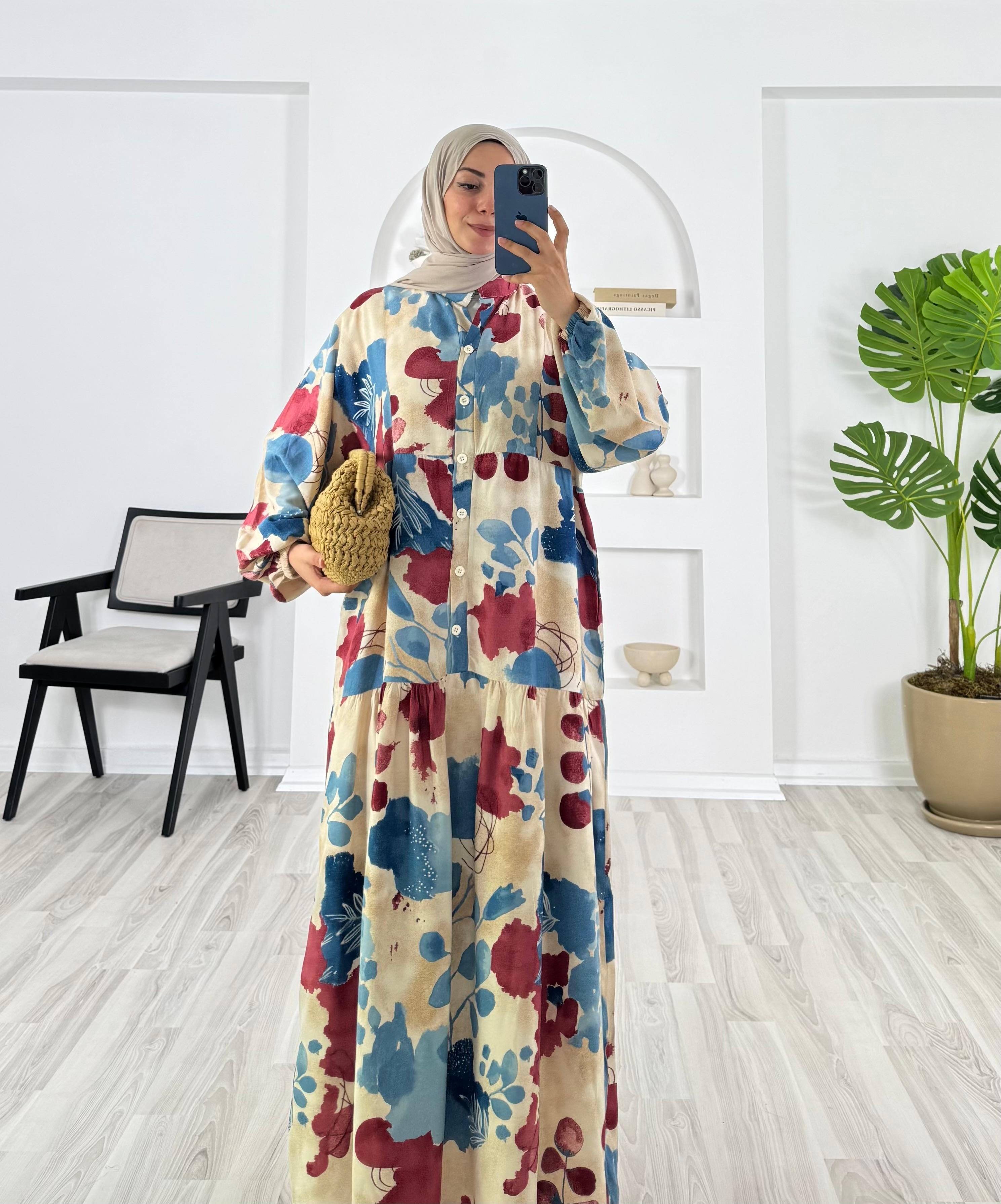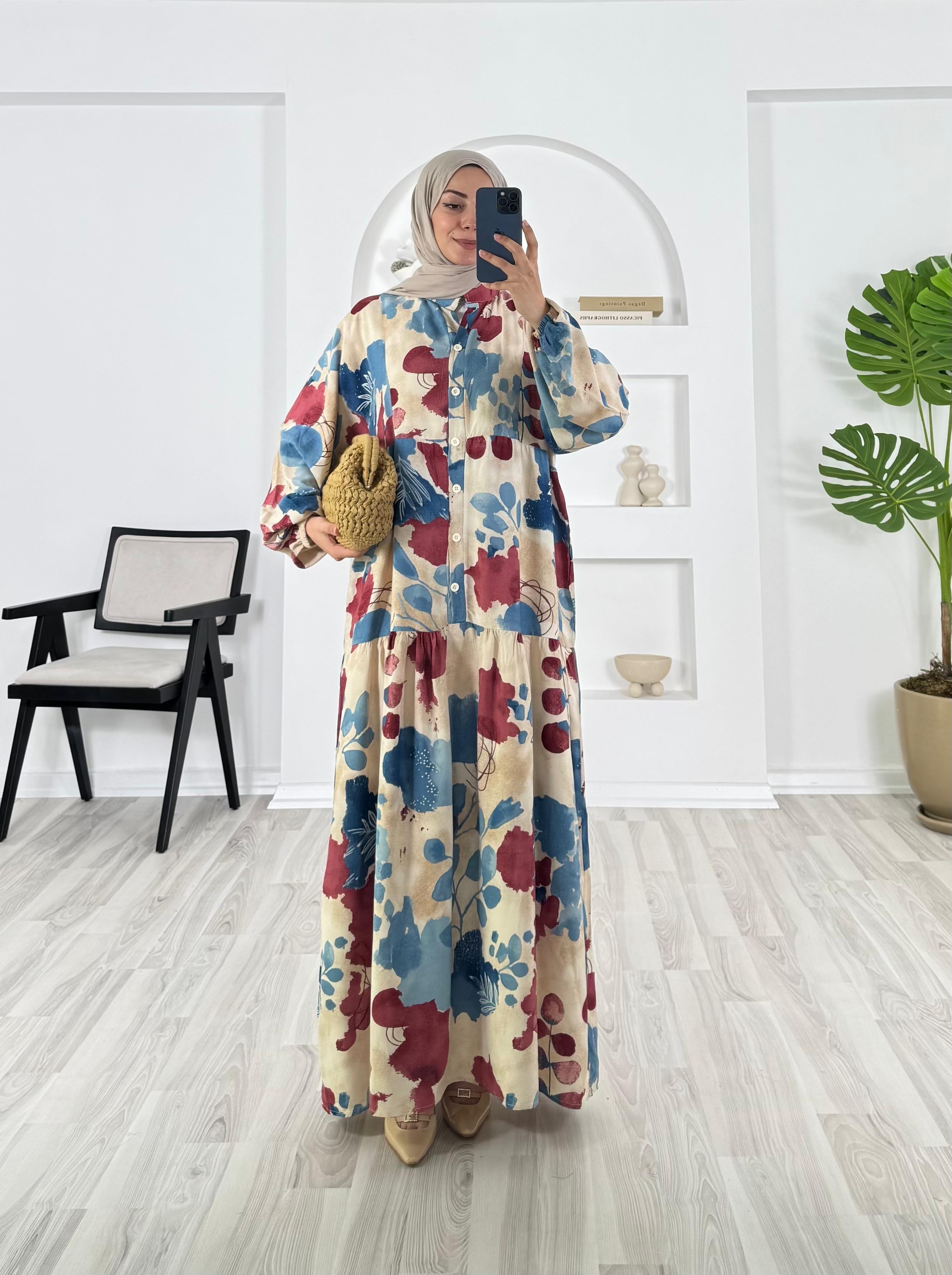 8547-pamuk viskon kumaş-beline kadar düğmeli etek altı düz elbise-mavi (8547)