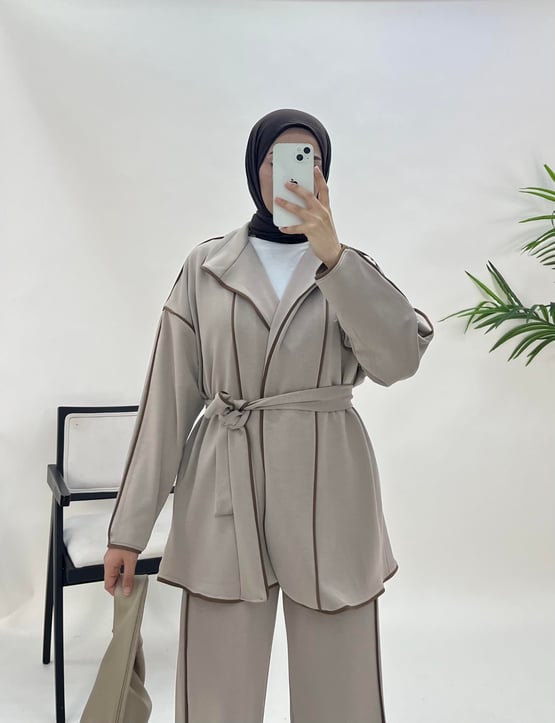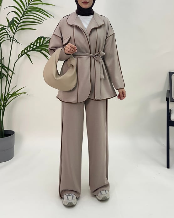 8647-sukuba dalgıç kumaş-kemer detaylı pantolonlu takım-vizon (8647)