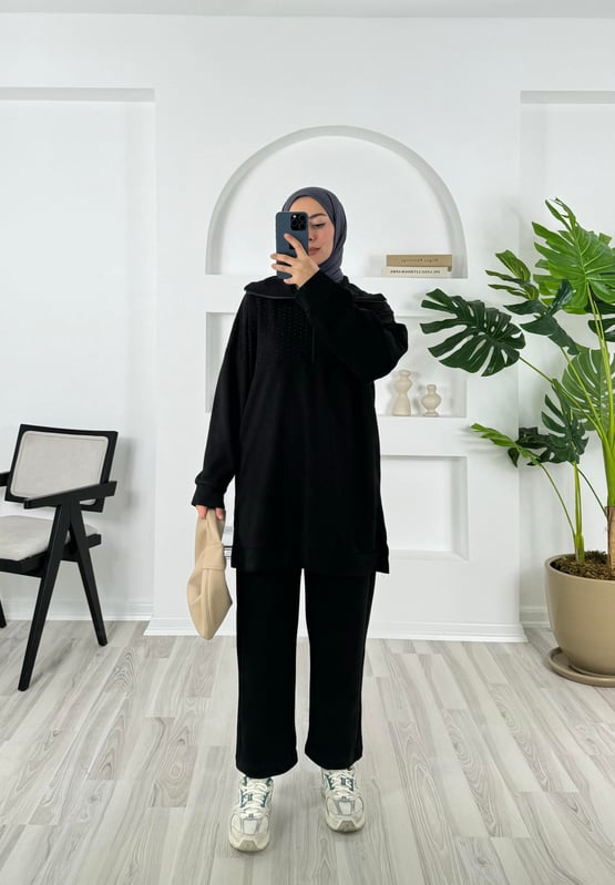 8651-oysho kumaş-yarım fermuarlı önü taşlı takım-siyah (8651)