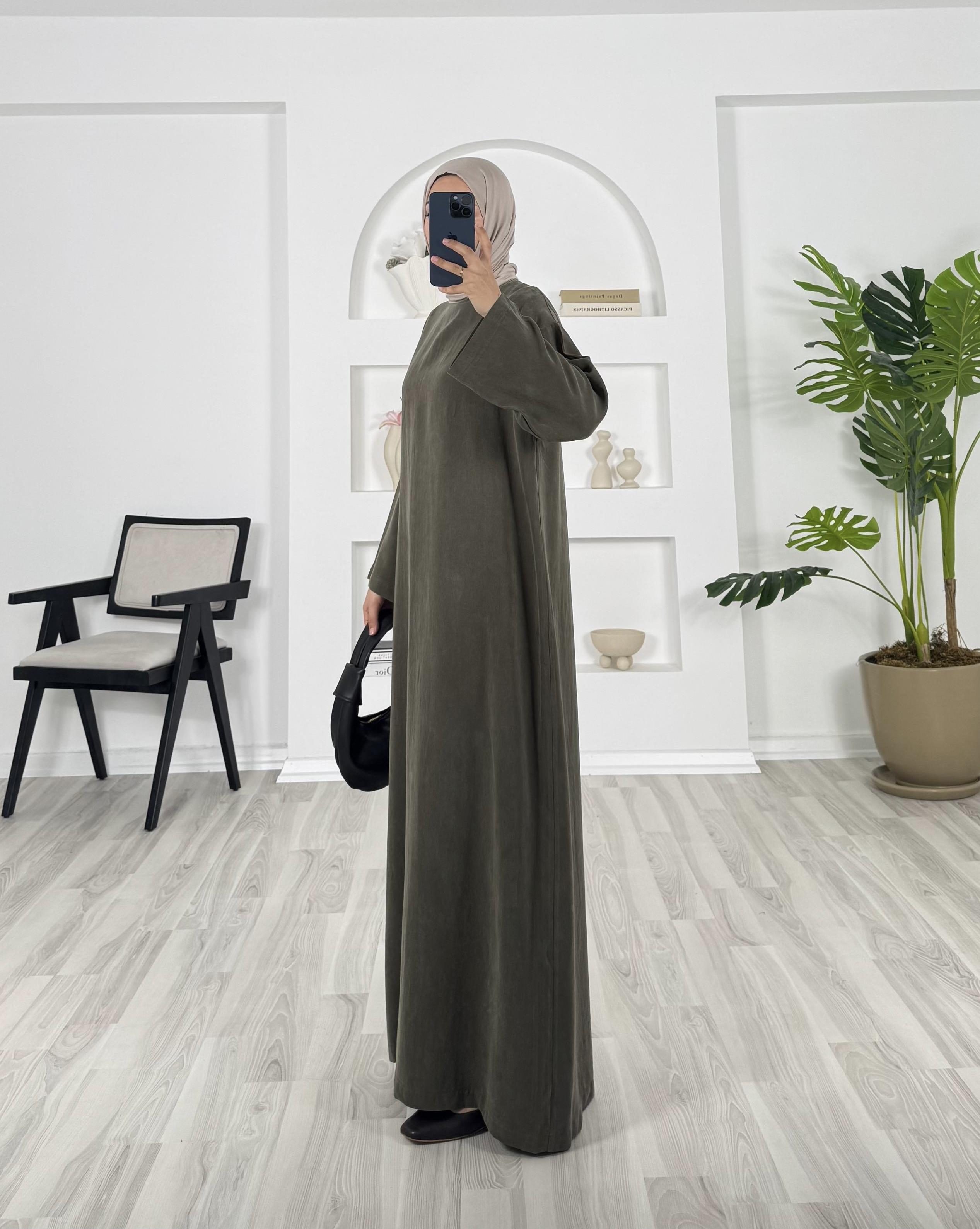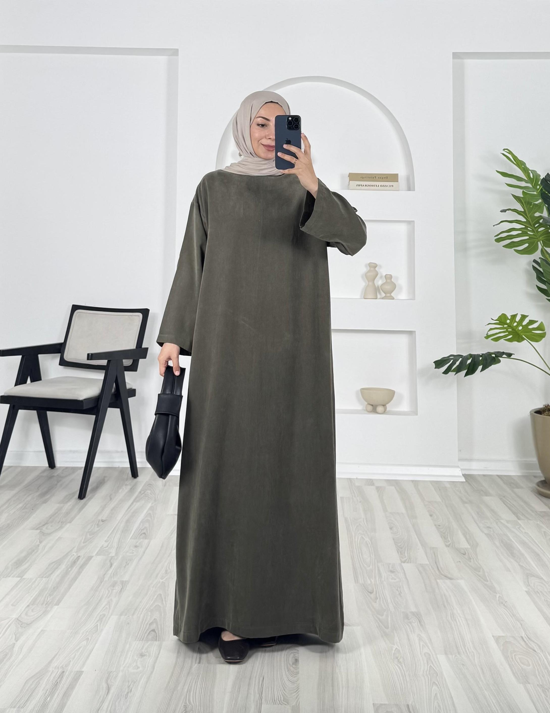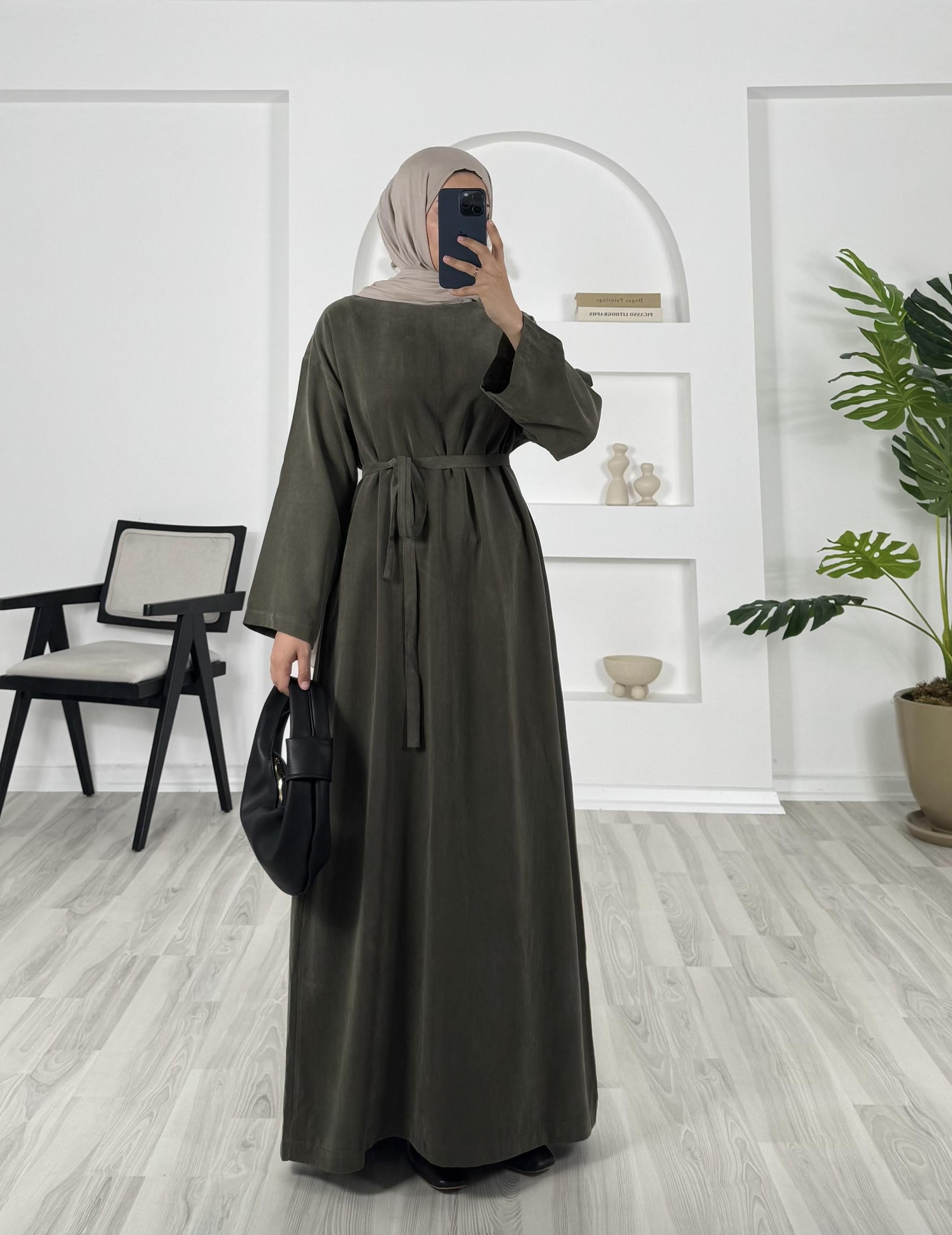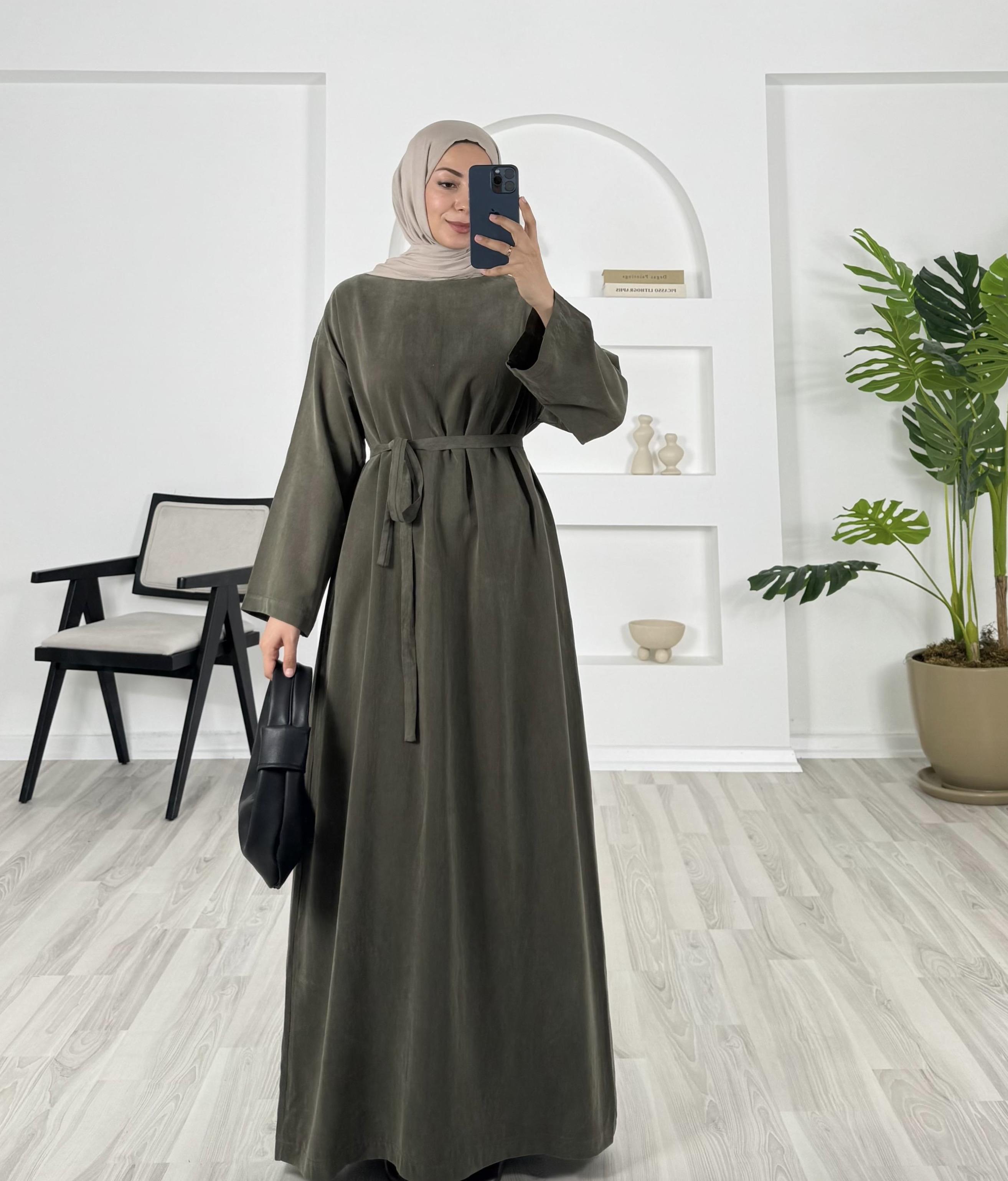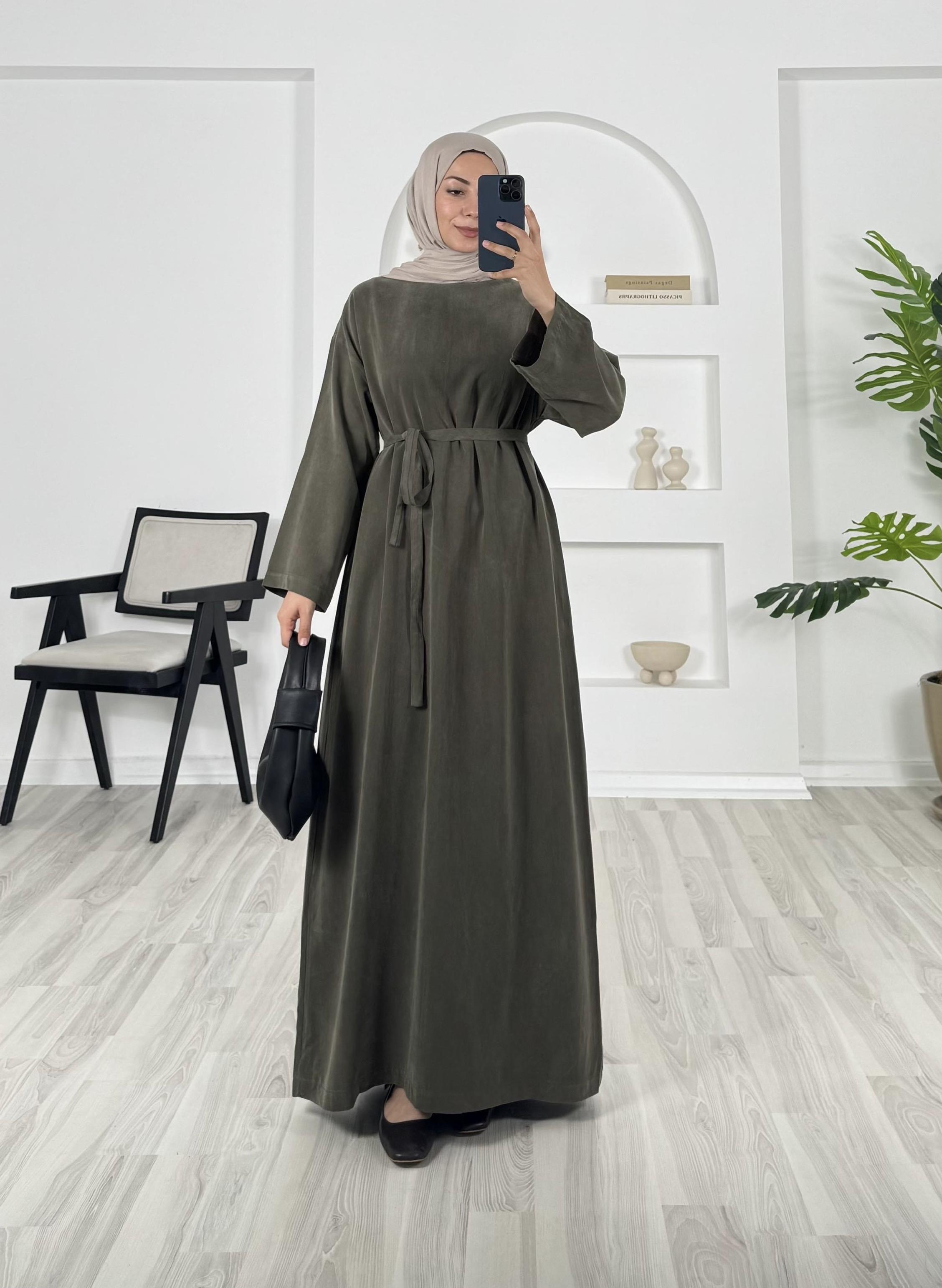8693 - düz kesim kuşaklı dokuma cupra kumaş elbise -haki (8693)