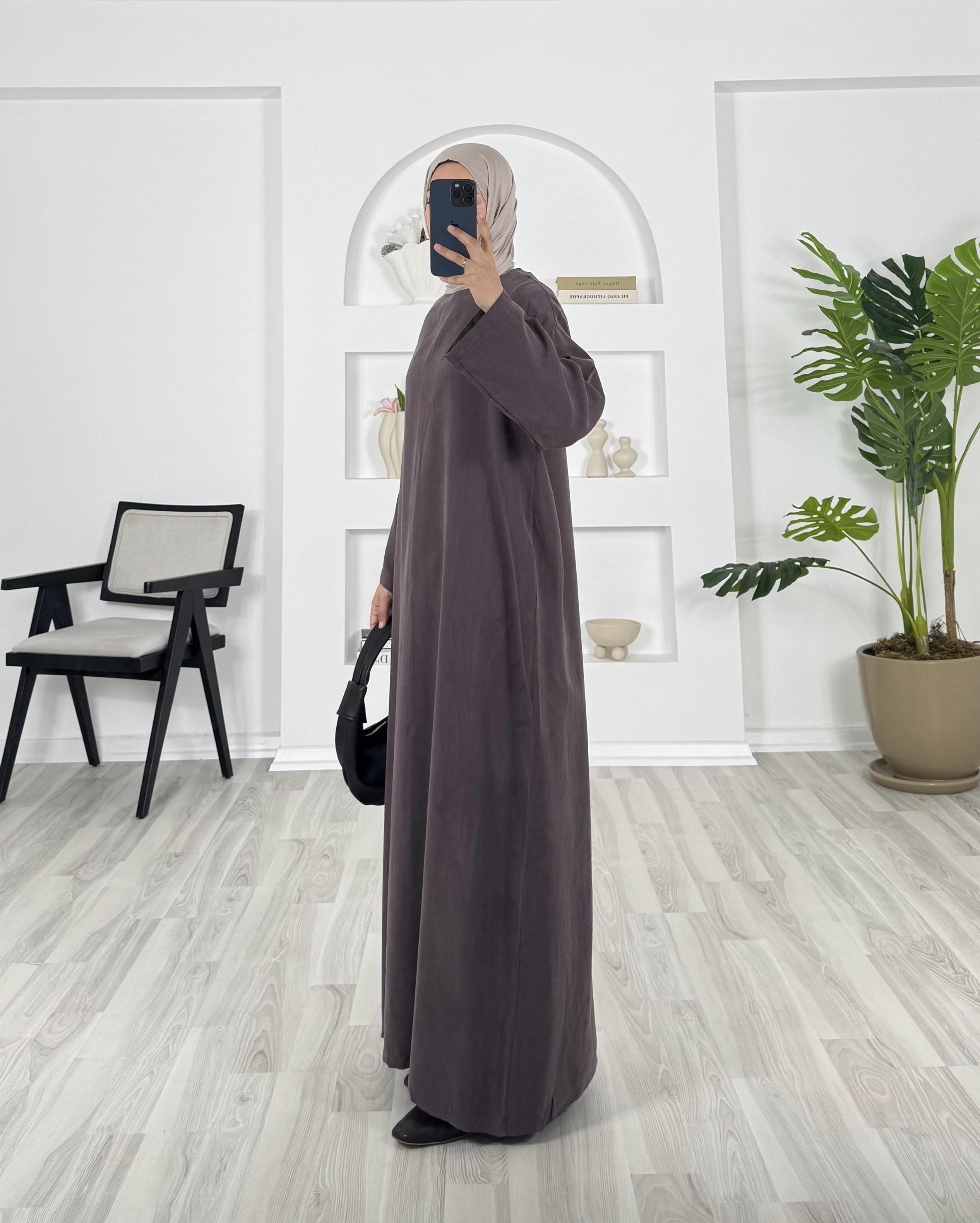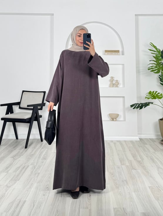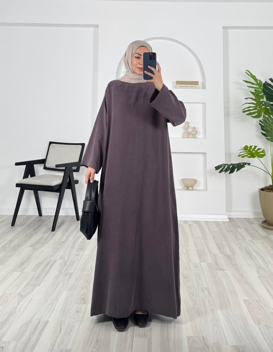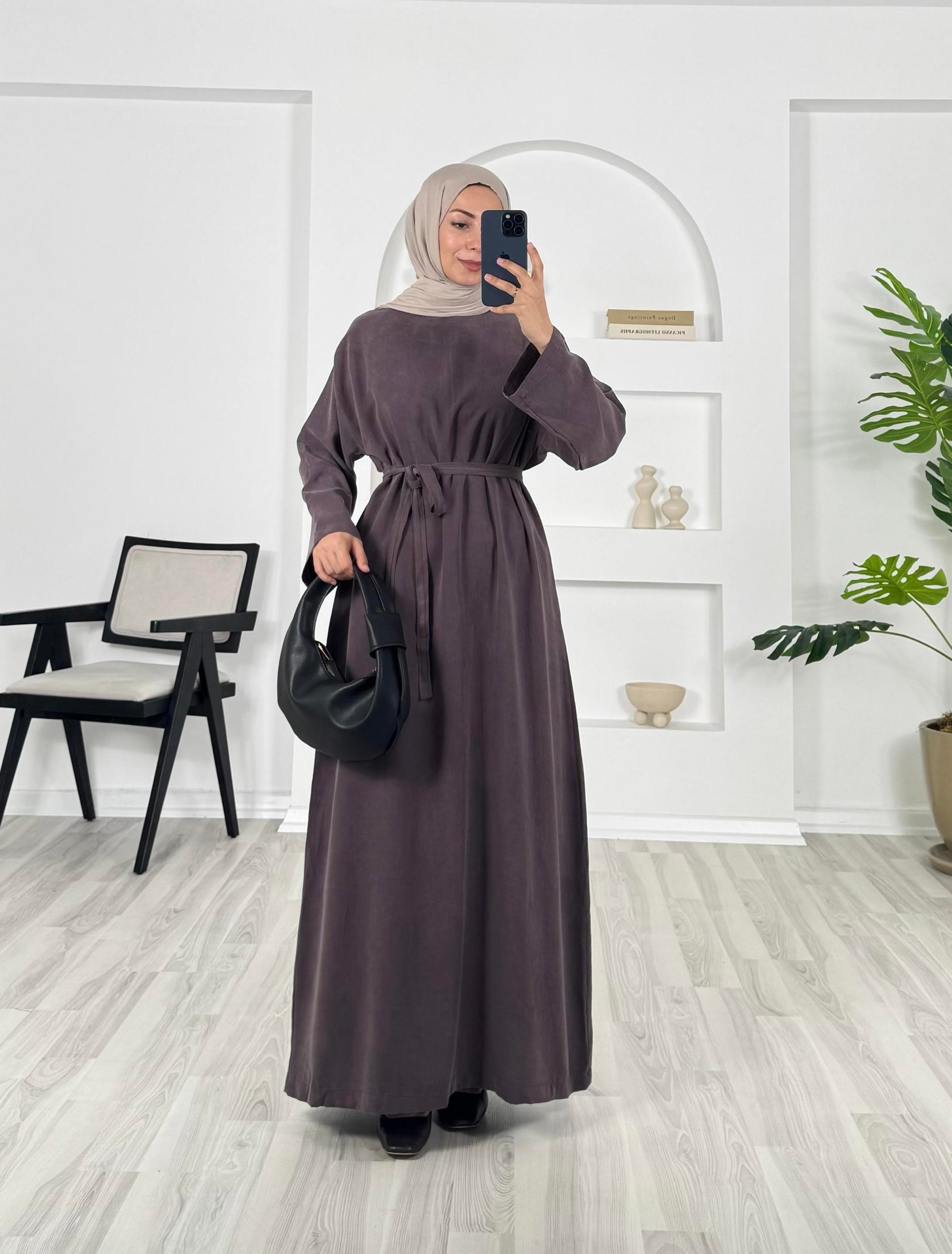 8693 - düz kesim kuşaklı dokuma cupra kumaş elbise -mürdüm (8693)