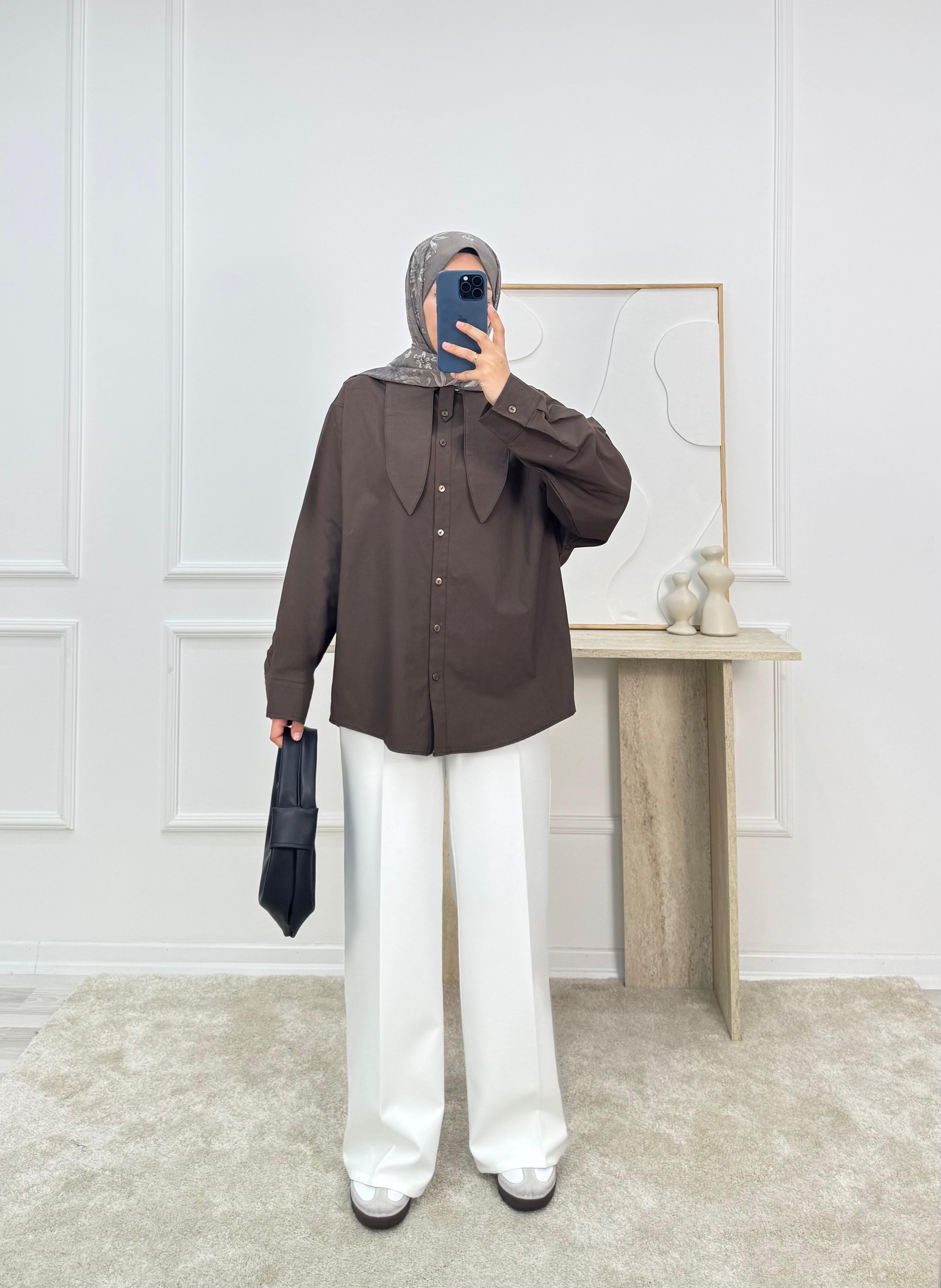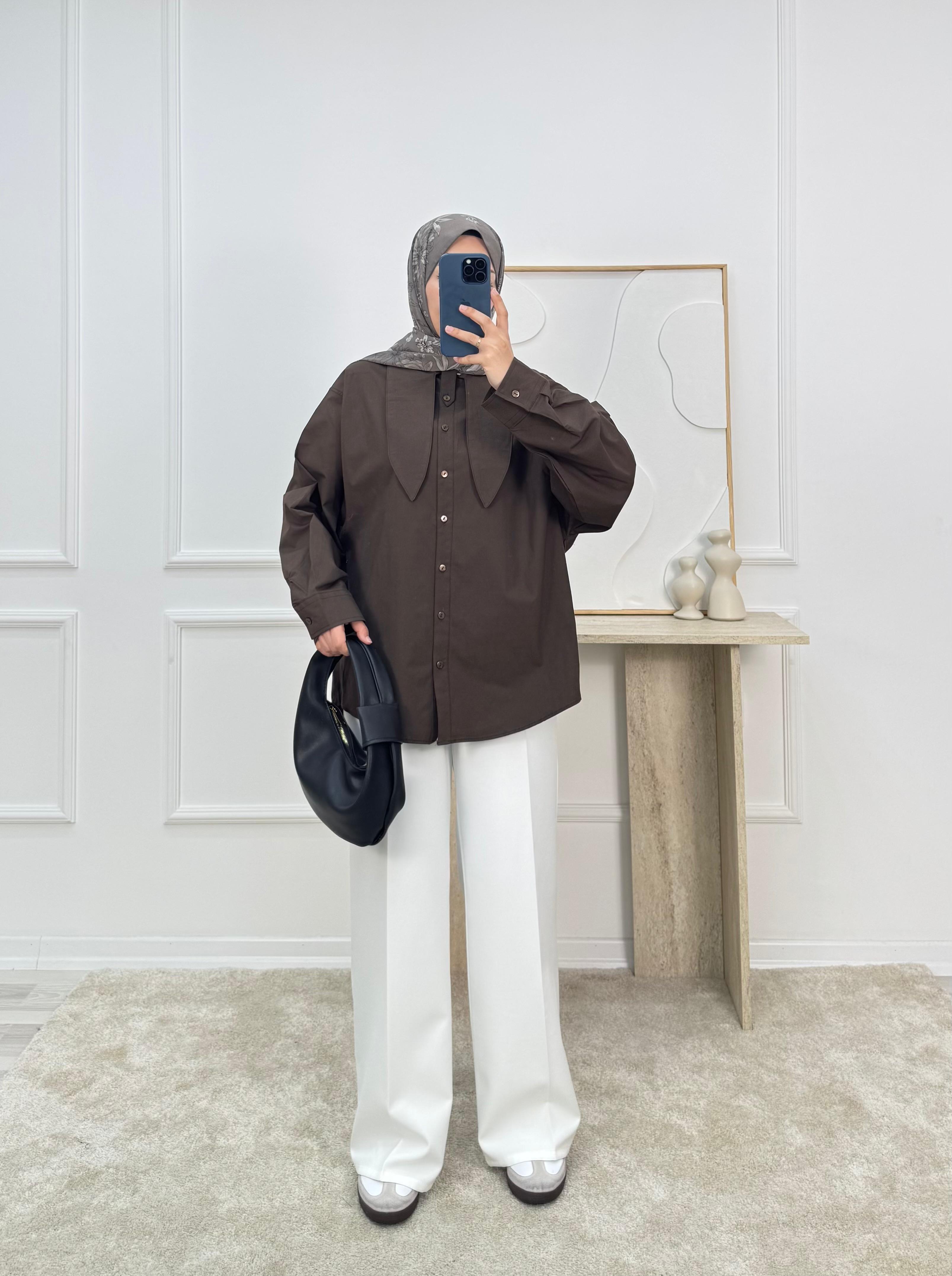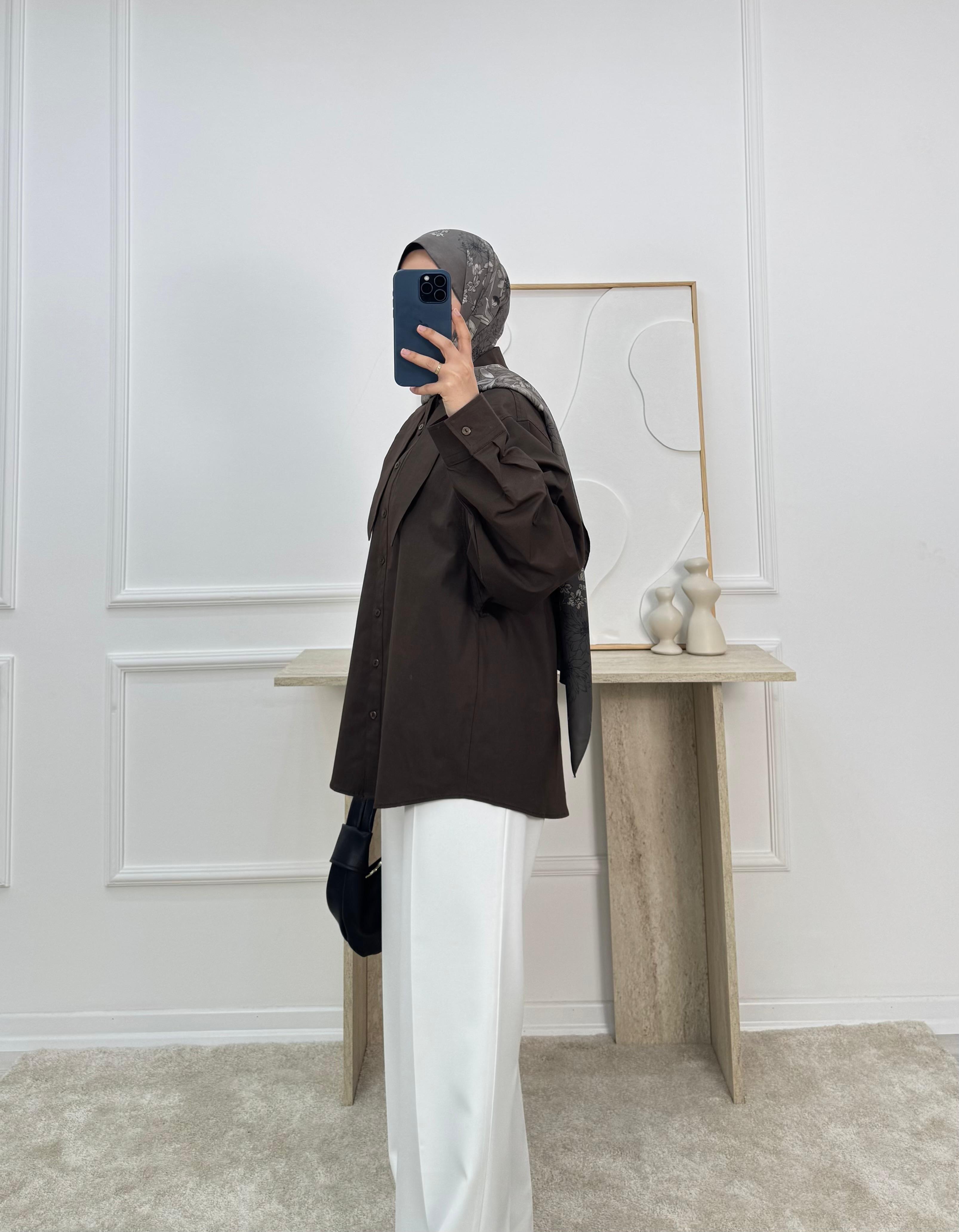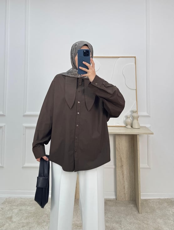 8736-poplin kumaş yaka detaylı gömlek-acı kahve (8736)