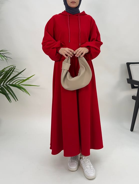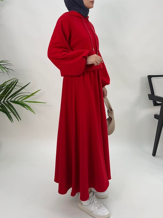 8752-üç iplik şardonsuz kumaş-kapşonlu etekli takım-kırmızı (8752)