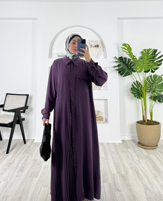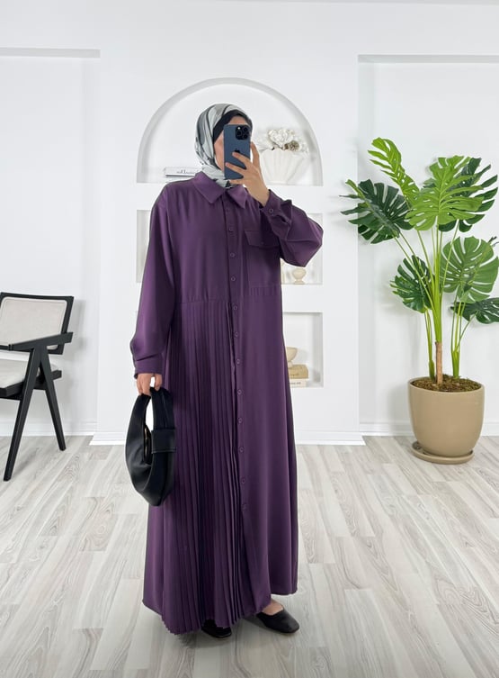 8754-krep kumaş-önü cepli bir tarafı pileli boydan düğmeli elbise-mor (8754)
