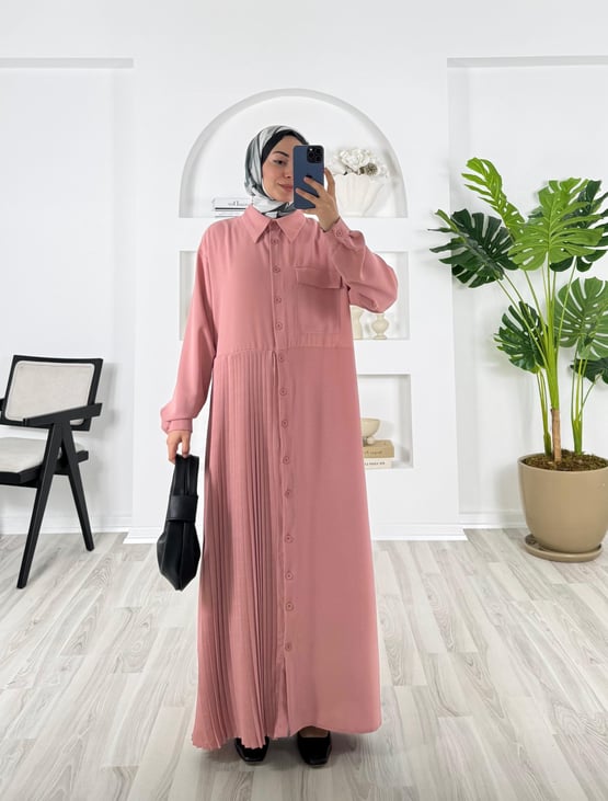 8754-krep kumaş-önü cepli bir tarafı pileli boydan düğmeli elbise-pudra (8754)