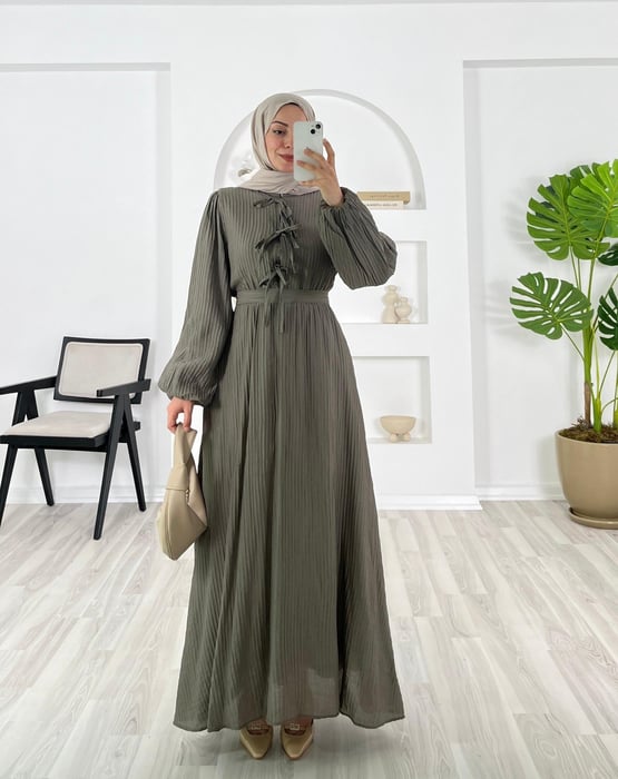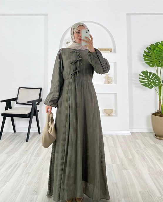 önü bağlamalı beli lastikli balon kol elbise