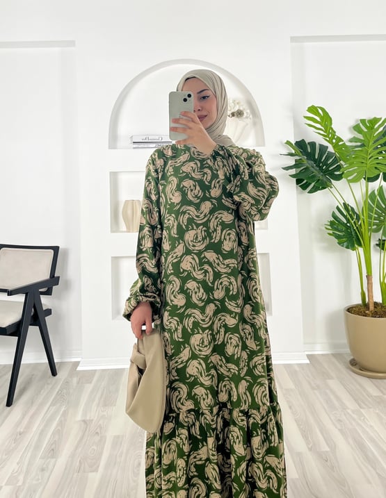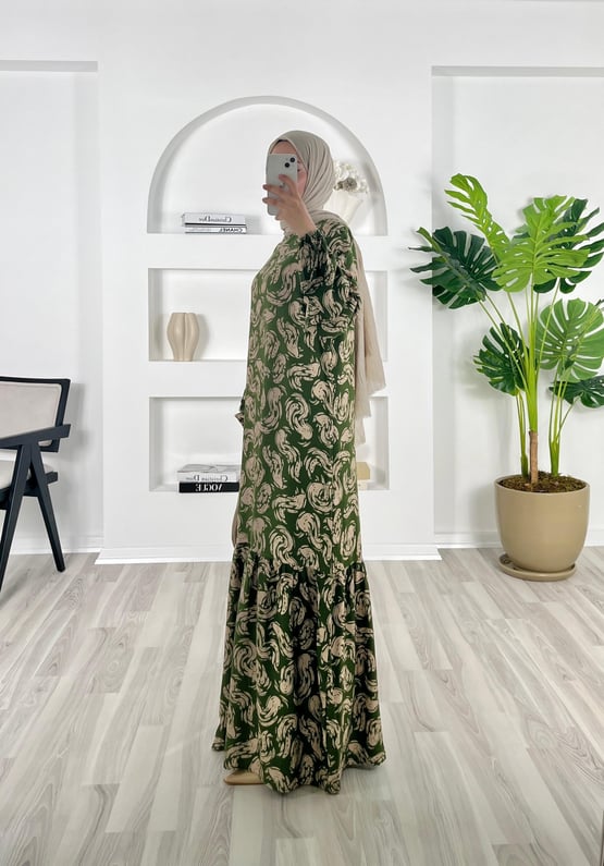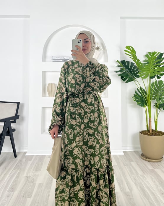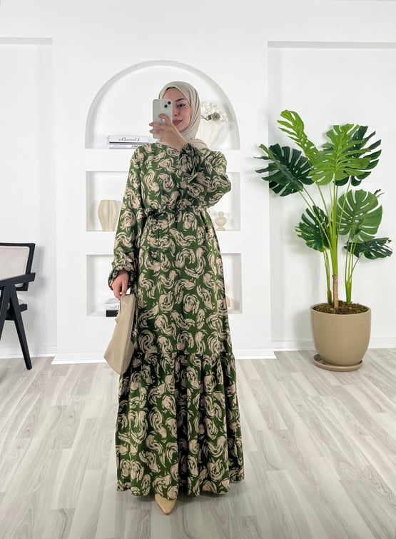 8757-pamuk viskon kumaş-etnik desenli kemerli elbise-yeşil