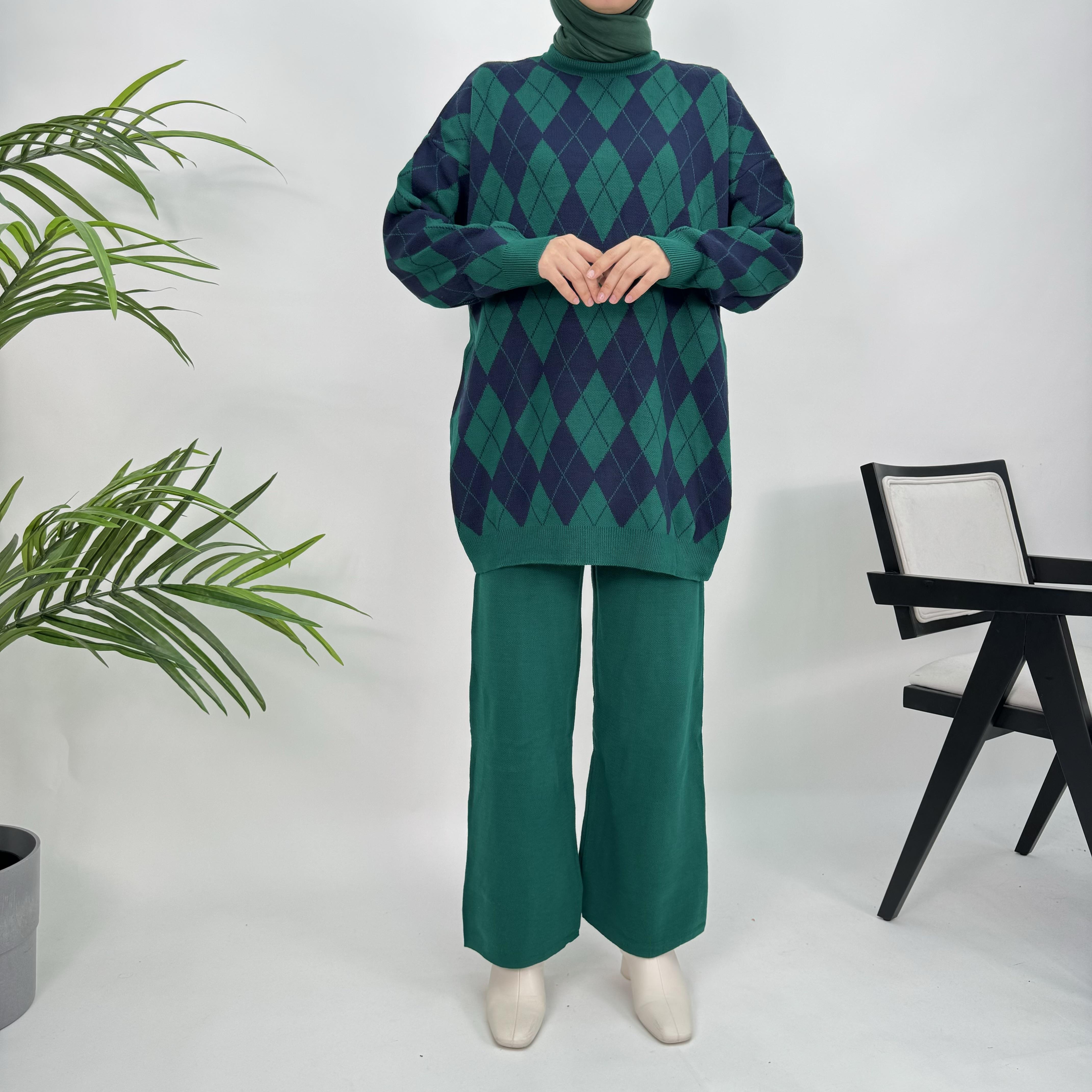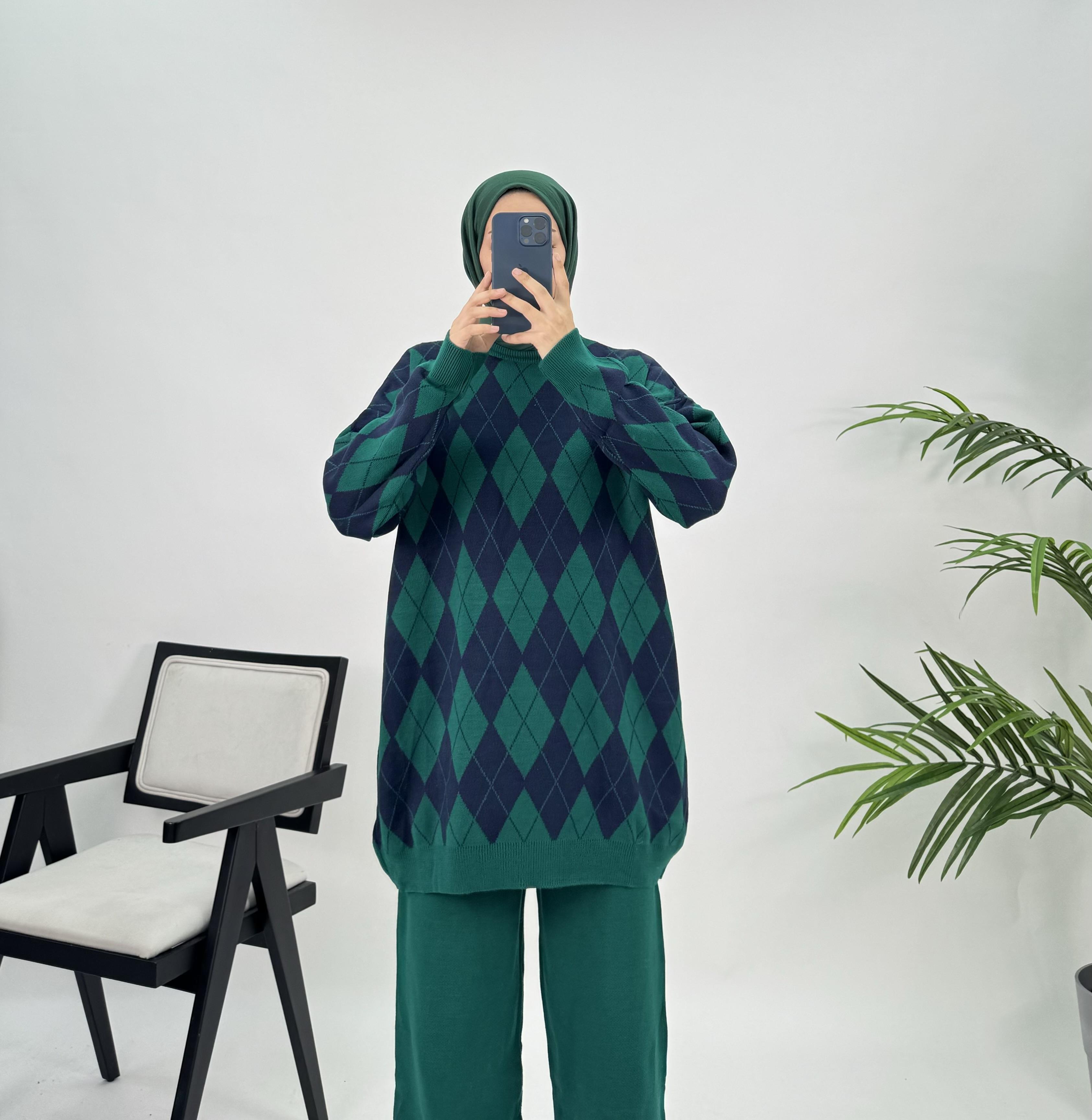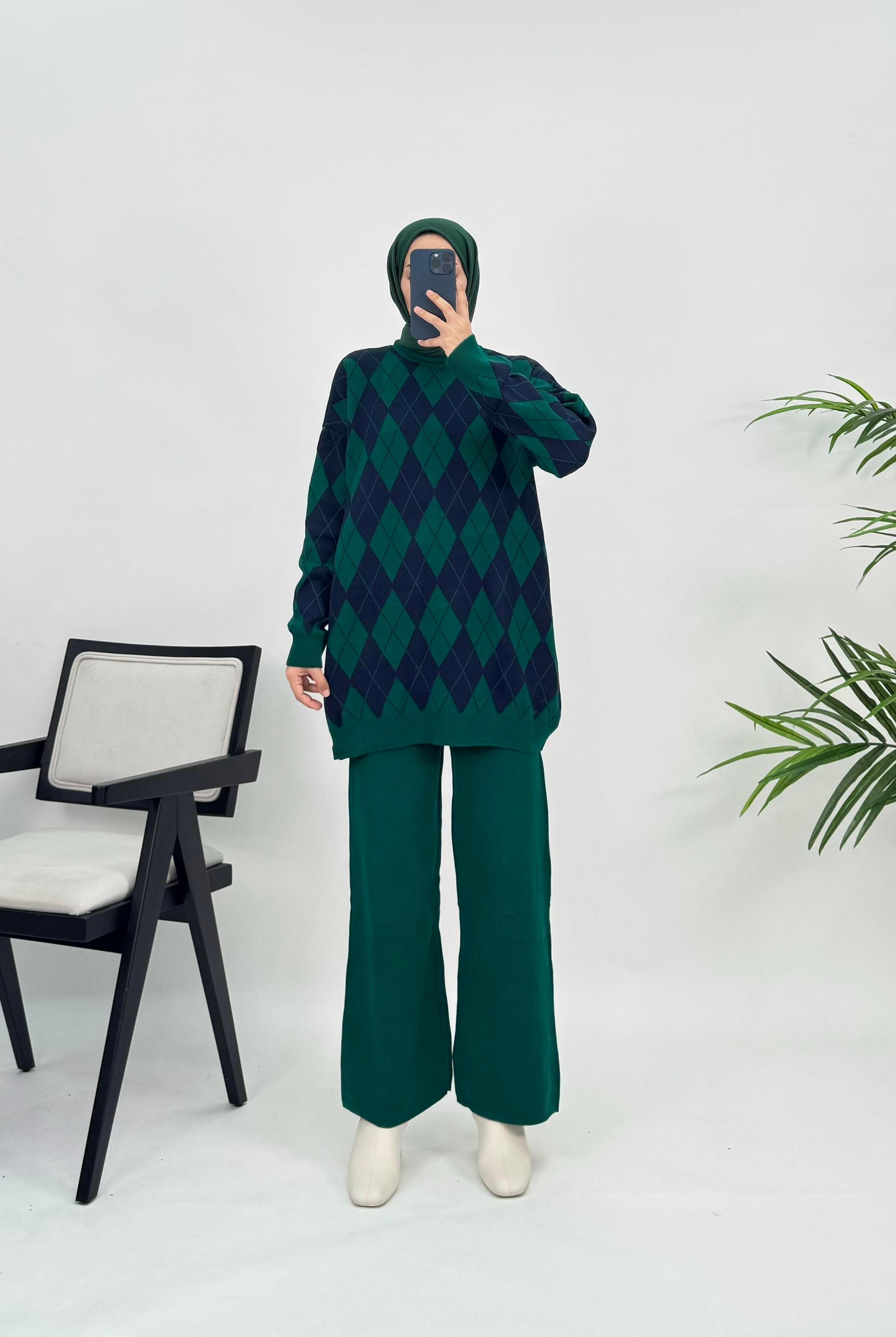 8954 O24+Baklava Desenli Triko Takım Koyu Yeşil (8954)