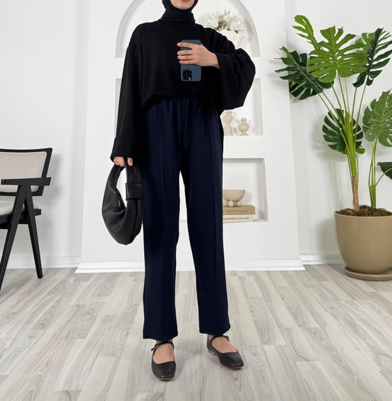 9005-dabıl krep kumaş-süs düğme detaylı beli lastikli pantolon-lacivert (9005)