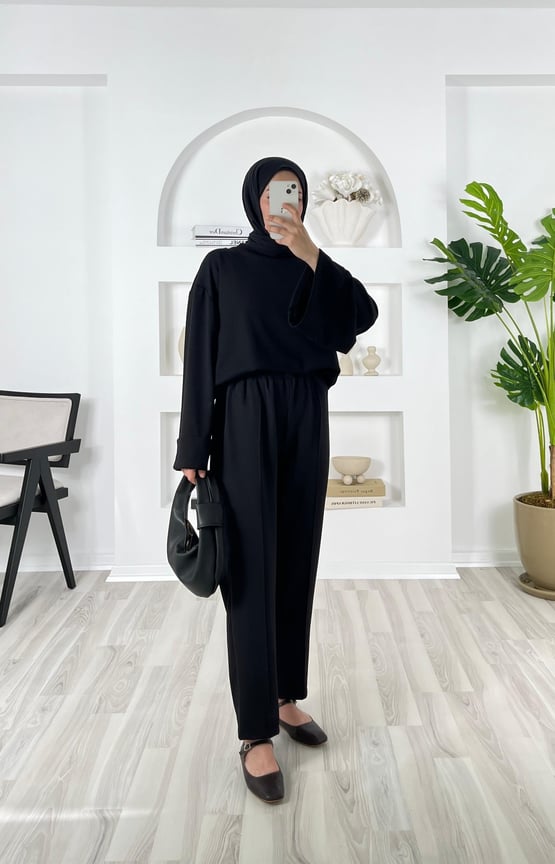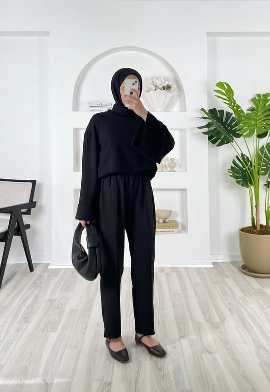 9005-dabıl krep kumaş-süs düğme detaylı beli lastikli pantolon-siyah (9005)