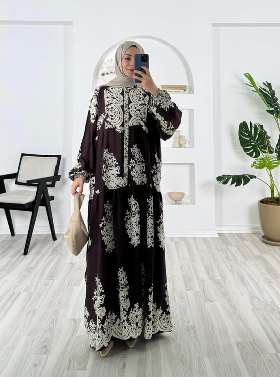 9317-pamuk viskon kumaş-yarım düğmeli desenli elbise-acı kahve (9317)