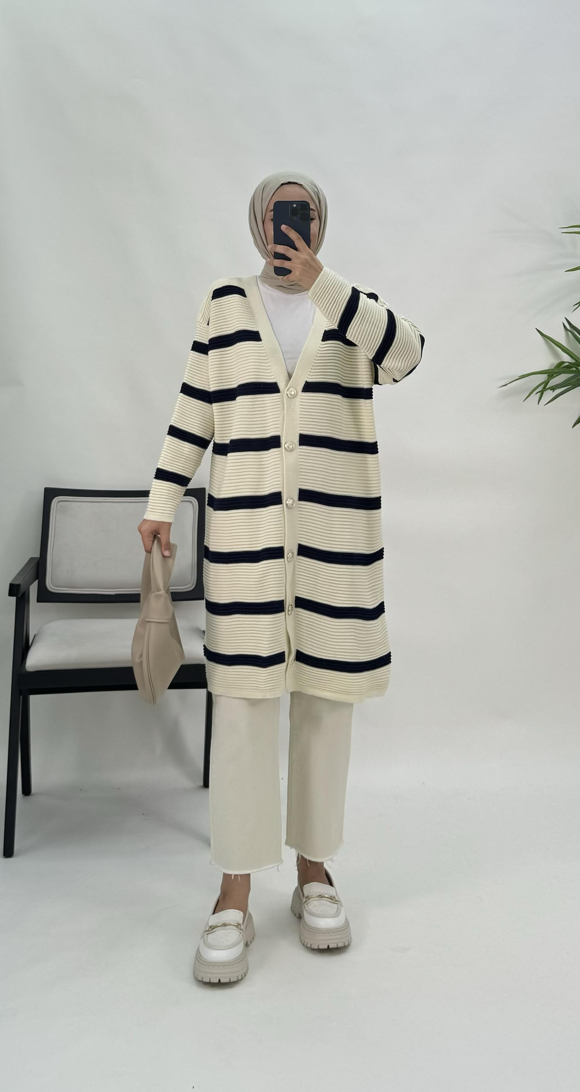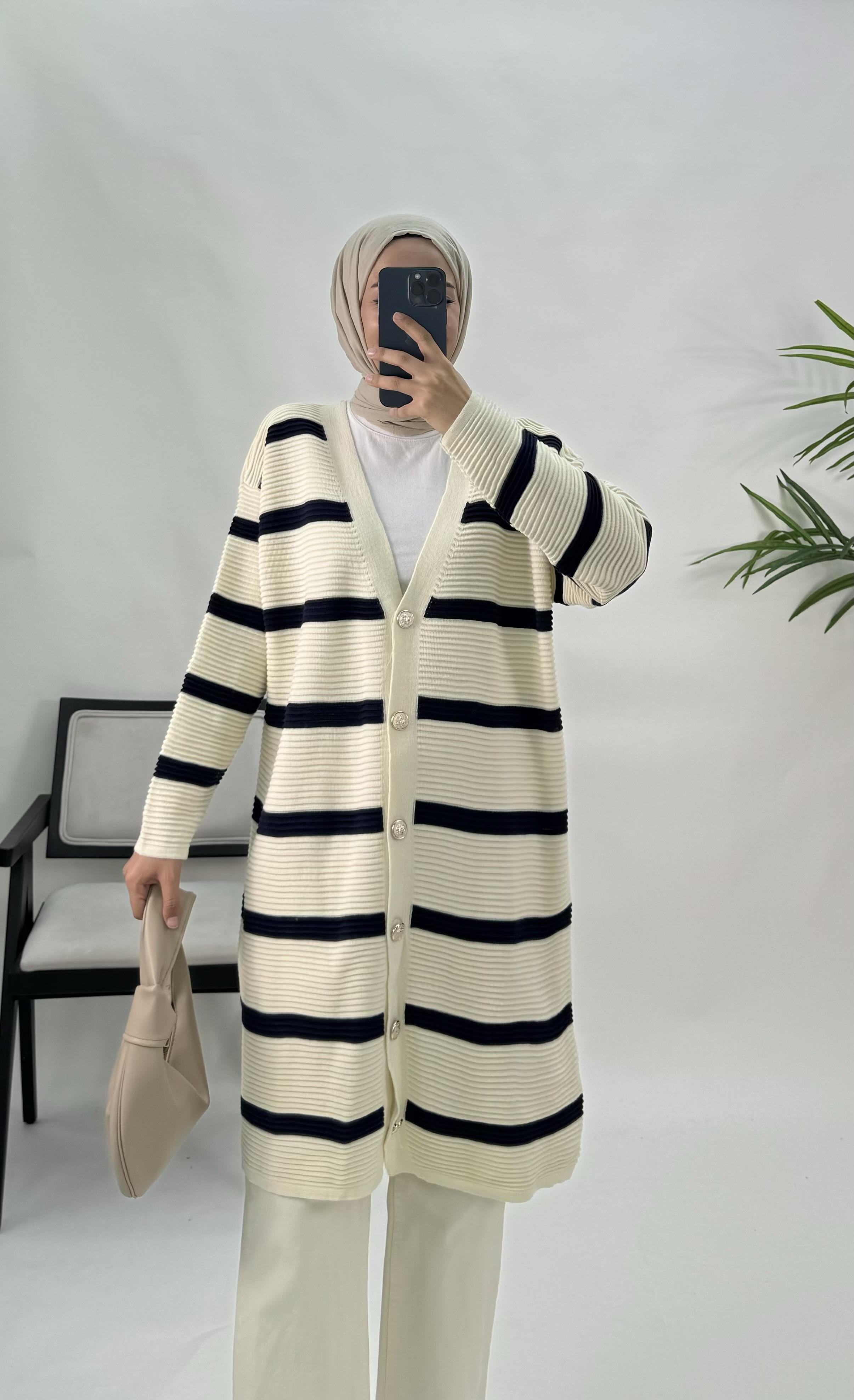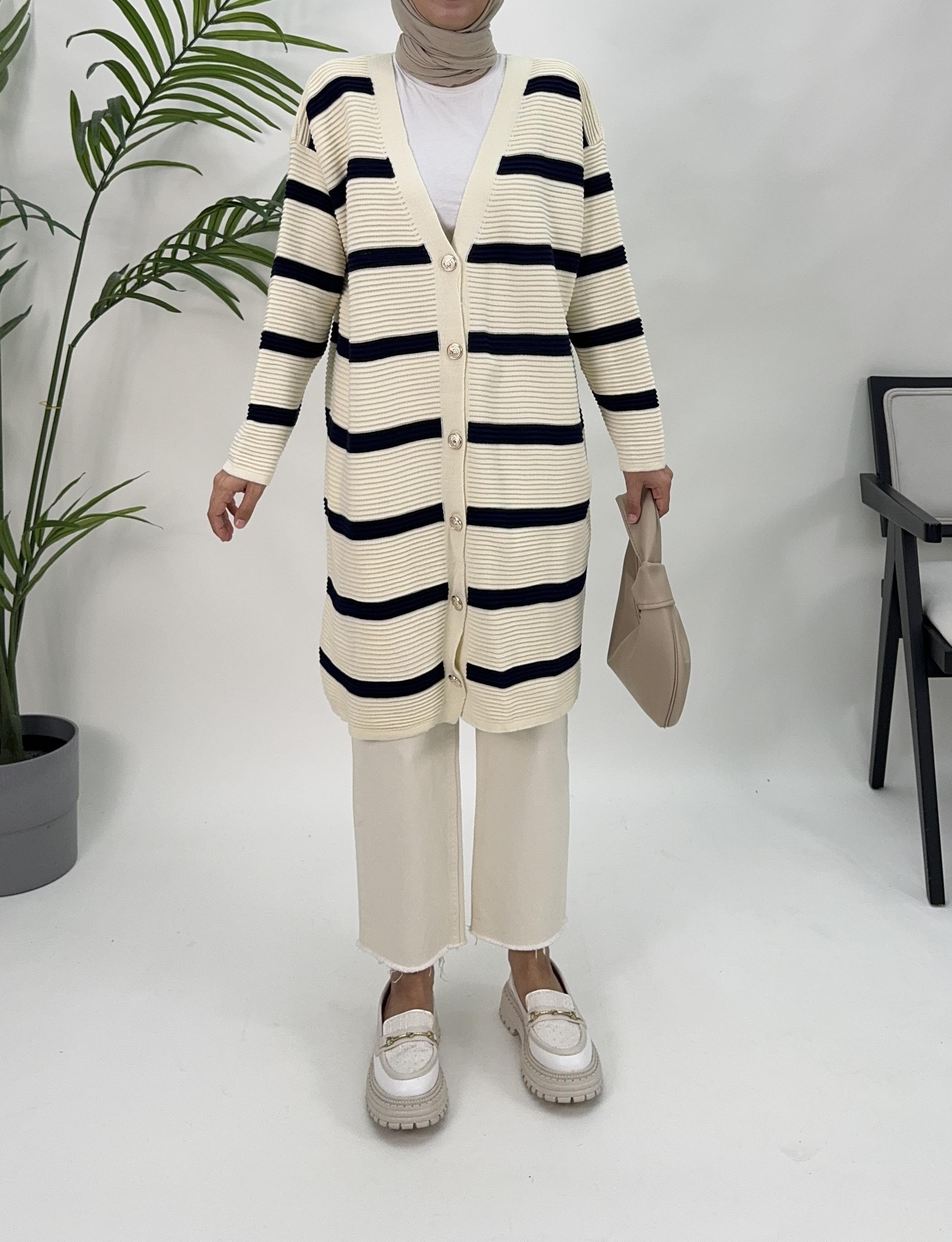 9534-önü düğmeli çizgi detaylı triko hırka-beyaz-lacivert (9534)
