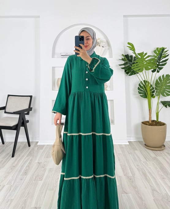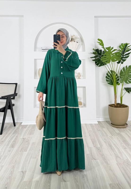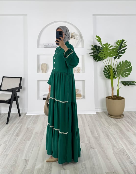9541-kaş kumaş-bilek ucu lastikli dantel detaylı kemerli elbise-yeşil