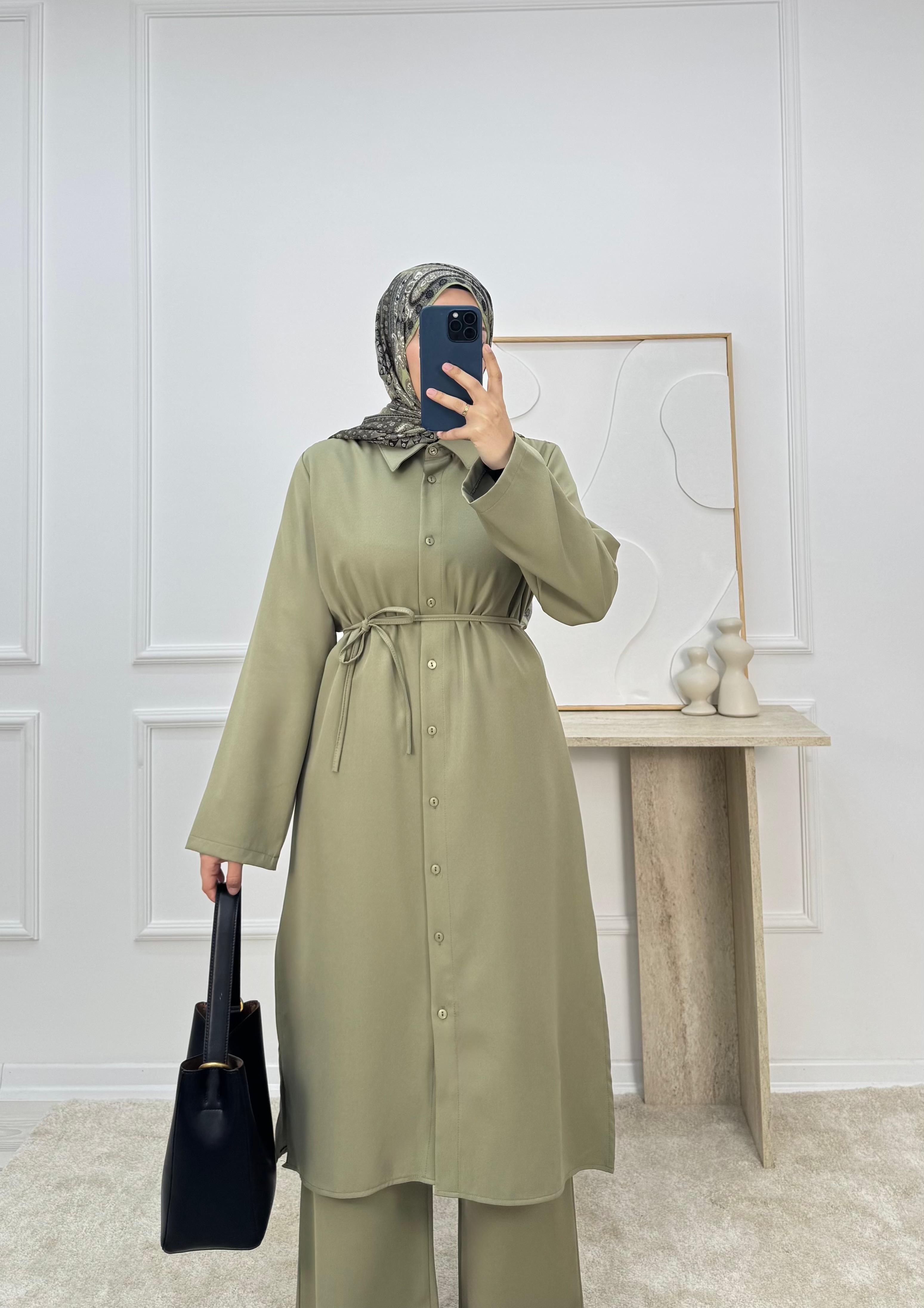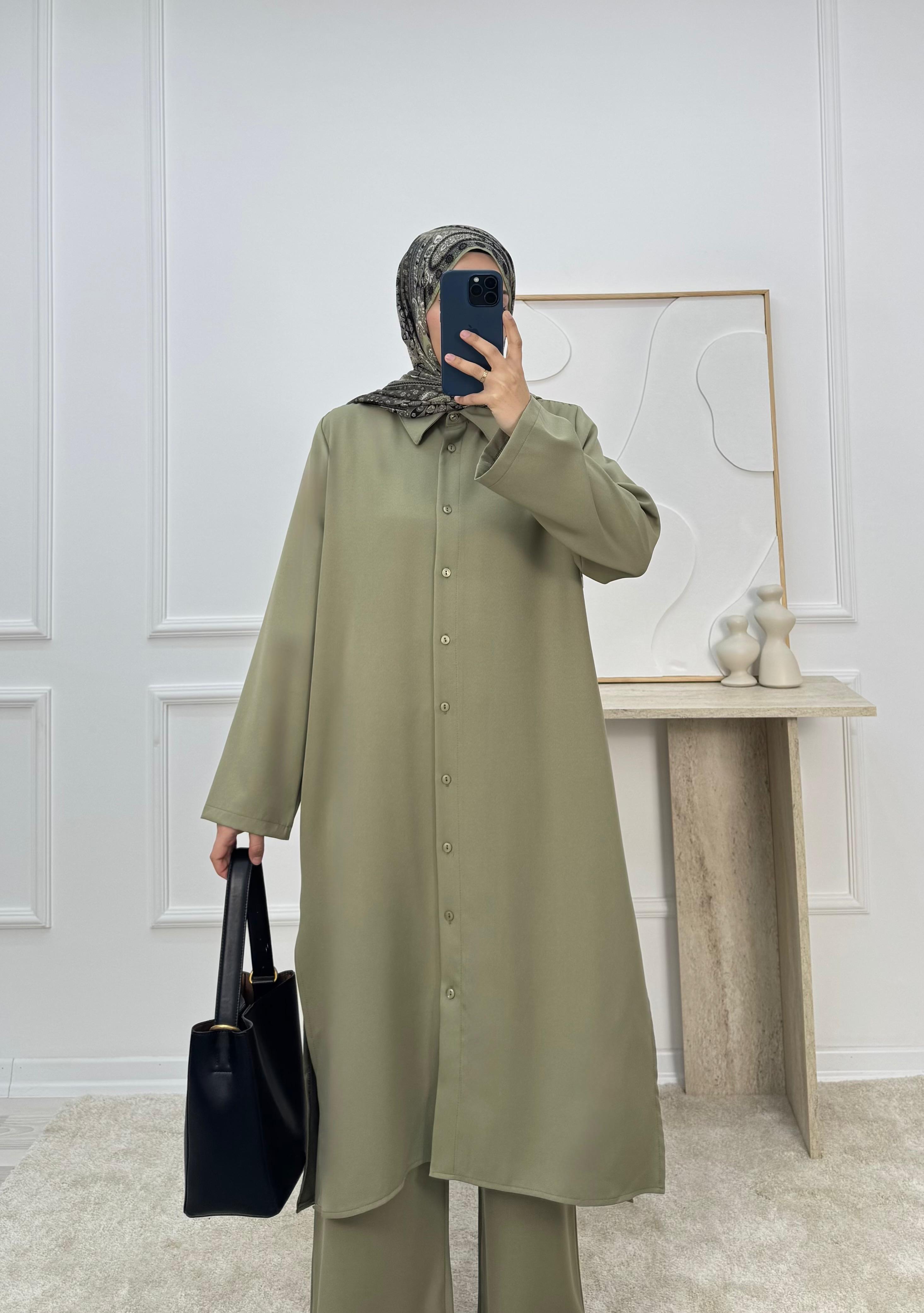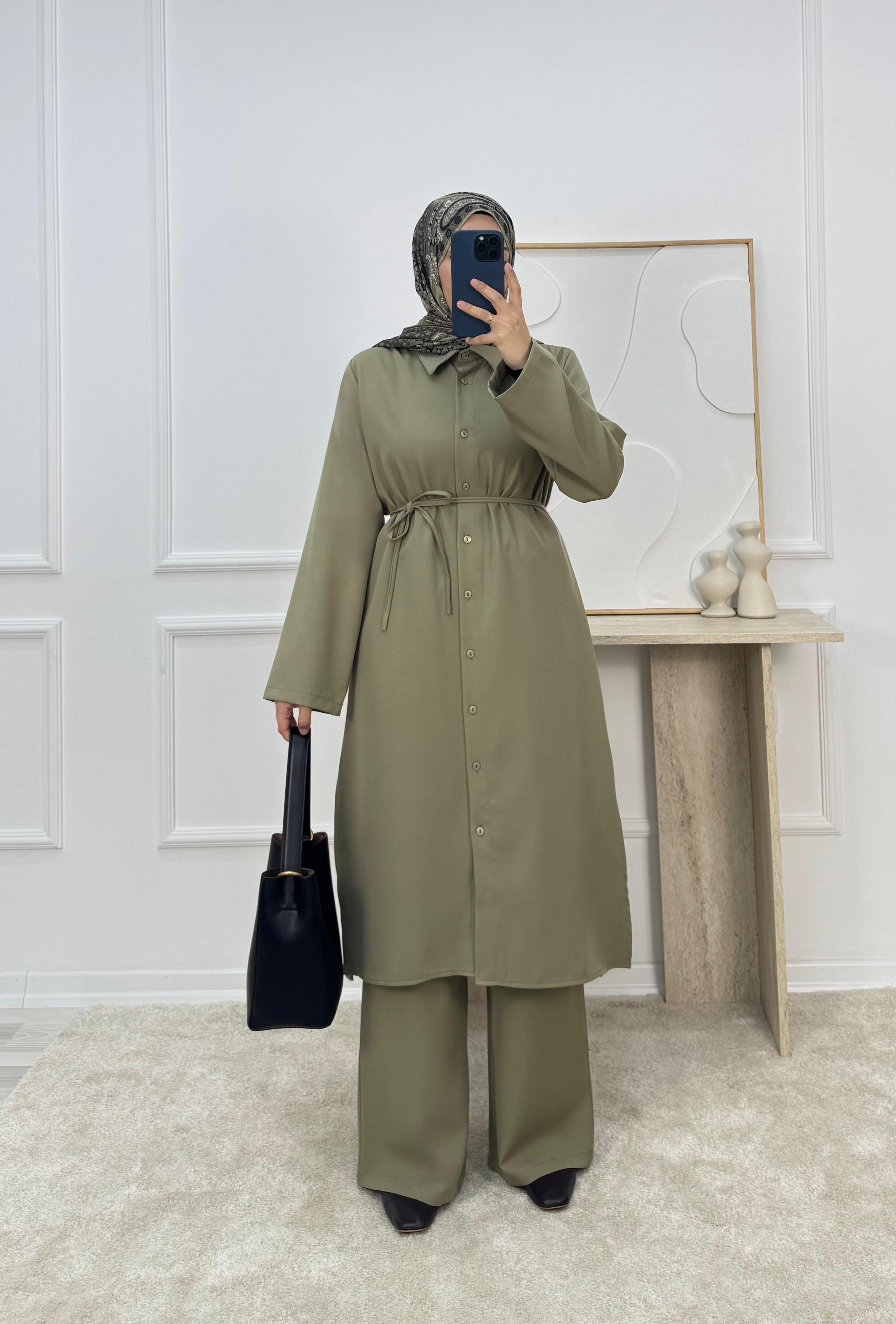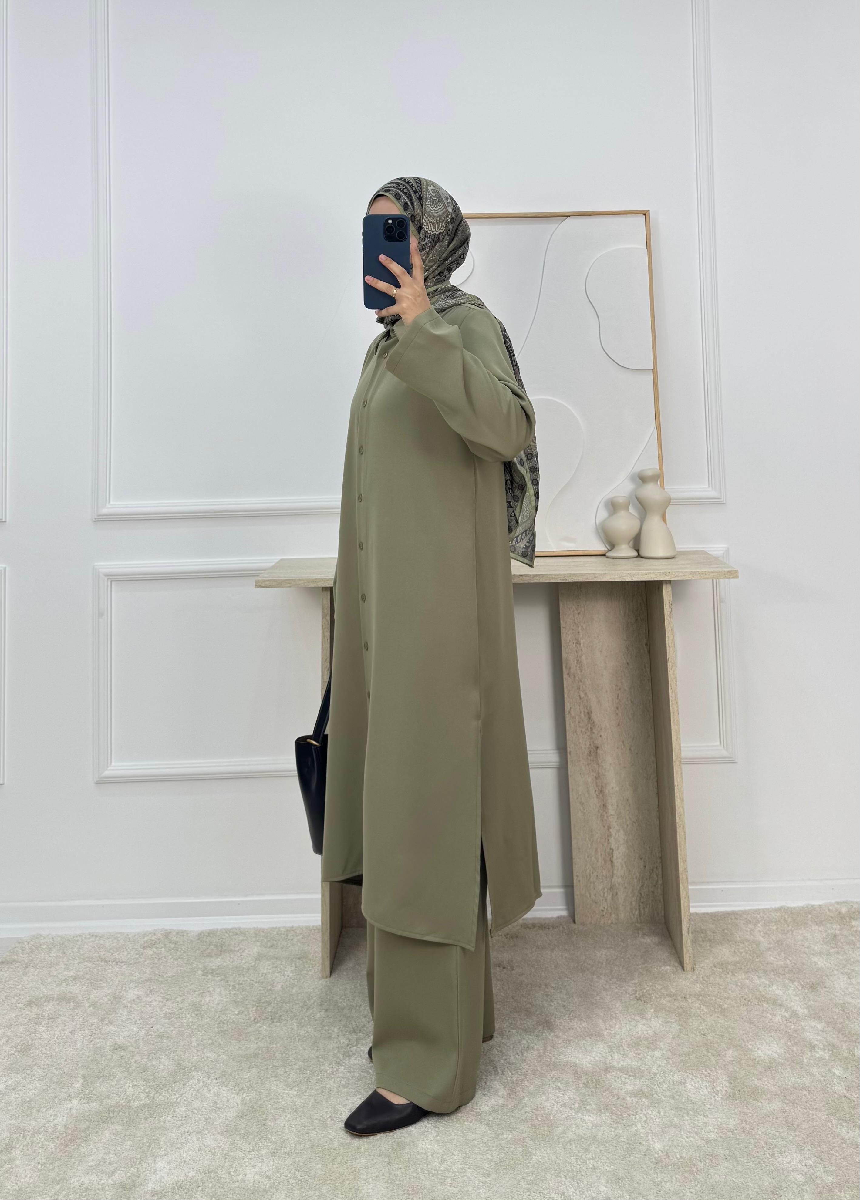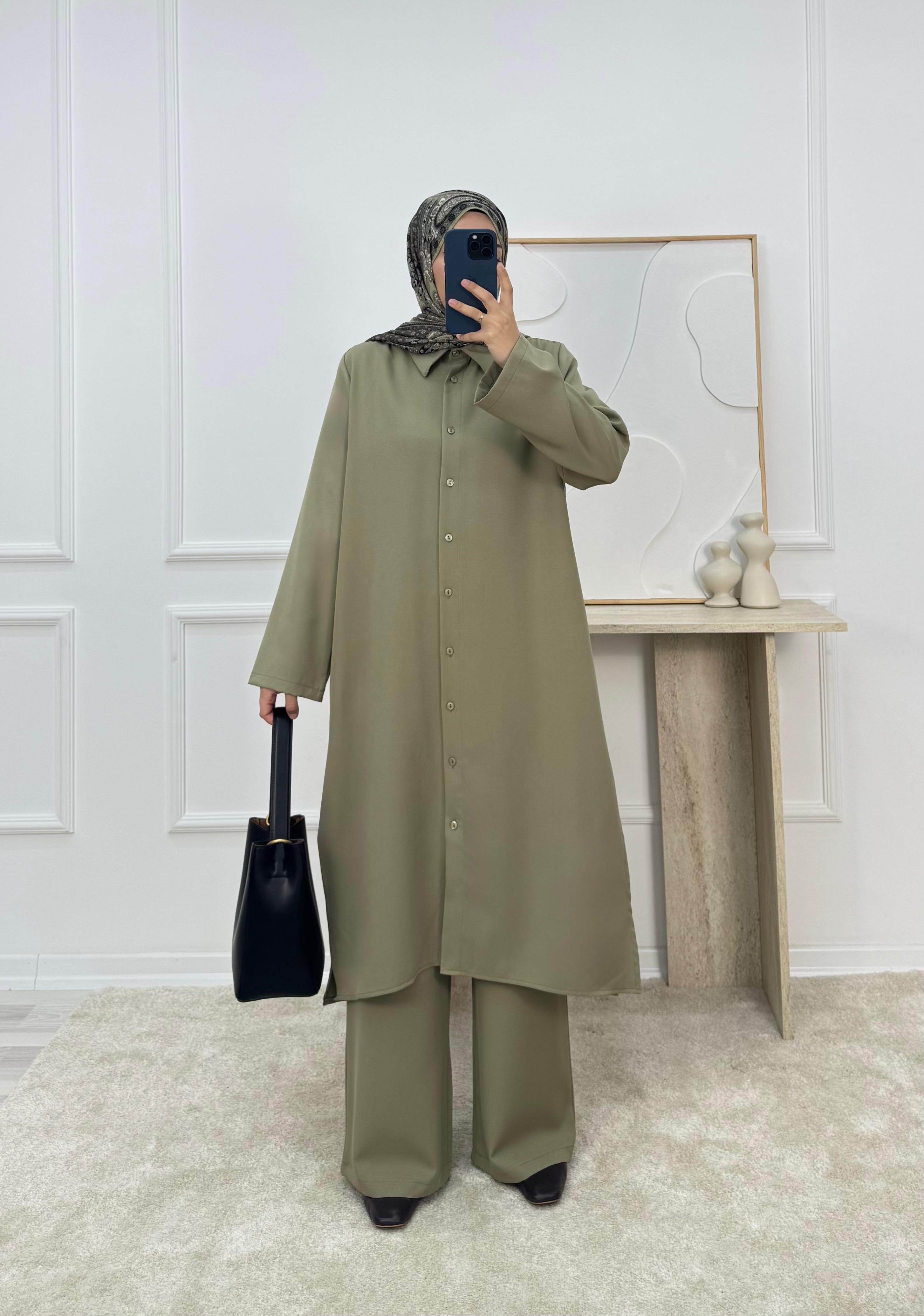 9592-dabıl krep kumaş pantolonlu takım-yeşil (9592)