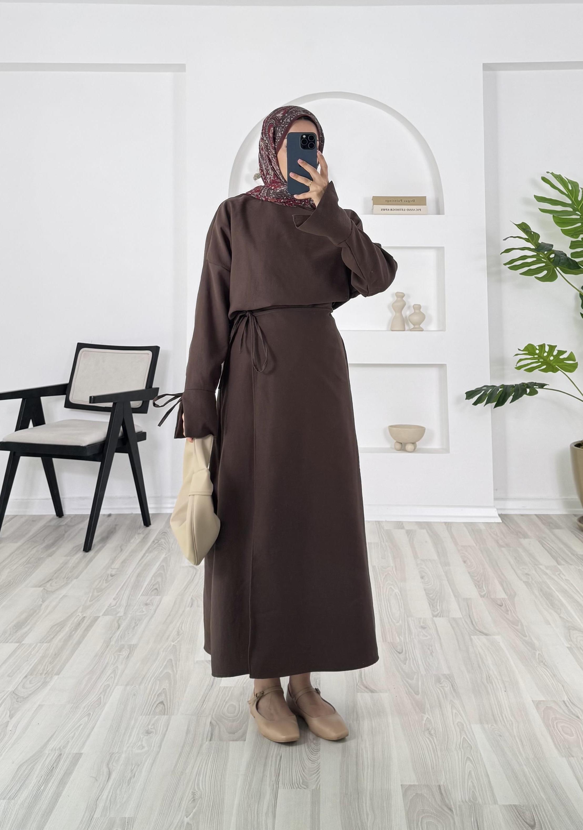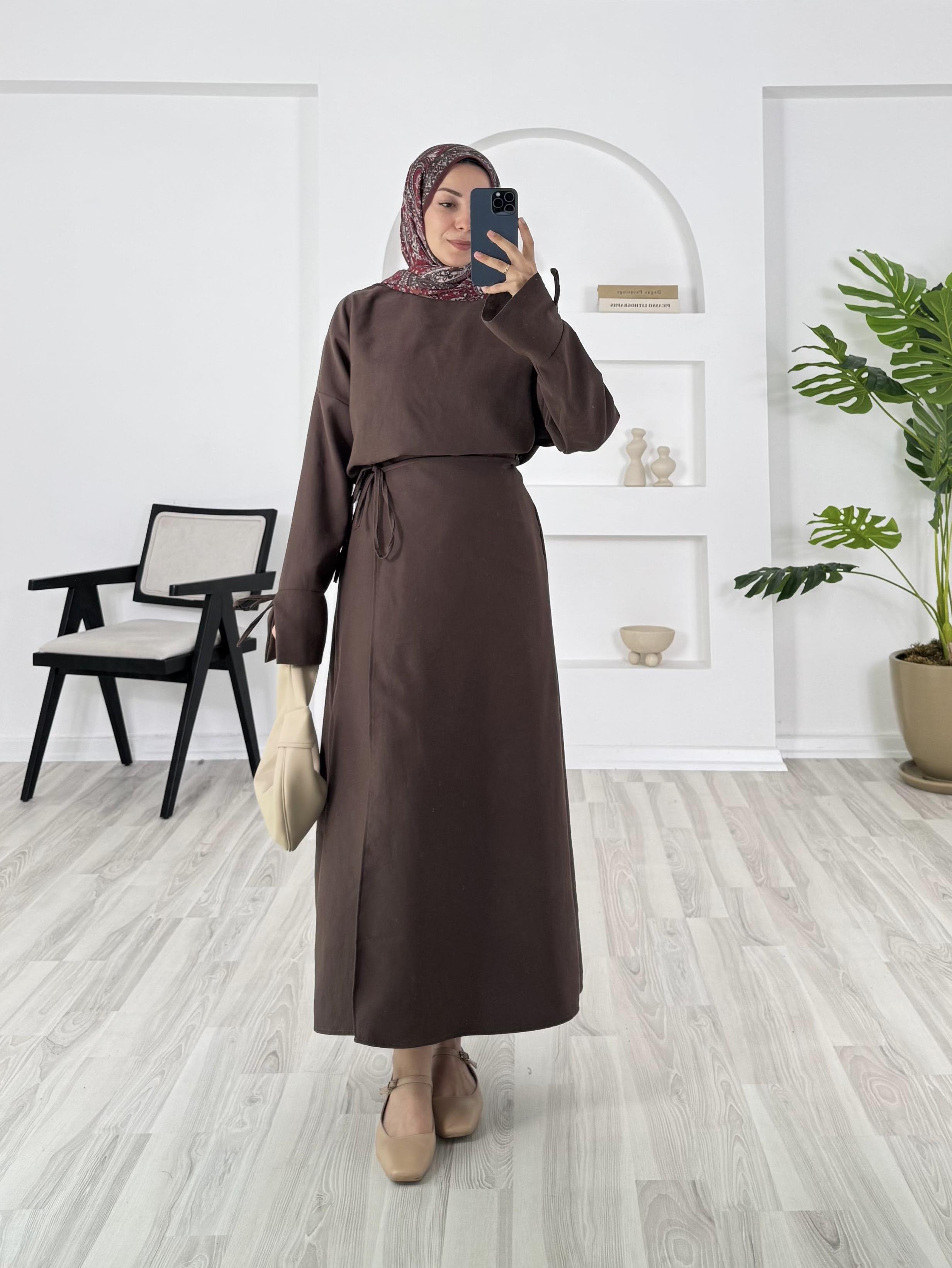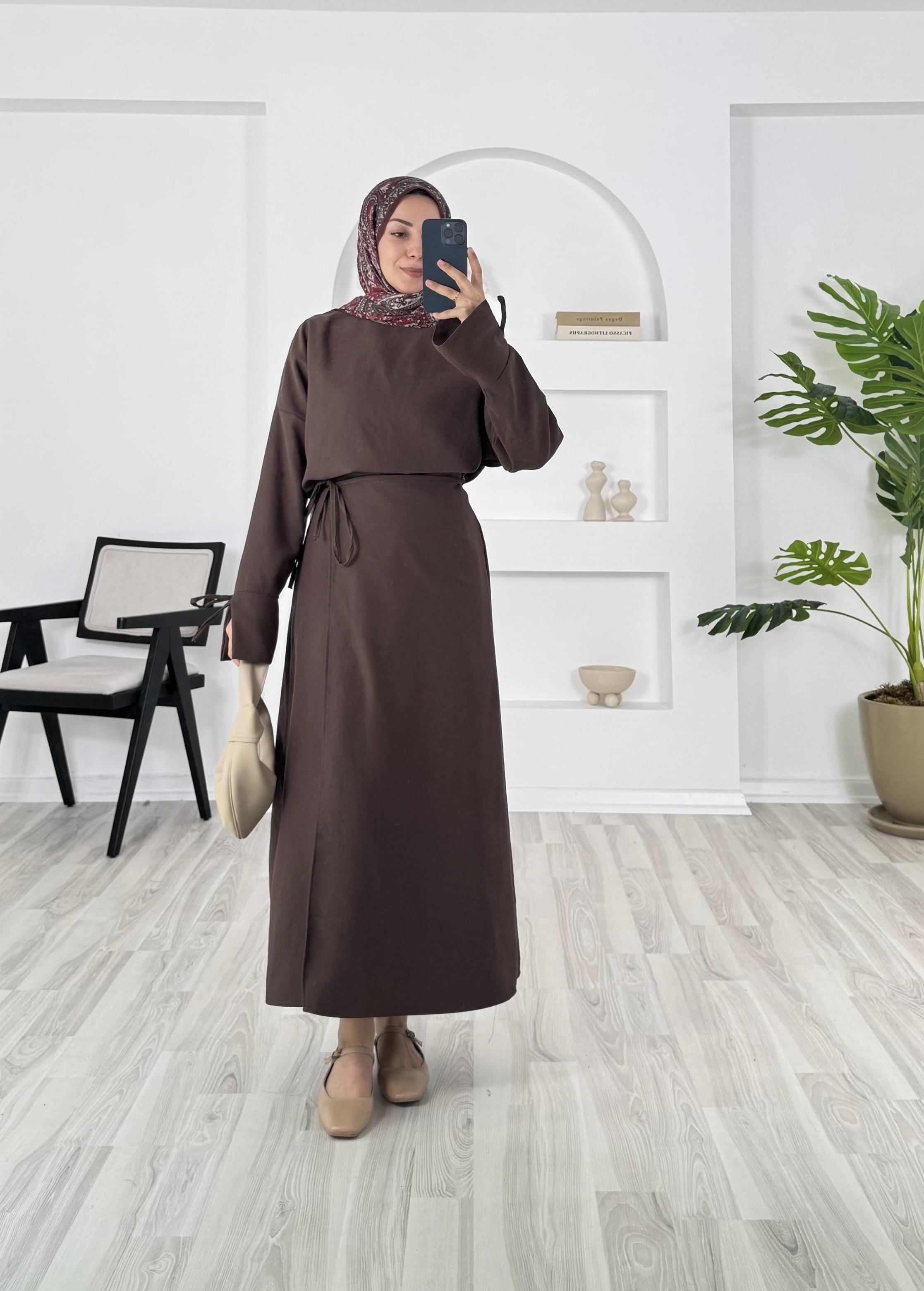 96311 - inci kumaş kolları ipli etekli, takım - acı kahve (96311)
