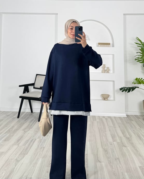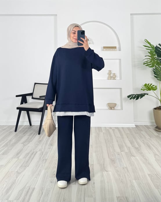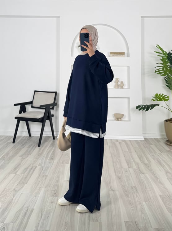 9636 - oysho kumaş bol paça pantolonlu takım - lacivert (9636)