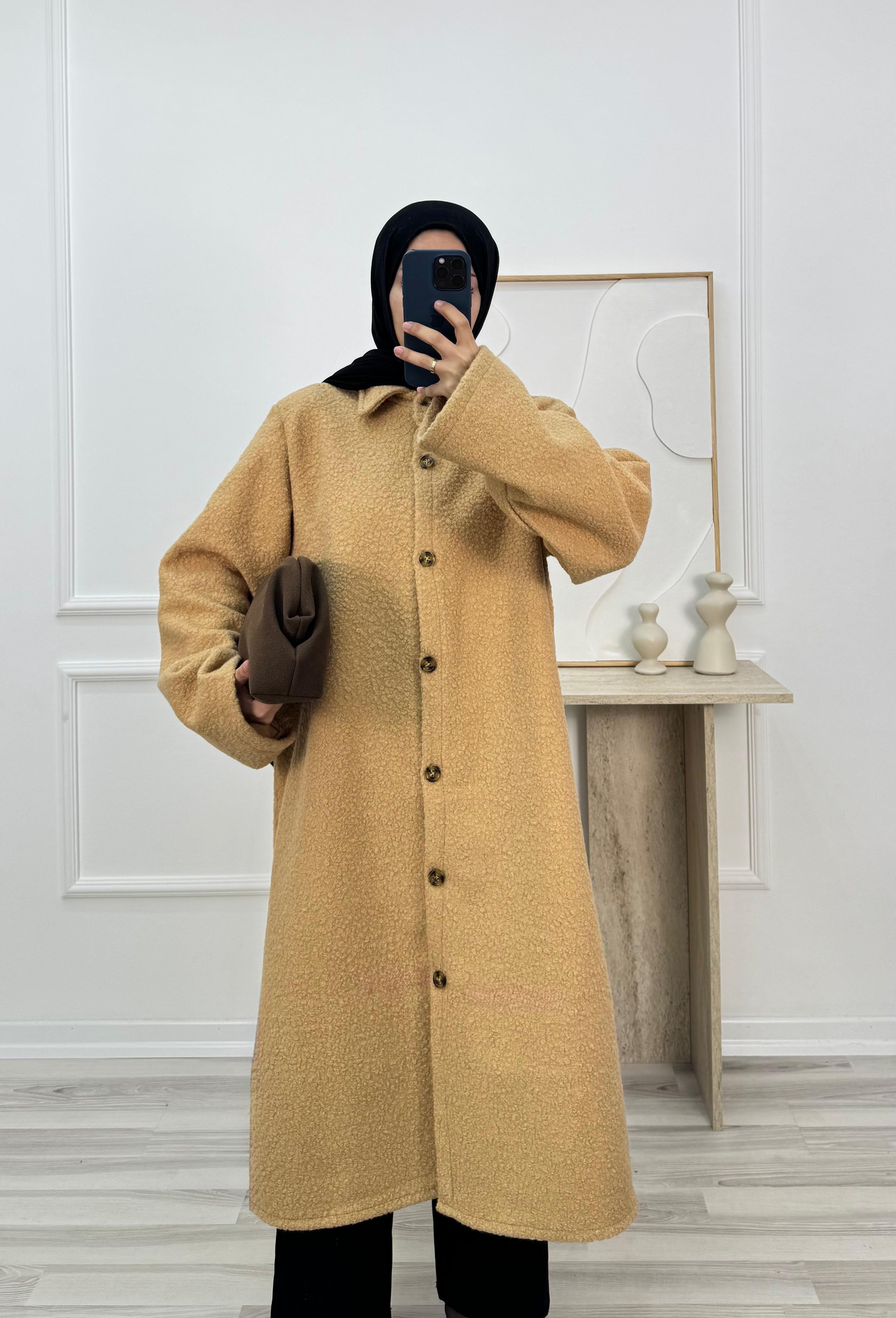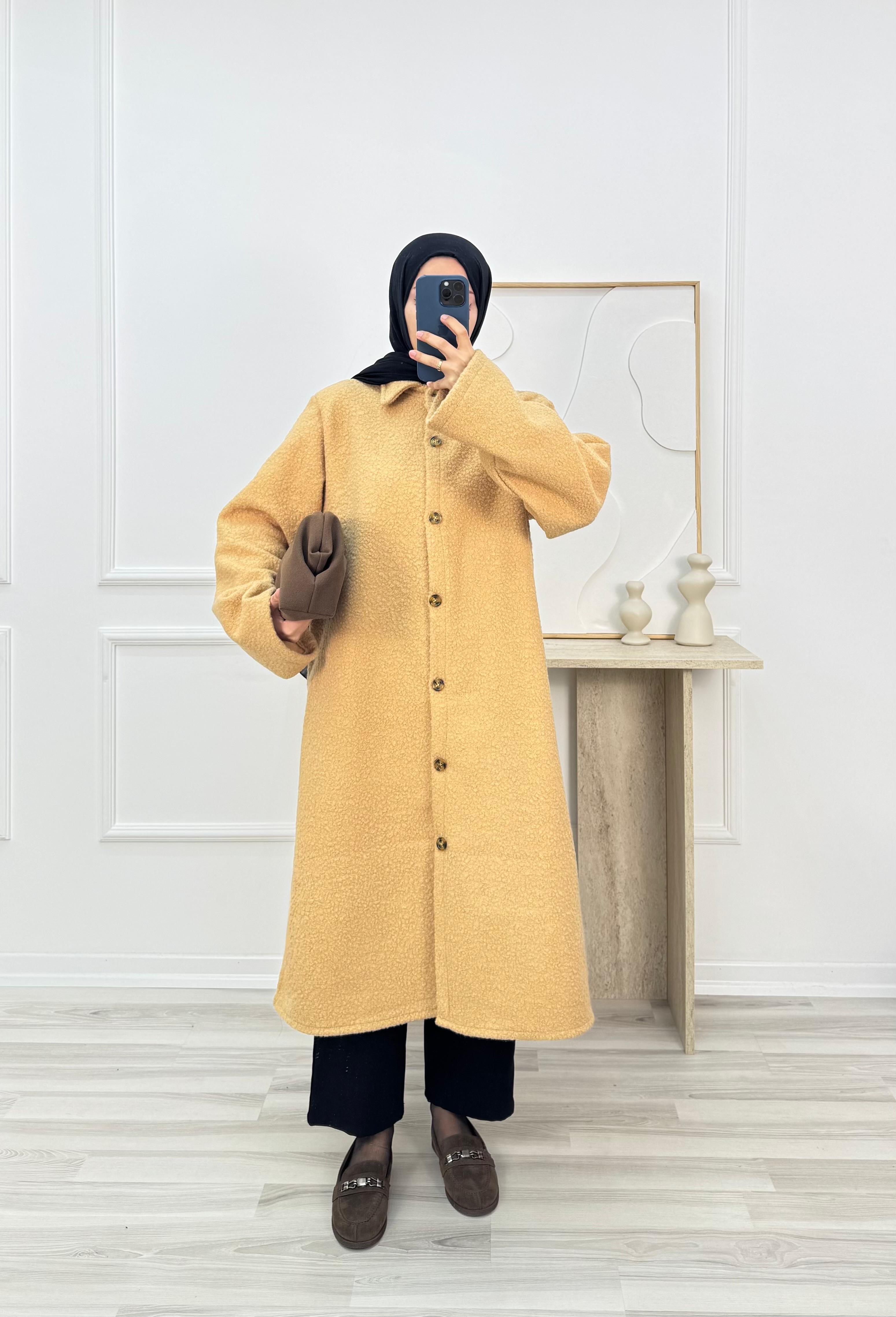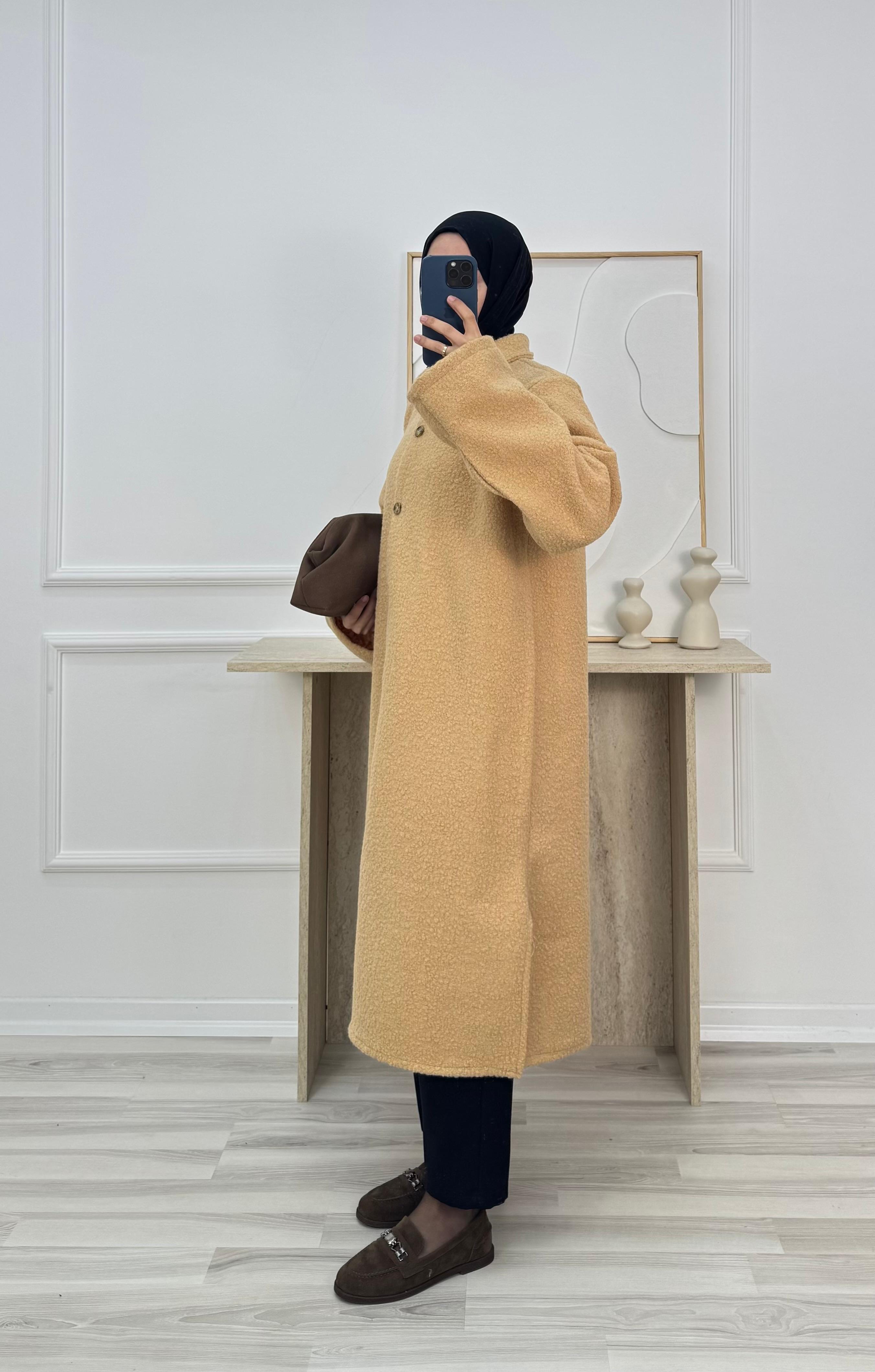 9685-buklet kumaş düğmeli kaban-sütlü kahve (9685)