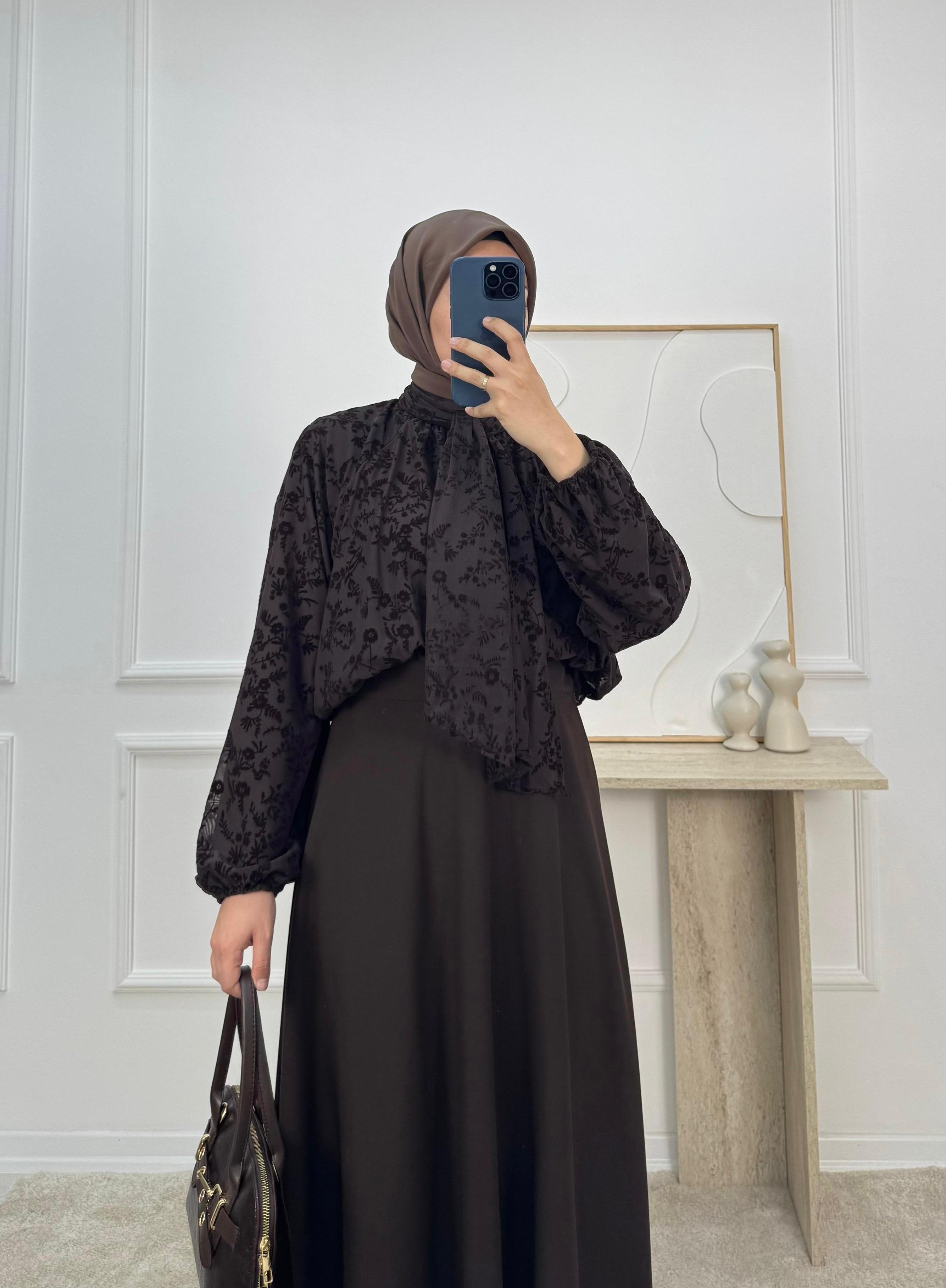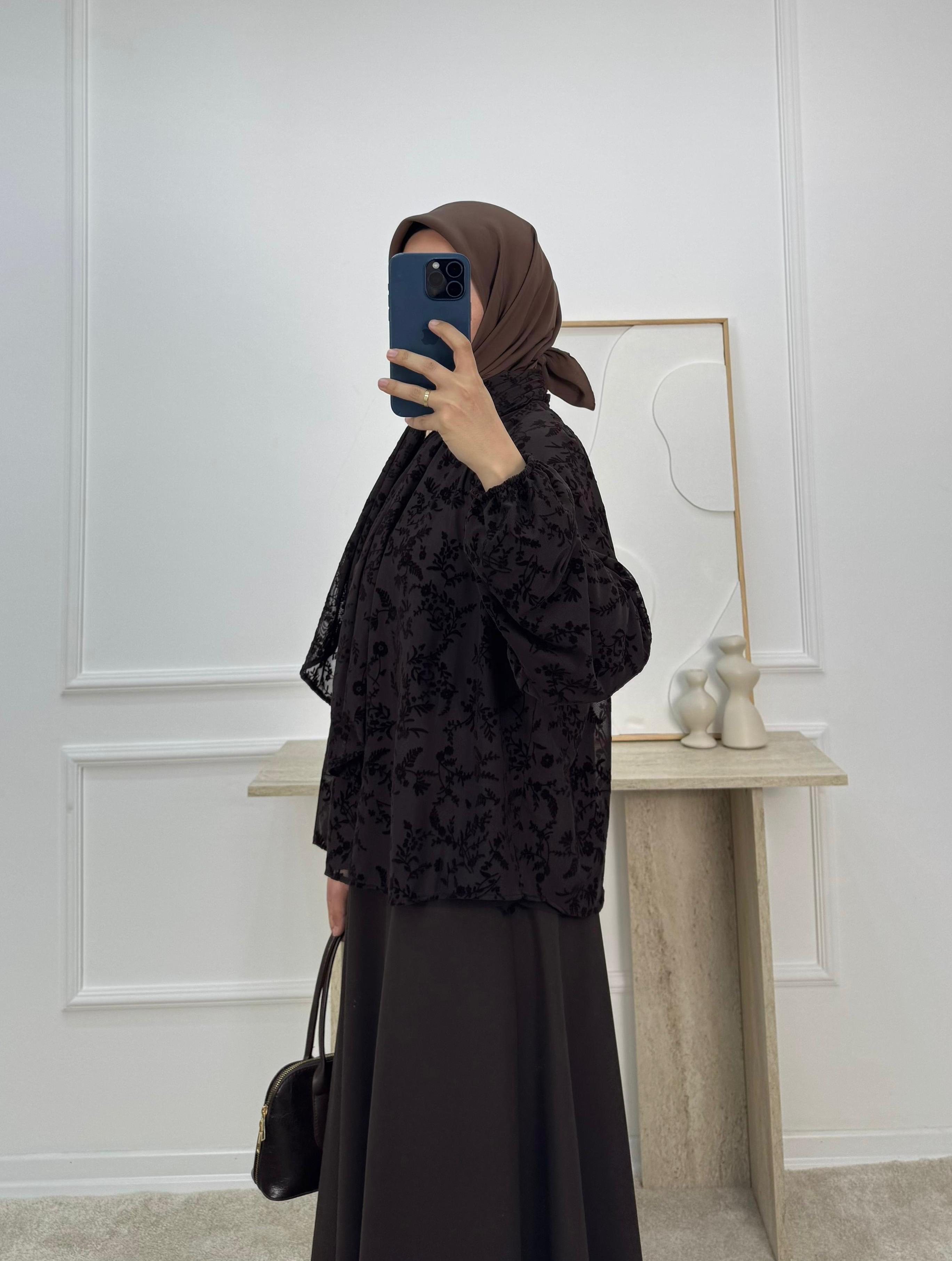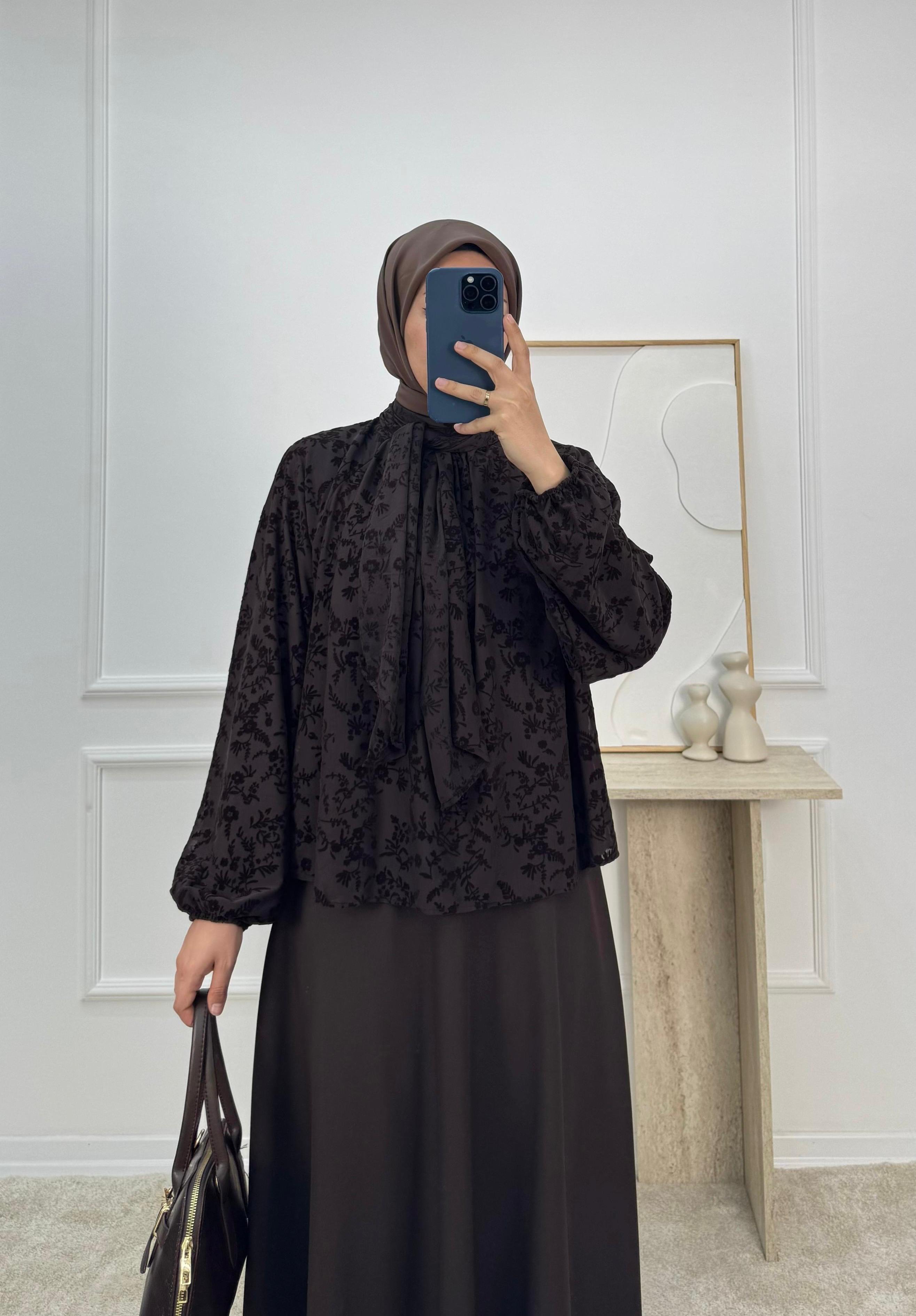 9736 - önü baglamalı flok baskı bluz-acı kahve (9736)