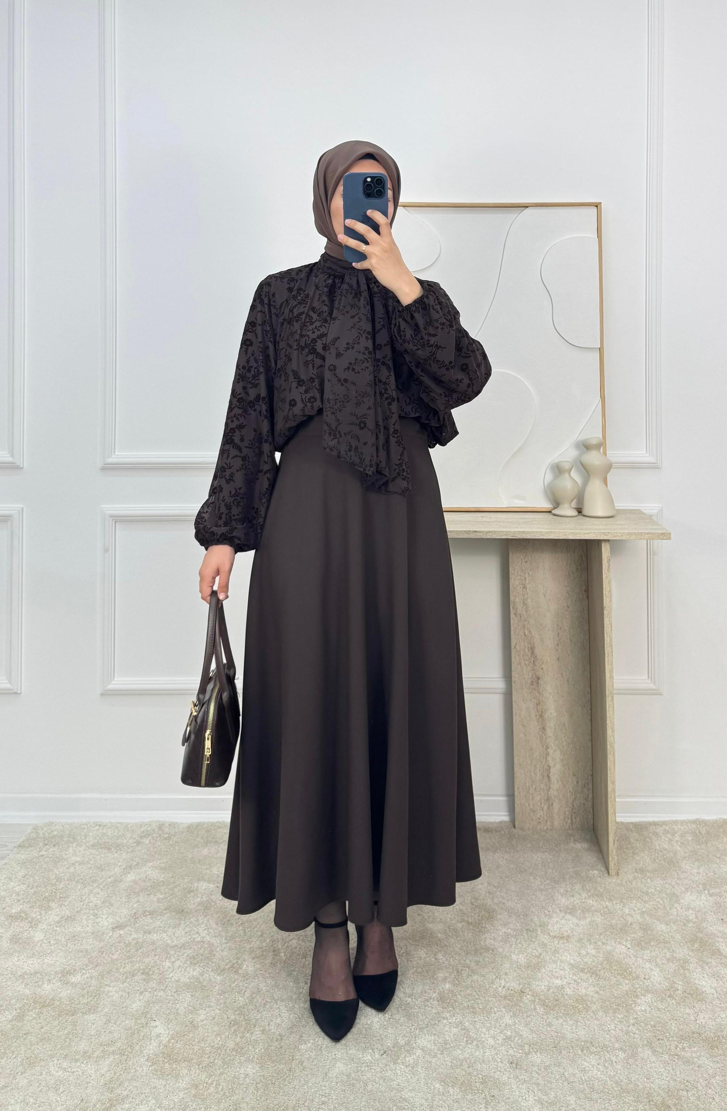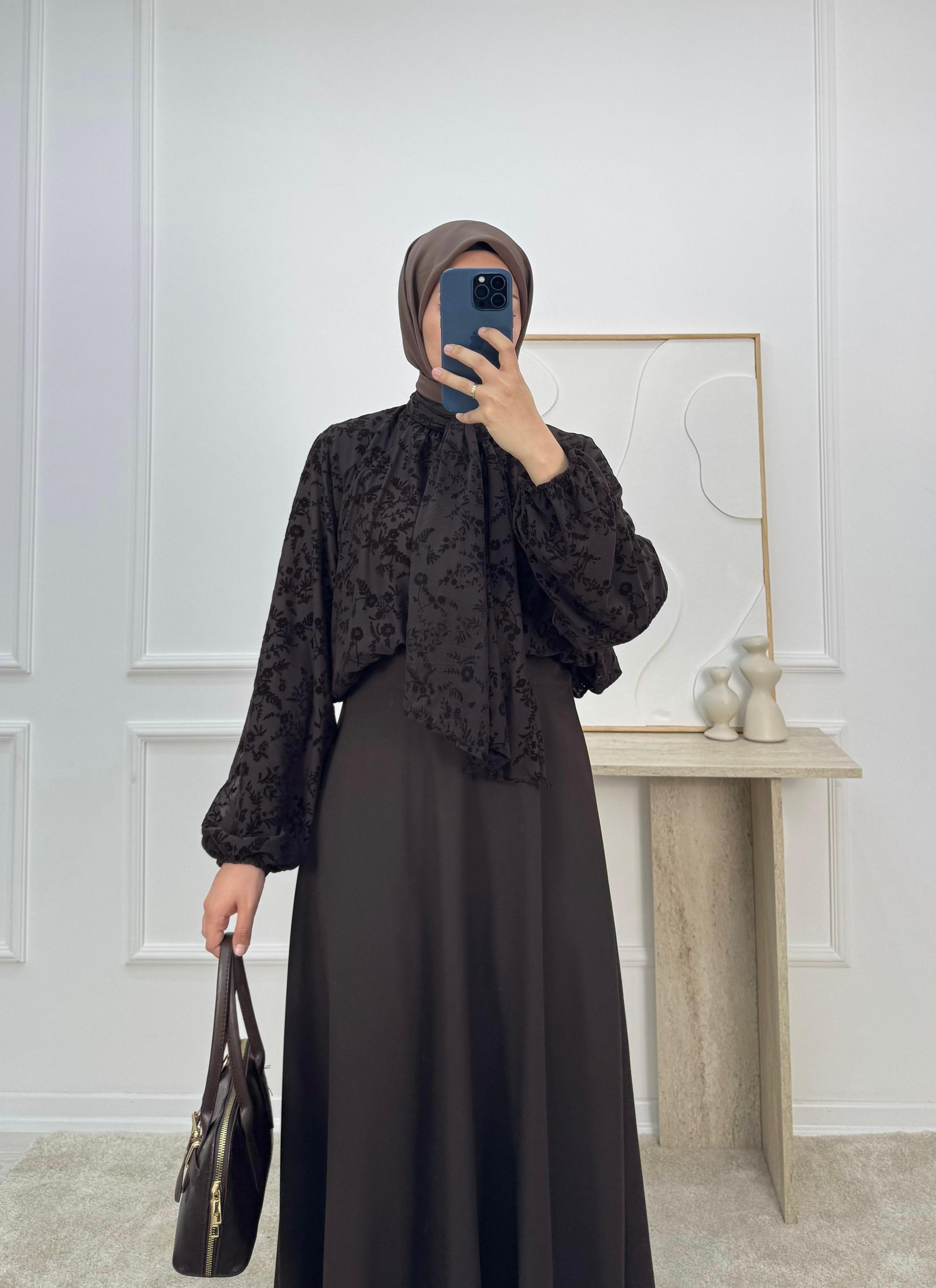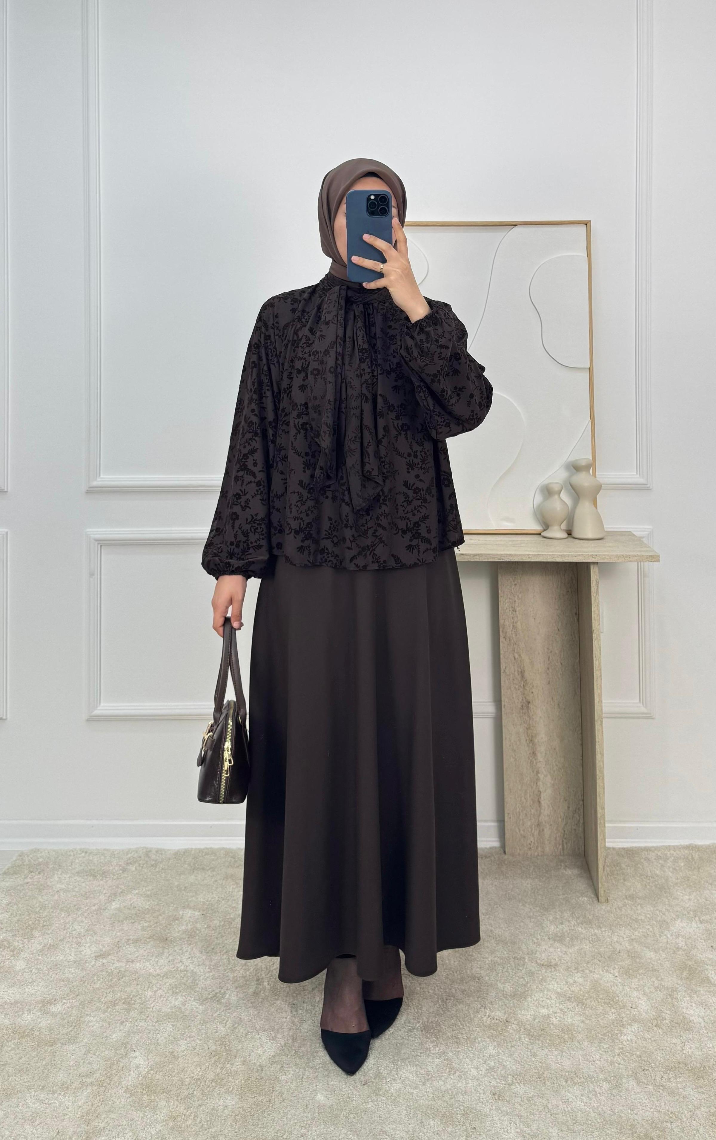 9736 - önü baglamalı flok baskı bluz-acı kahve (9736)