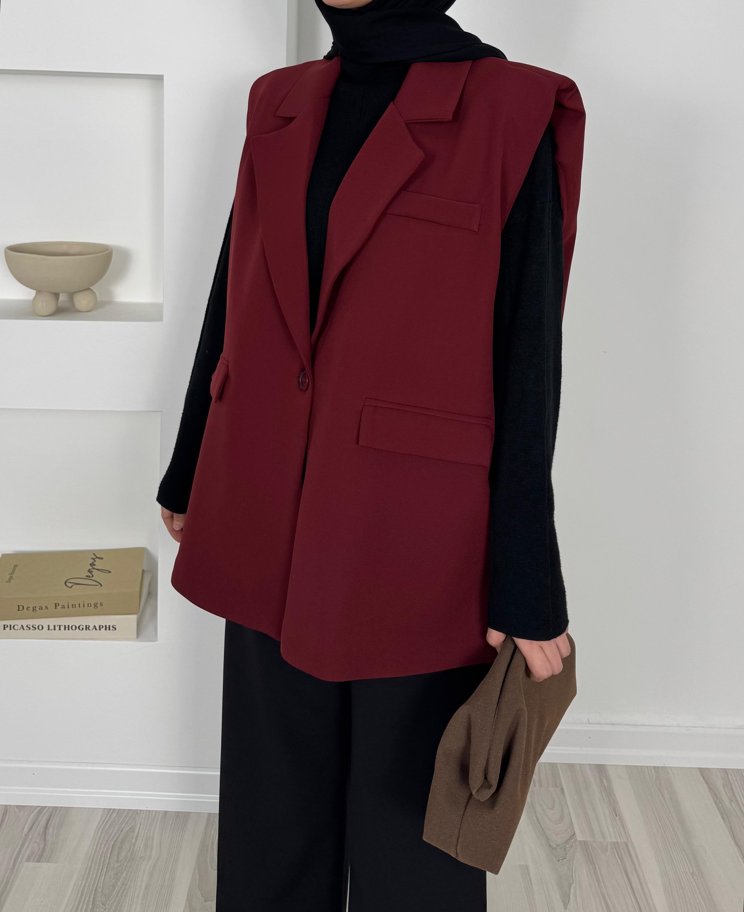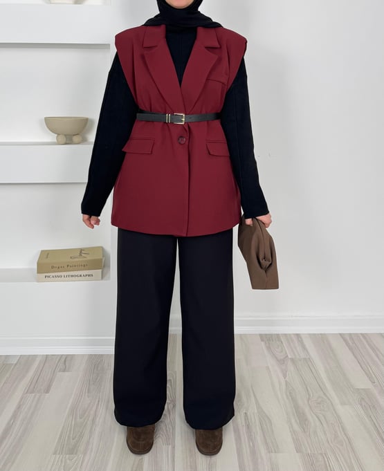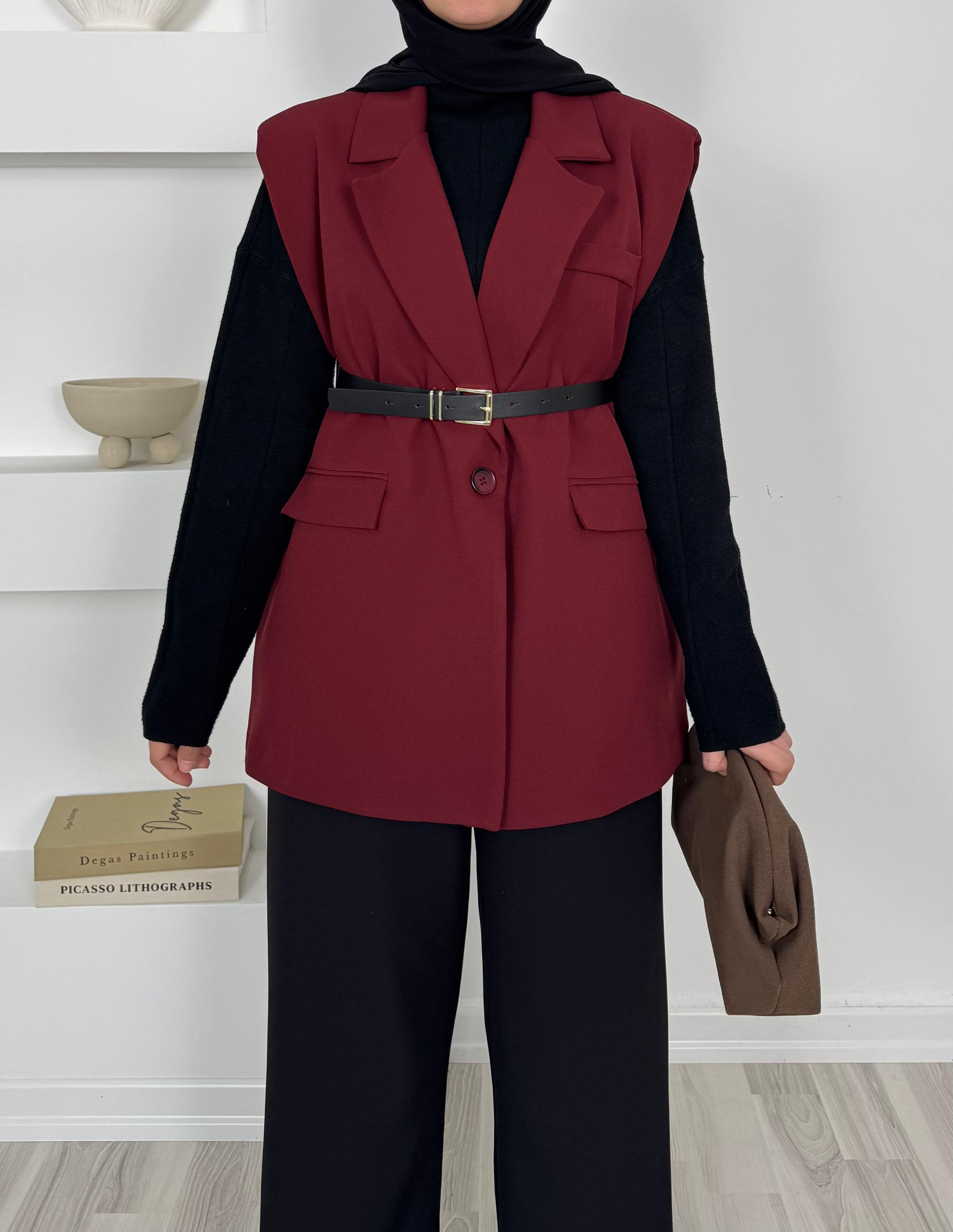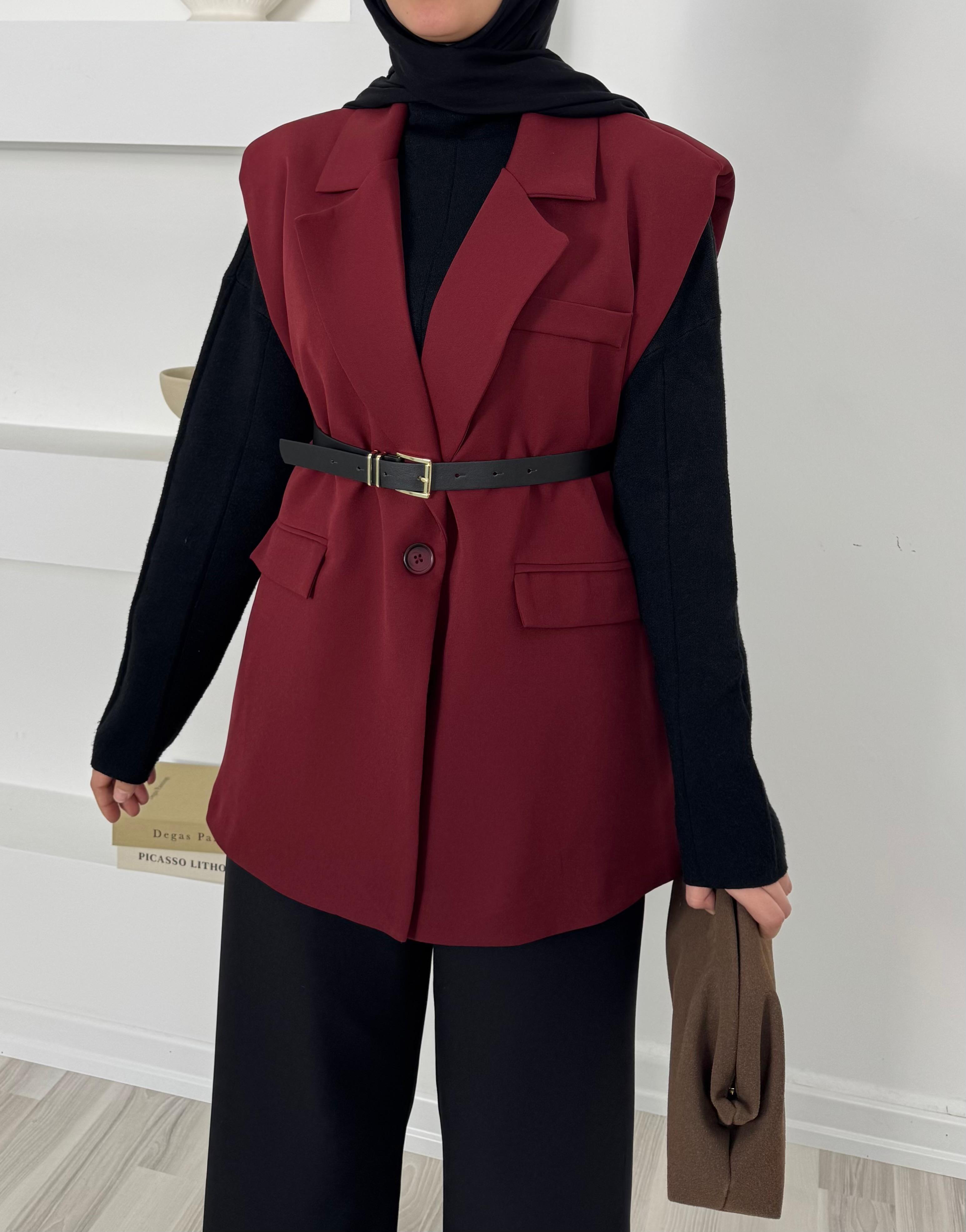 9824-vatkalı blazer kemerli yelek-bordo (9824)