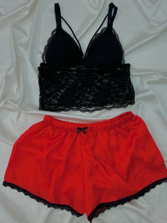 Ç028 - SATEN ŞORTLU BRALET TAKIM DESENLI - KIRMIZI (Ç028)