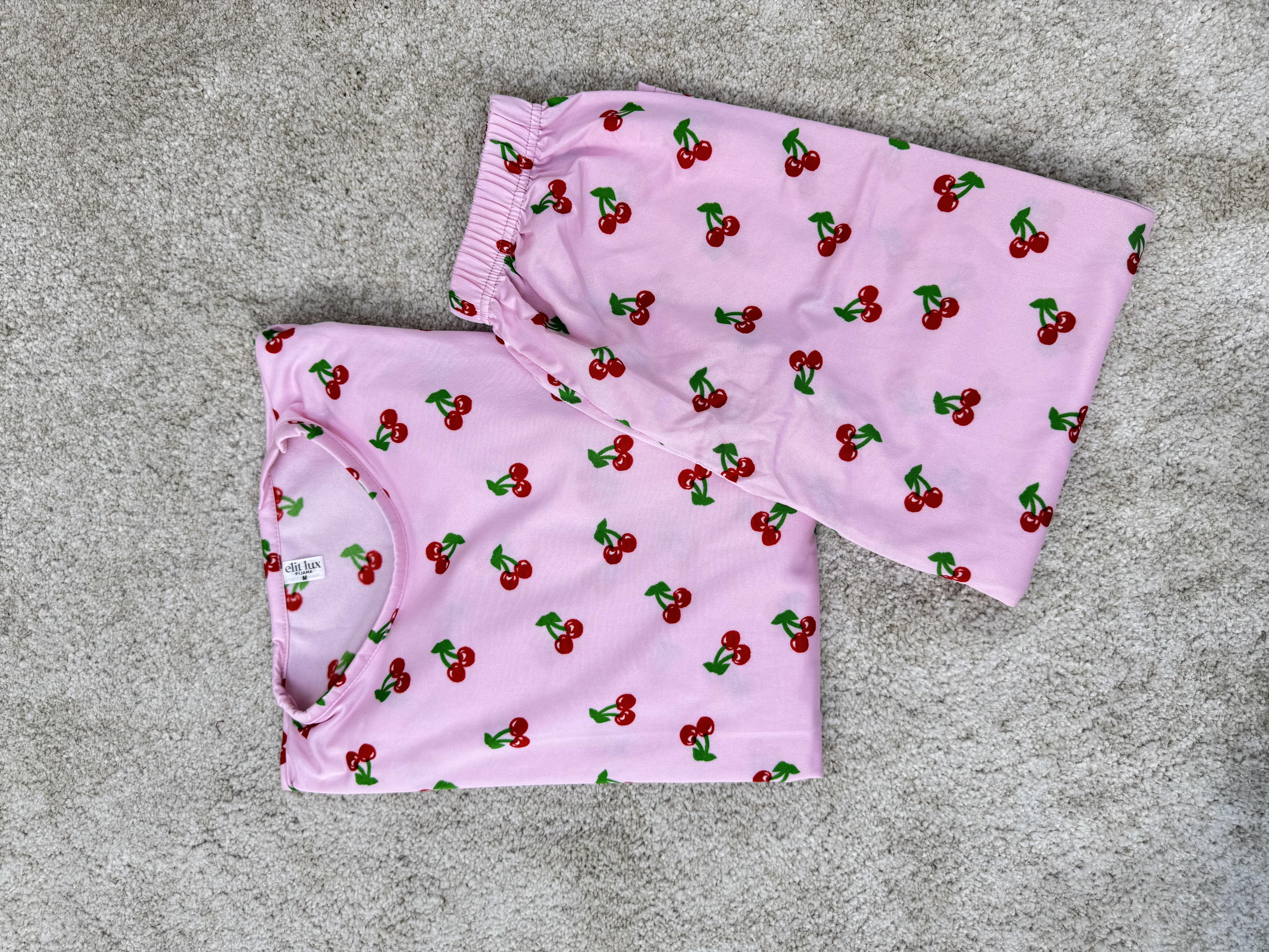 Ç1196-Milan kumaş uzun kollu kirazlı pijama takımı-pudra (Ç1196)
