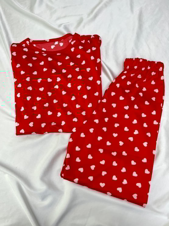 Ç1196-Milan kumaş uzun kollu küçük kalpli pijama takımı- kırmızı (Ç1196)