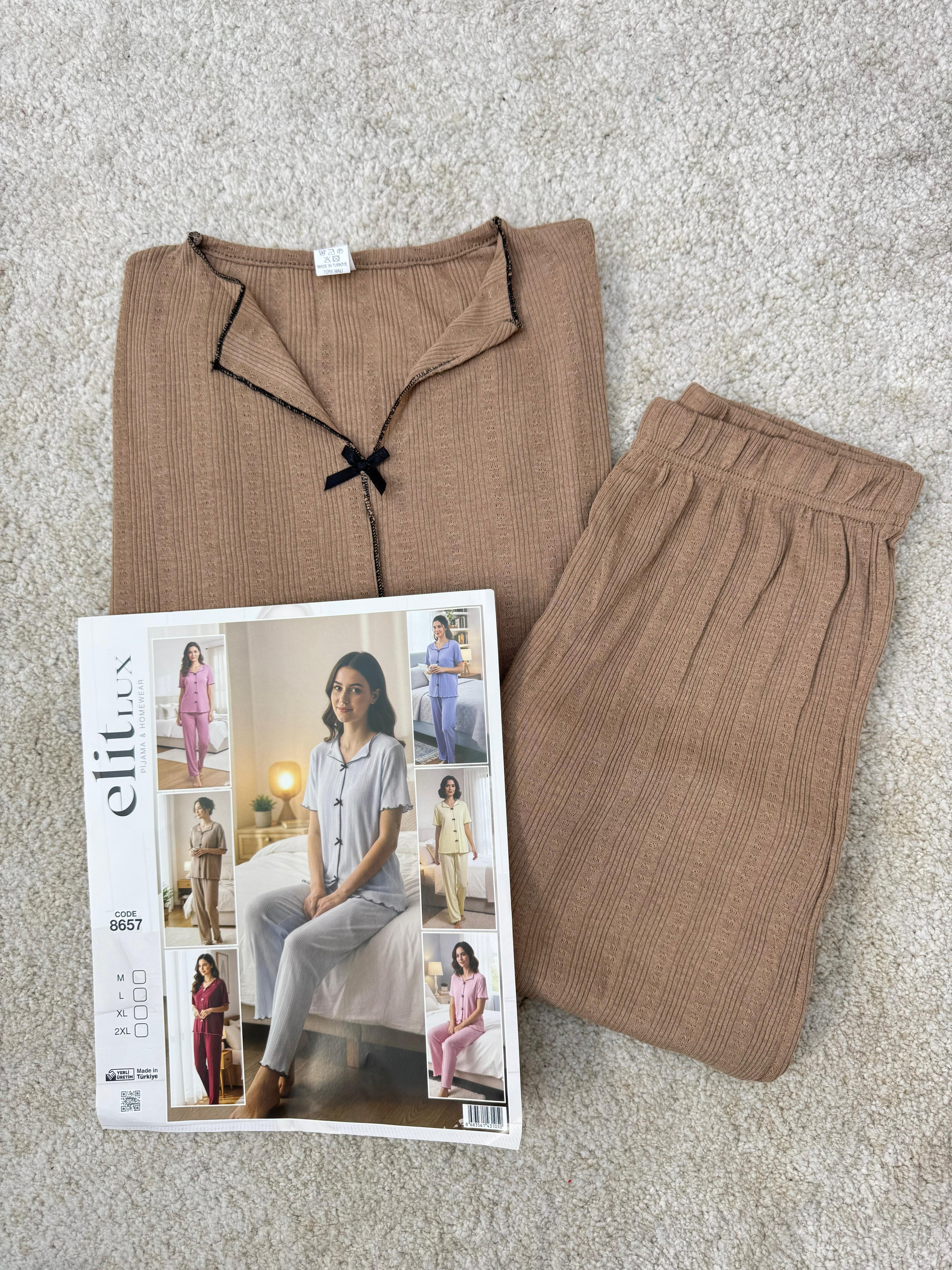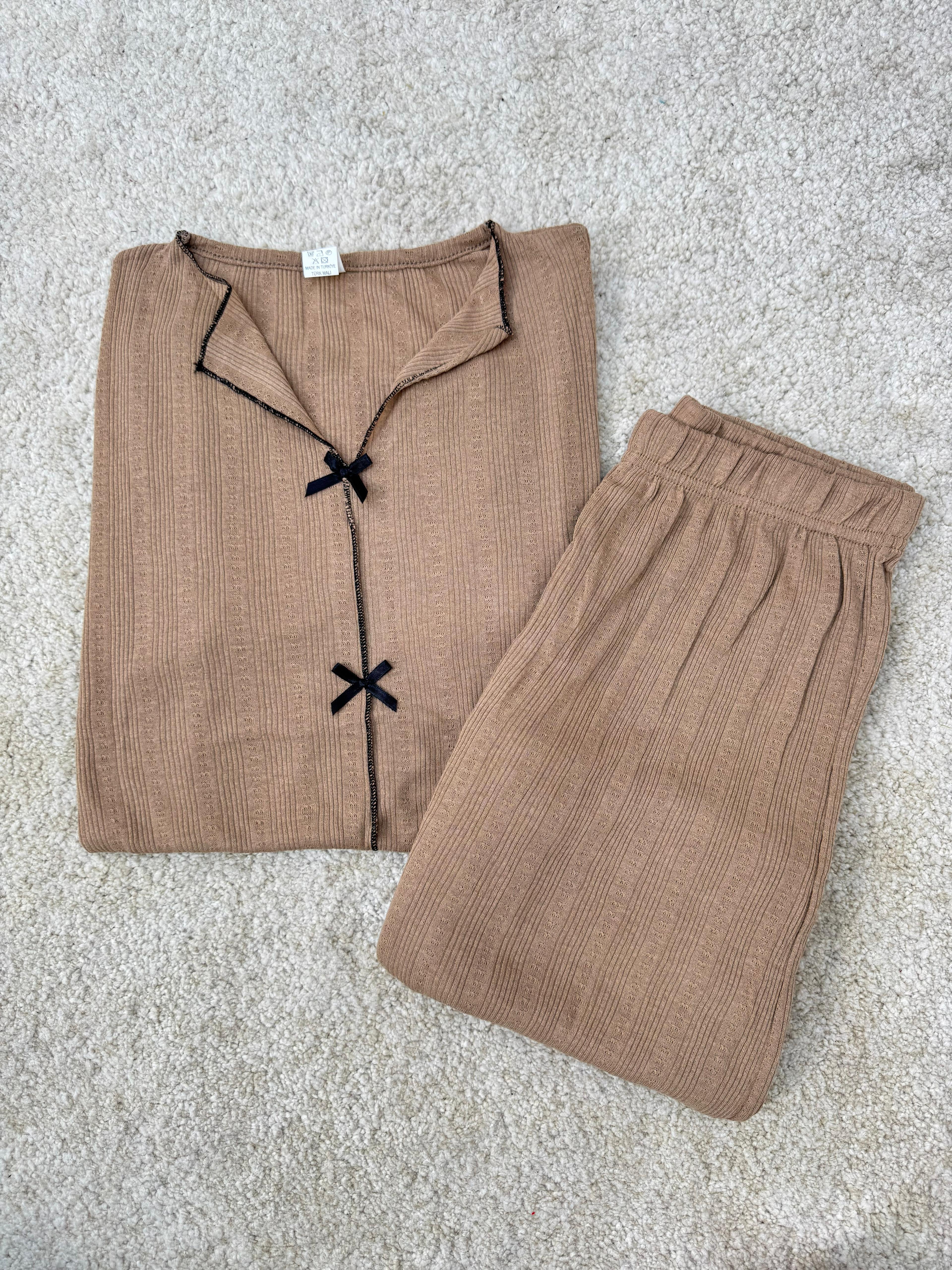 ç1315-zincir kumaş önü fiyonklu pijama takımı-kahve (ç1315)