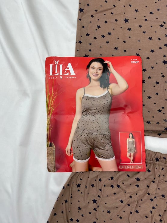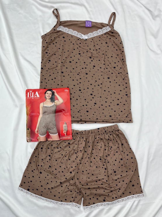 Ç13587 - DANTEL DETAYLI YILDIZ DESENLI ŞORTLU TAKIM - KAHVERENGI
