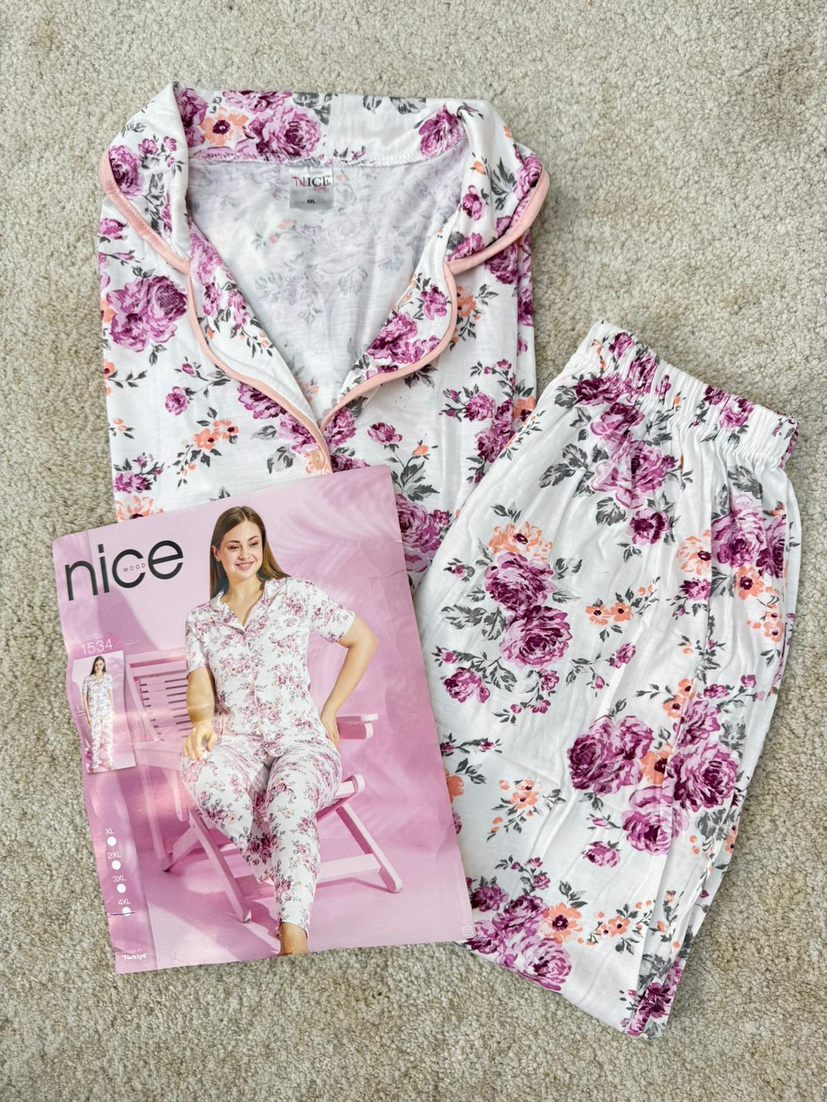 ç1534-milan kumaş büyük beden kısa kollu çiçekli pijama takımı -beyaz (ç1534)