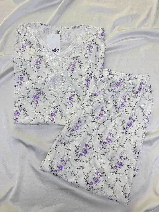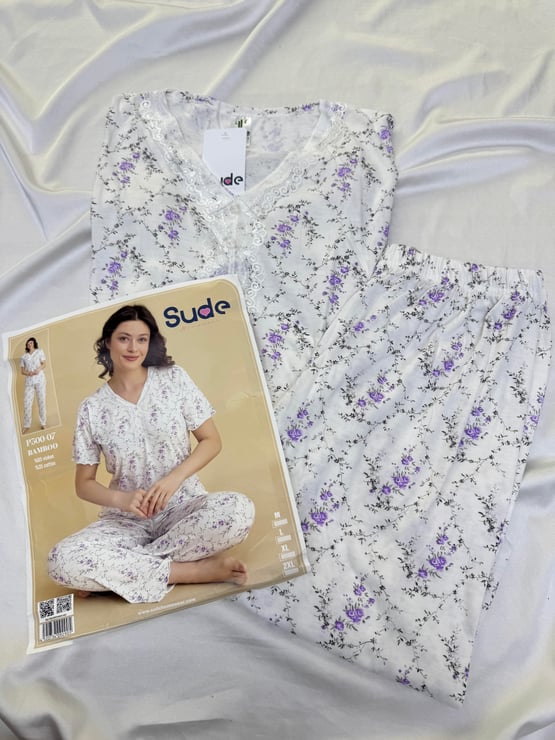 ç300-07 - kısa kollu bambu çiçekli pijama takımı - beyaz (ç300-07)