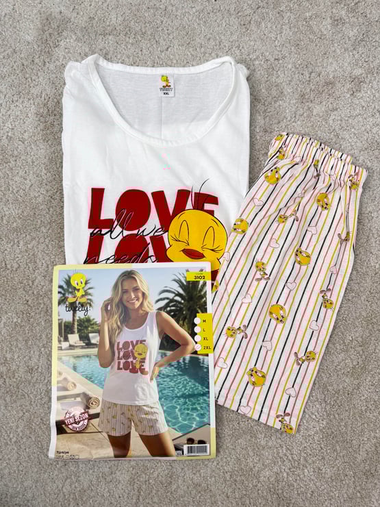 ç3102-sıfır kol şortlu tweety pijama takımı-beyaz (ç3102)