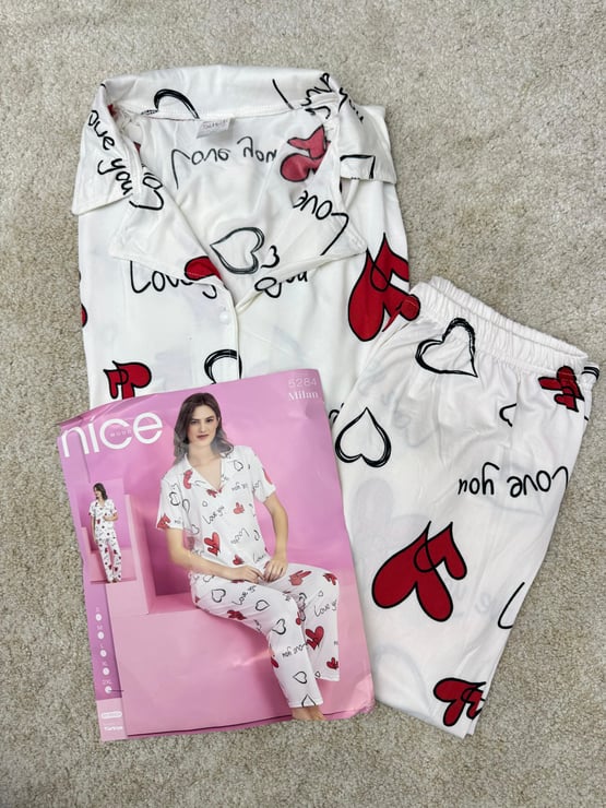 ç5284-milan kumaş gömlek yaka love pijama takımı-beyaz (ç5284)
