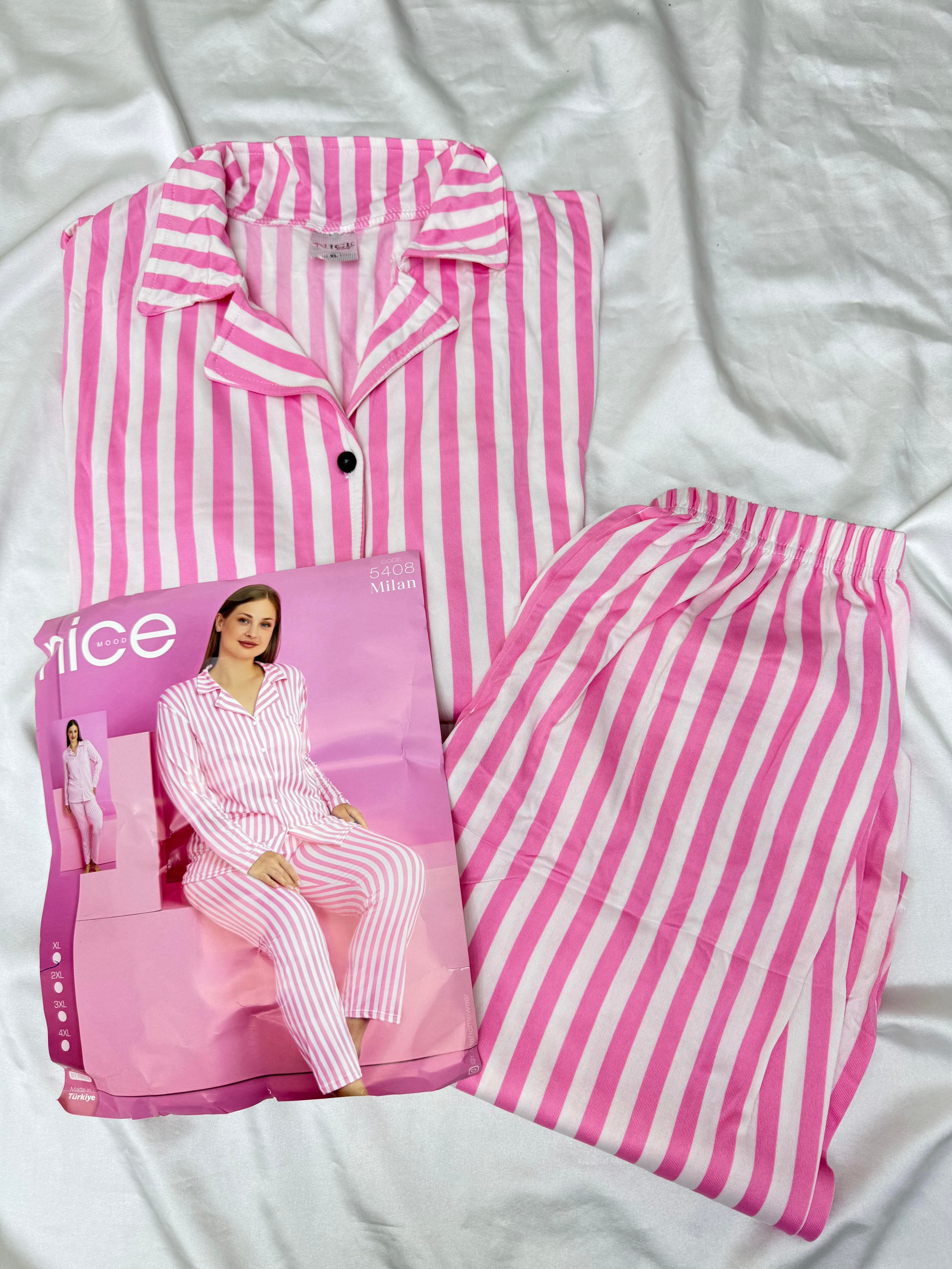 ç5408- milan kumaş büyük beden dügmeli çizgili pijama takımı - pembe (ç5408)