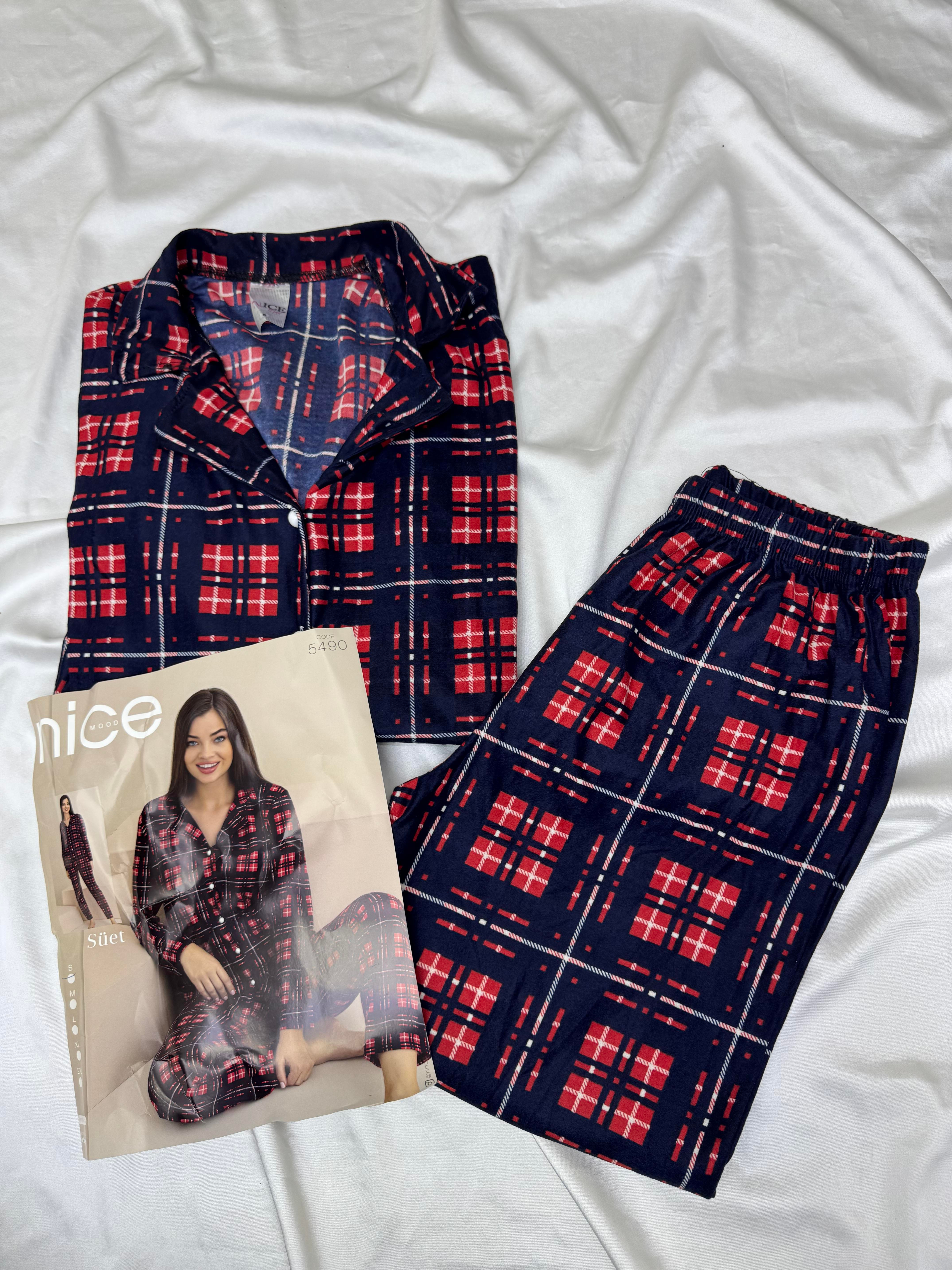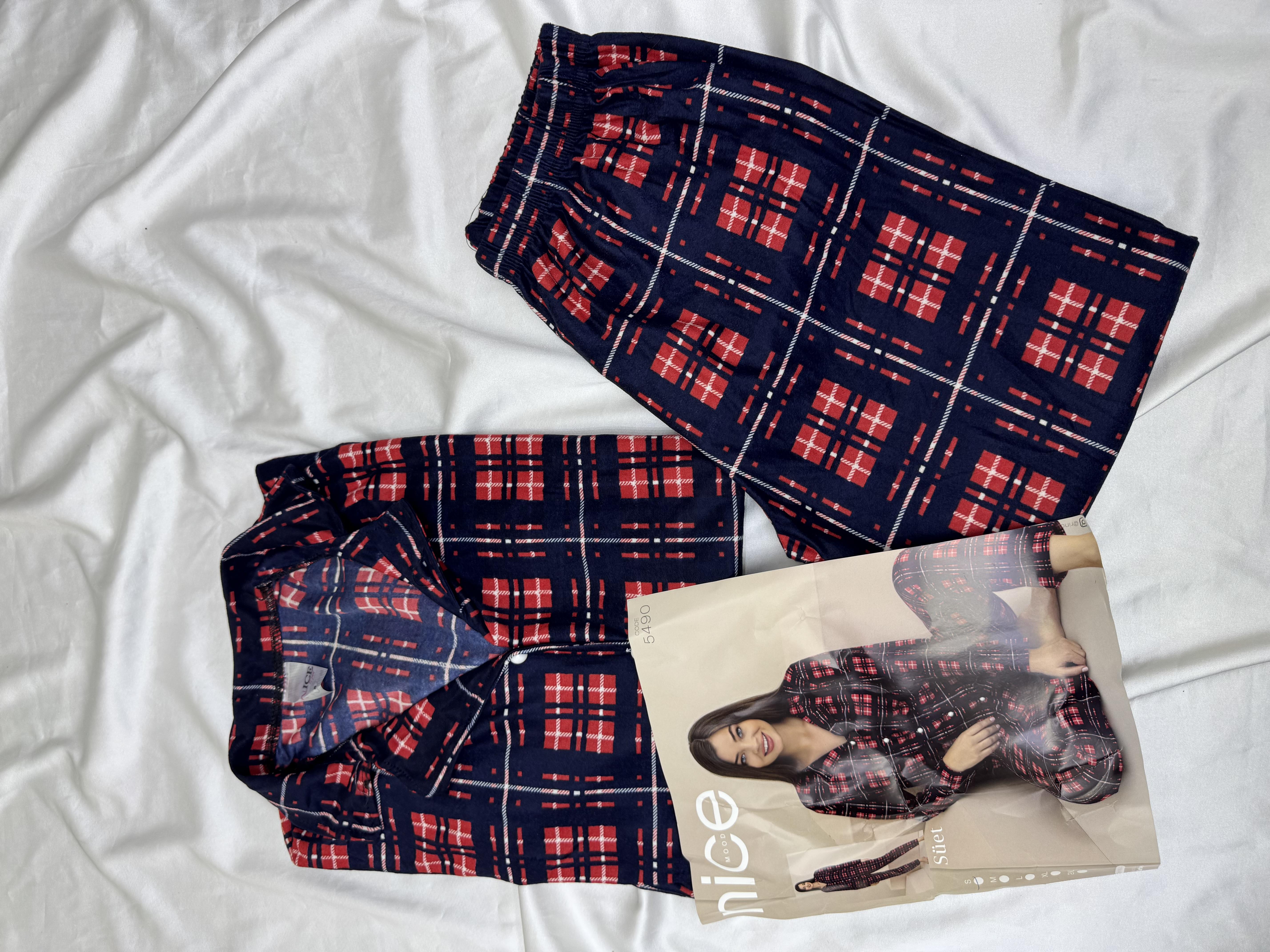 ç5490 - süet kumaş dügmeli kareli pijama takımı - siyah (ç5490)