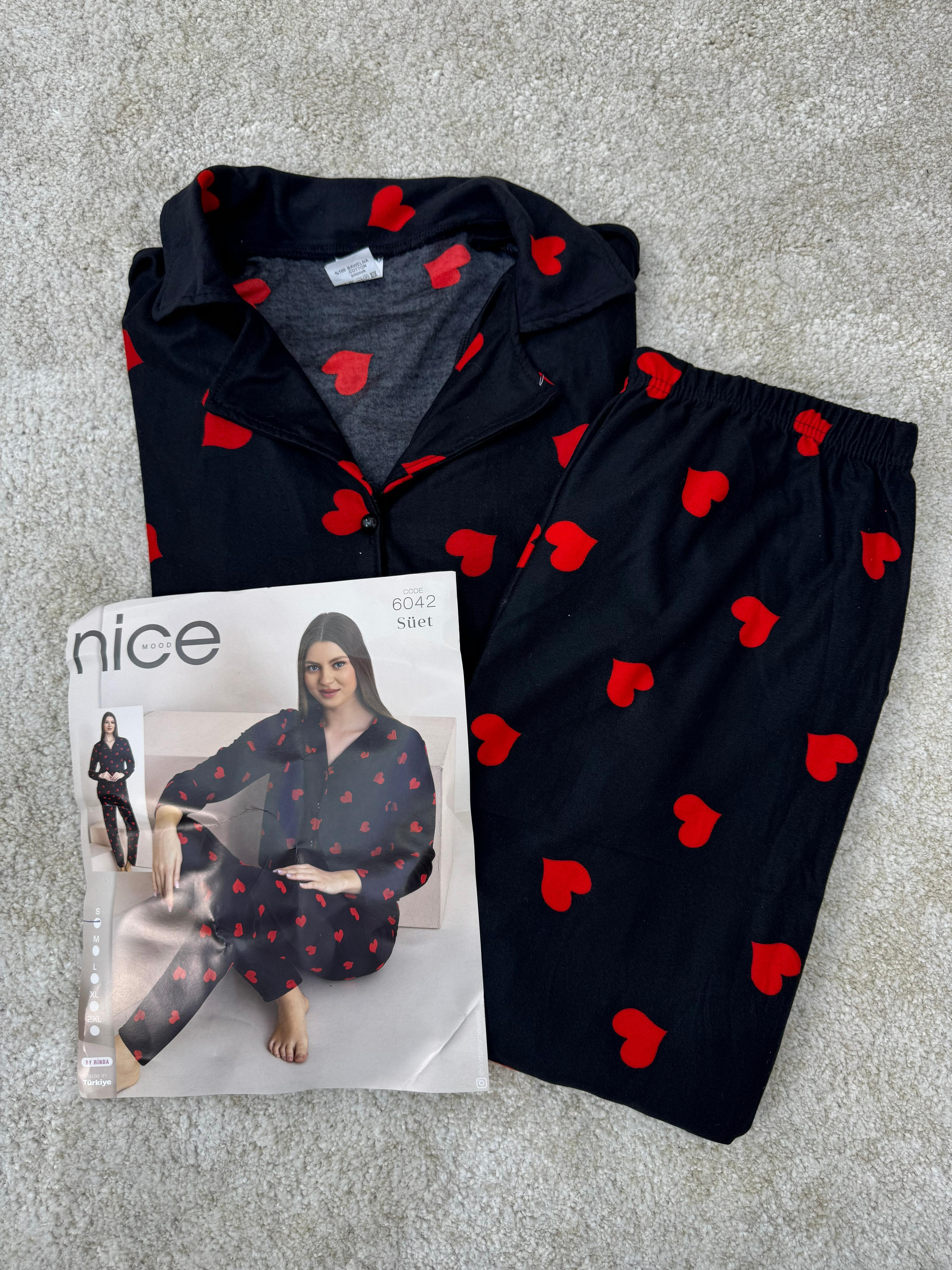 ç6042-süet kumaş gömlek yaka kalpli pijama takımı-siyah (ç6042)