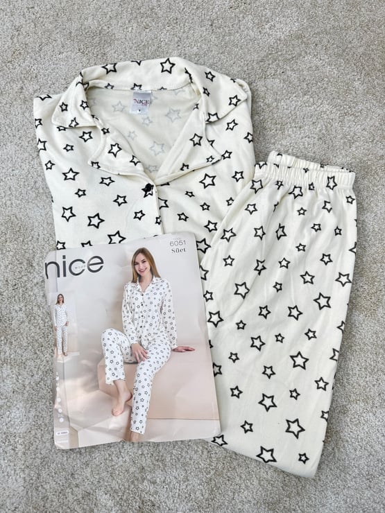 ç6051-süet kumaş gömlek yaka yıldızlı pijama takımı-beyaz (ç6051)