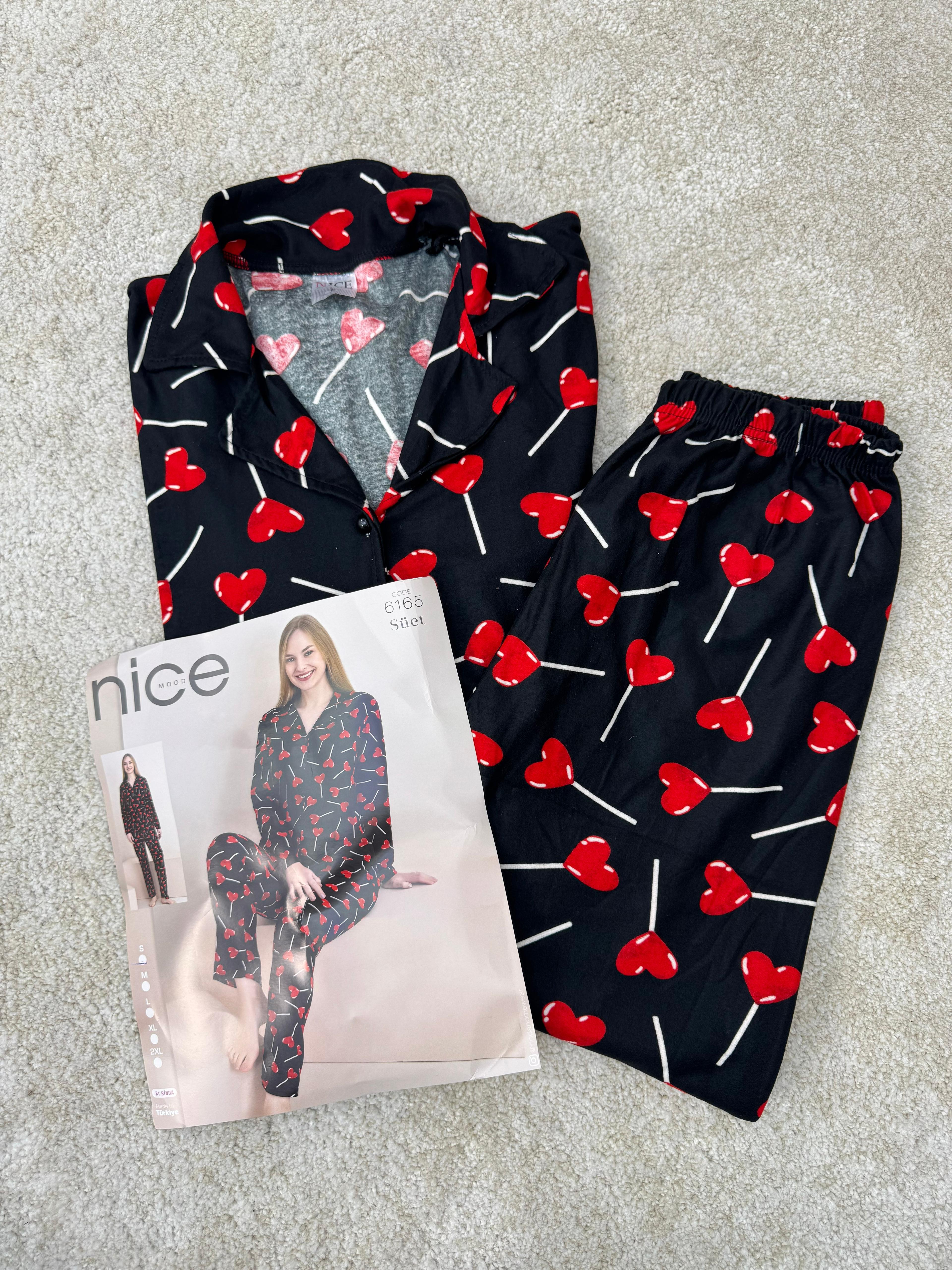 ç6165-süet kumaş gömlek yaka kalpli pijama takımı-siyah (ç6165)